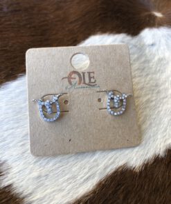 ” Adler ” Small Rhinestone Longhorn On a Horseshoe Earrings ( White )