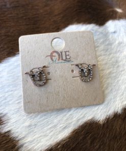 ” Adler ” Small Rhinestone Longhorn On a Horseshoe Earrings ( Copper / Champagne )
