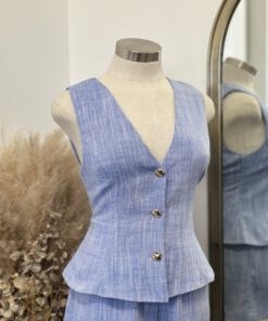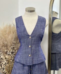 ” Isla ” Linen Gold Button Detail Vest ( Blue )