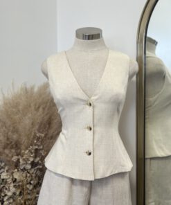 ” Isla ” Linen Gold Button Detail Vest ( Oatmeal )