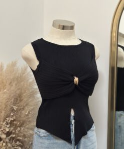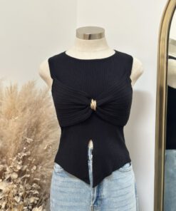 ” Marigold ” Round Neck Ruched Bust Sleeveless Knit Top ( Black )