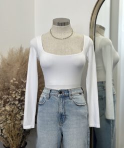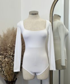 ” Pauline ” Square Neck Long Sleeve Bodysuit Top ( White )