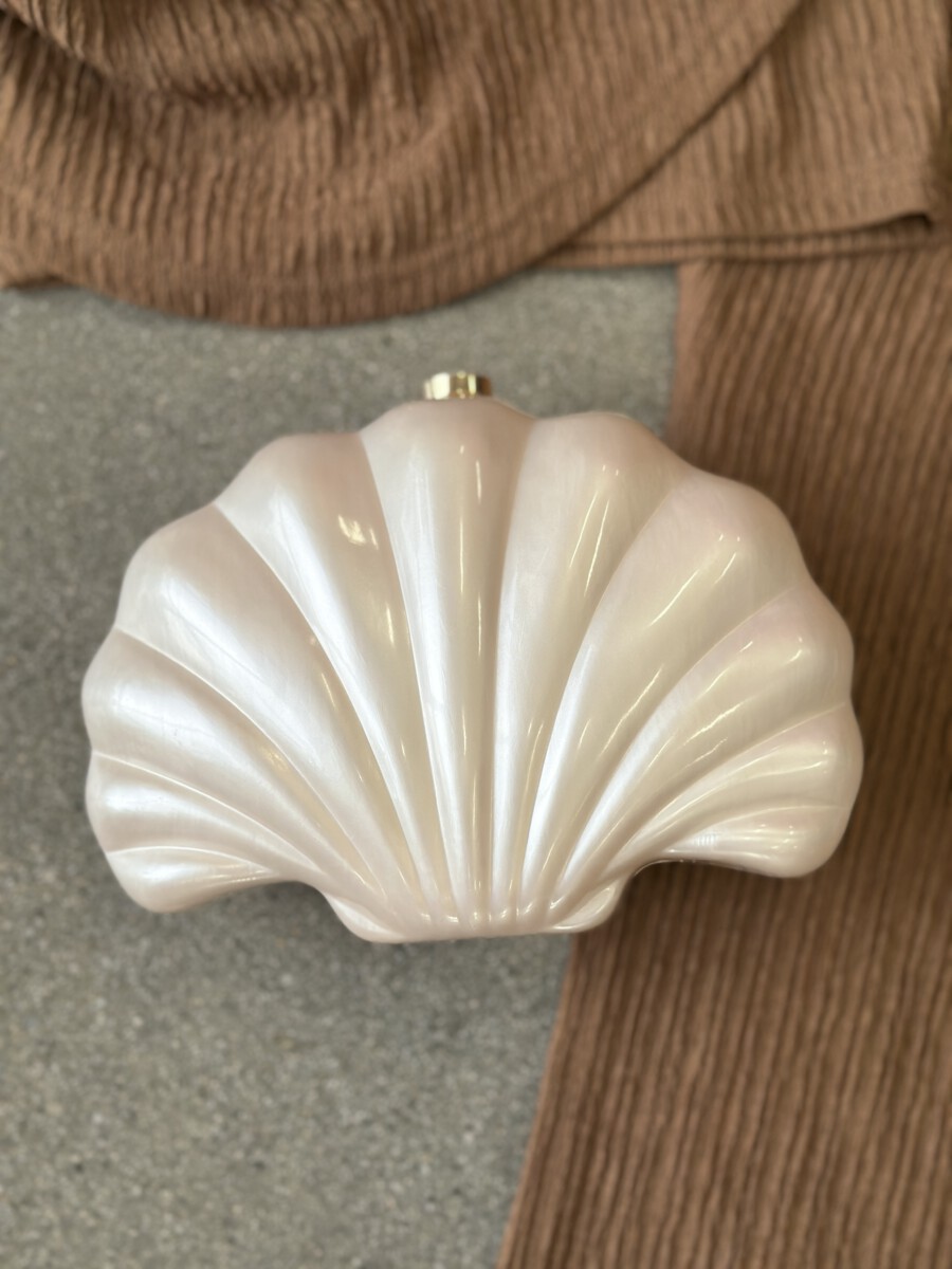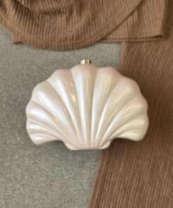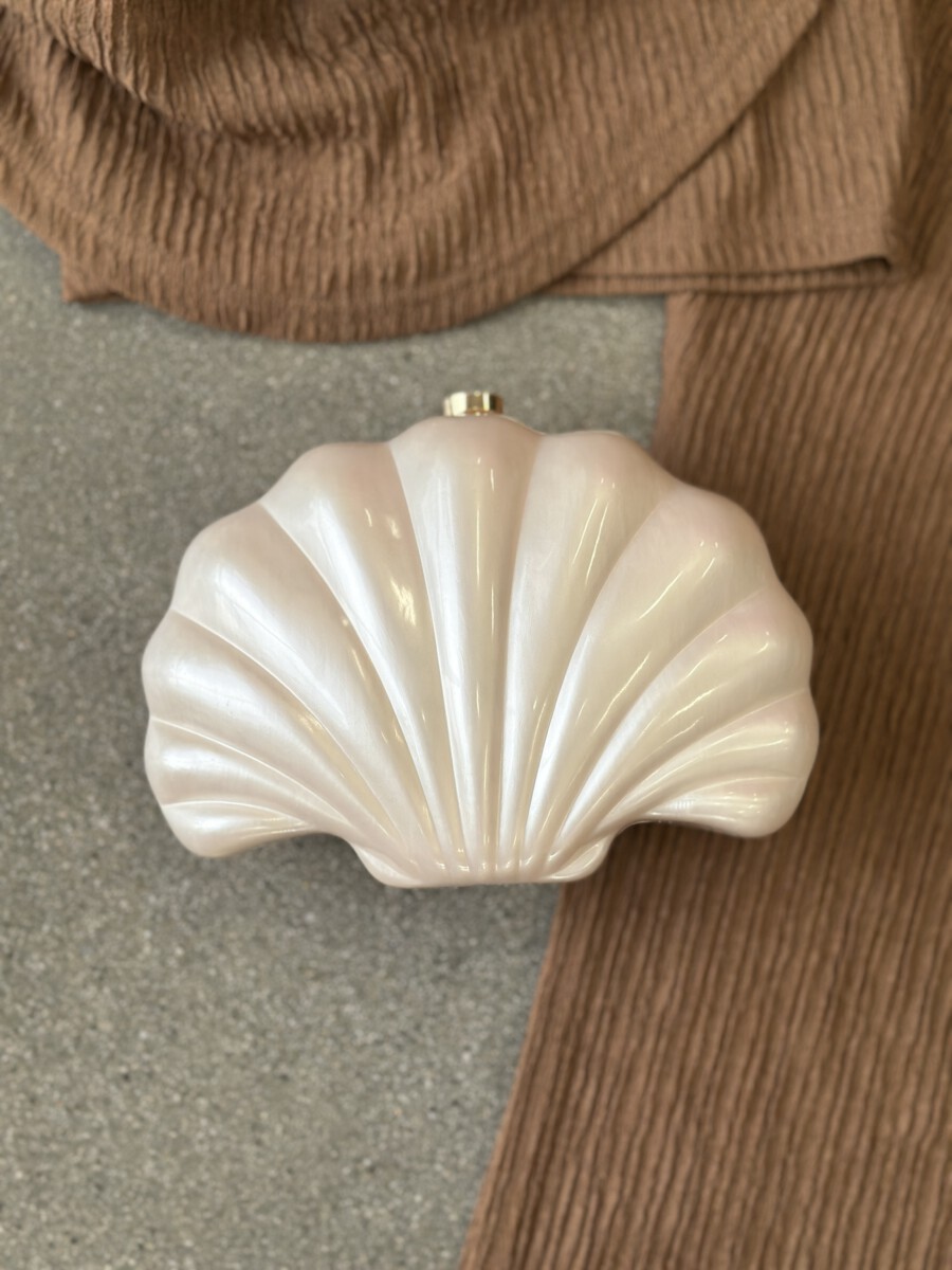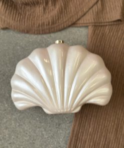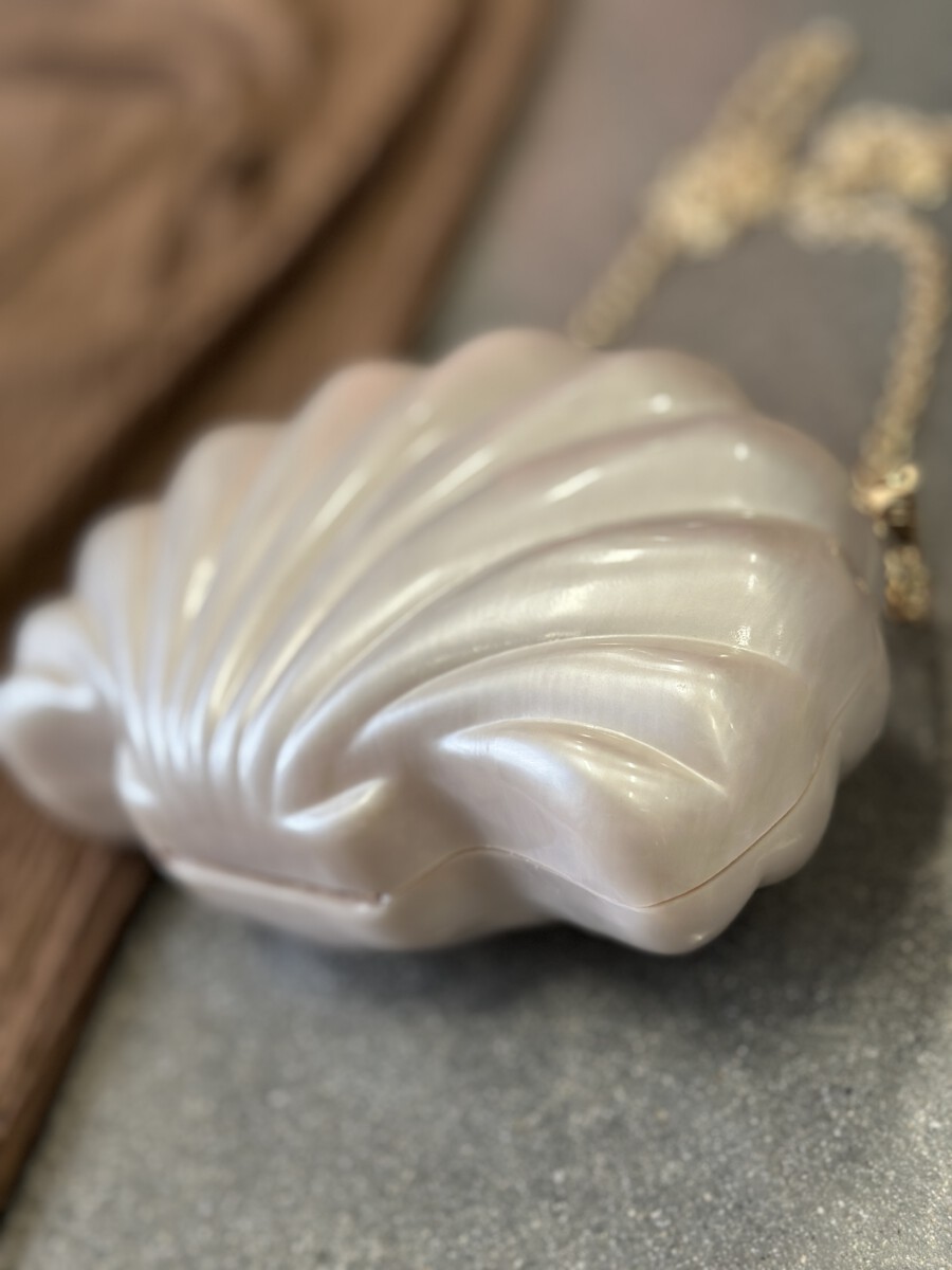 This clutch bag showcases a unique seashell pearl style. Savor the allure of detailed craftsmanship in this exquisite clutch bag. THIS CLUTCH BAG APPROXIMATELY MEASURES: LENGTH: 8 INCHES DEPTH: 2 INCHES HEIGHT: 6.5 INCHES 90% PLASTIC 10% ALLOY
