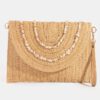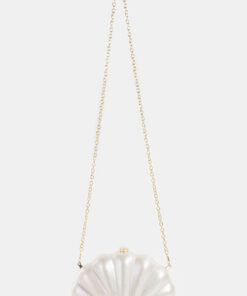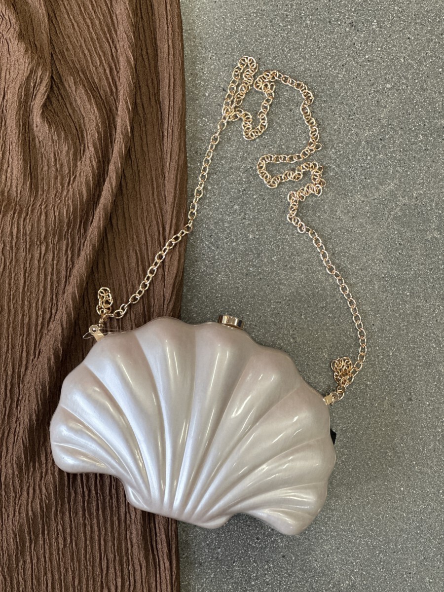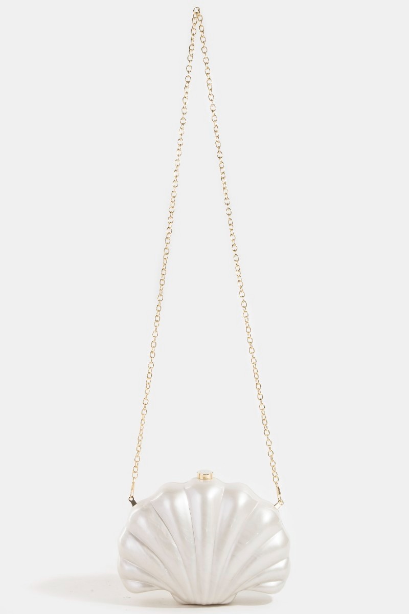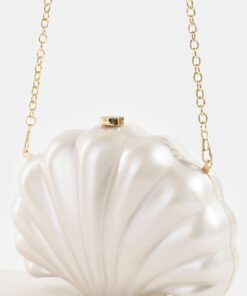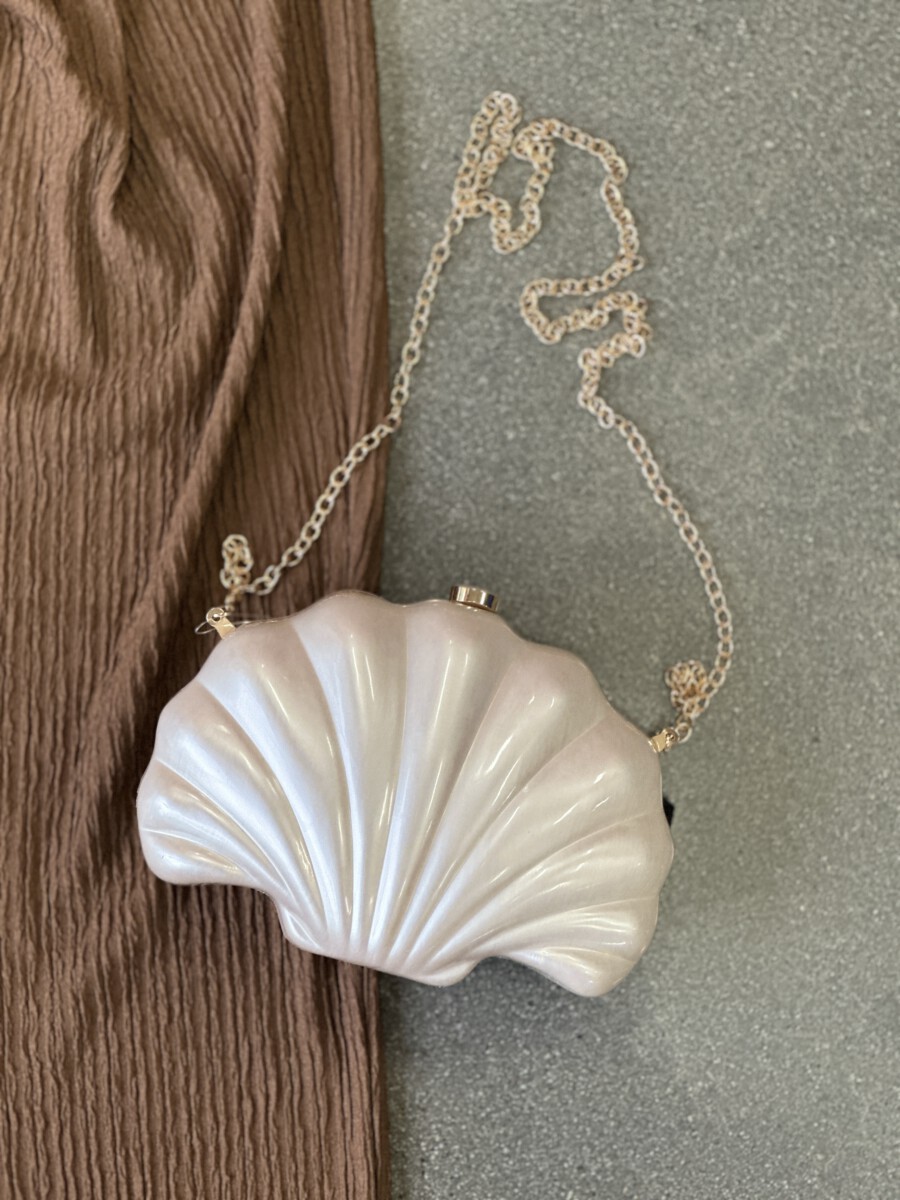 This clutch bag showcases a unique seashell pearl style. Savor the allure of detailed craftsmanship in this exquisite clutch bag. THIS CLUTCH BAG APPROXIMATELY MEASURES: LENGTH: 8 INCHES DEPTH: 2 INCHES HEIGHT: 6.5 INCHES 90% PLASTIC 10% ALLOY