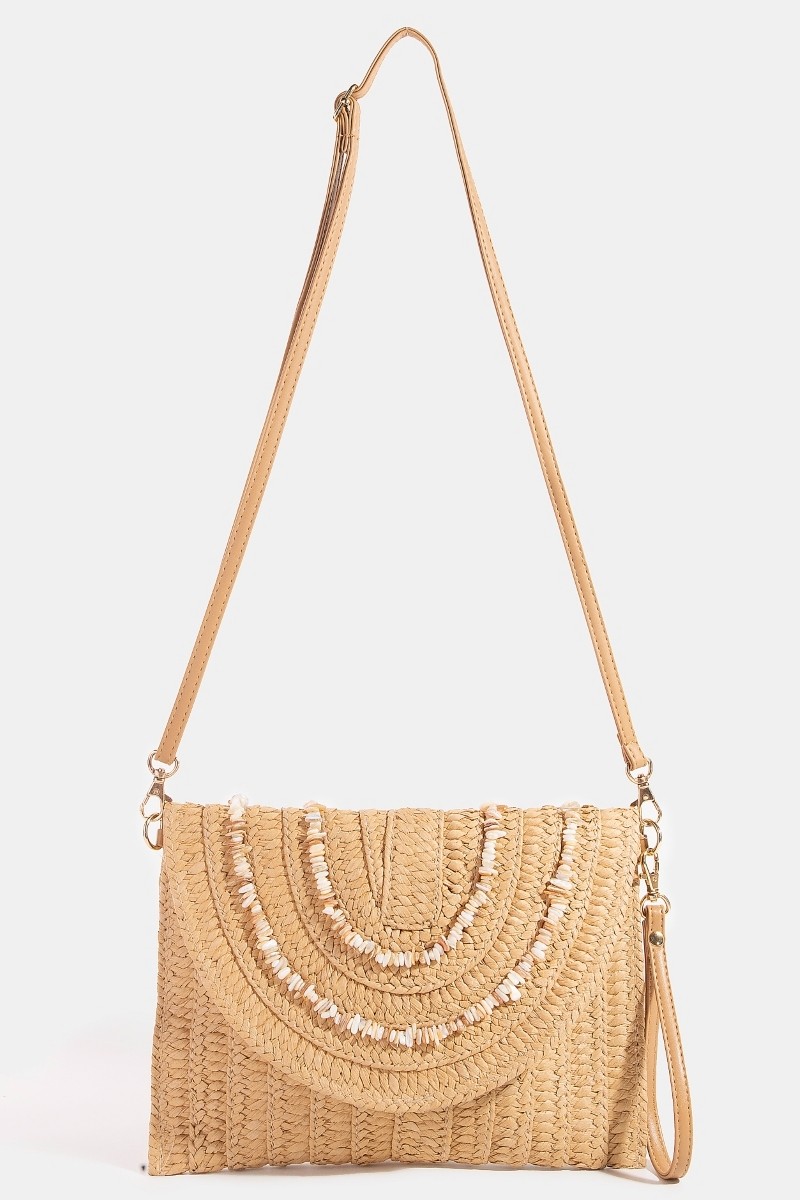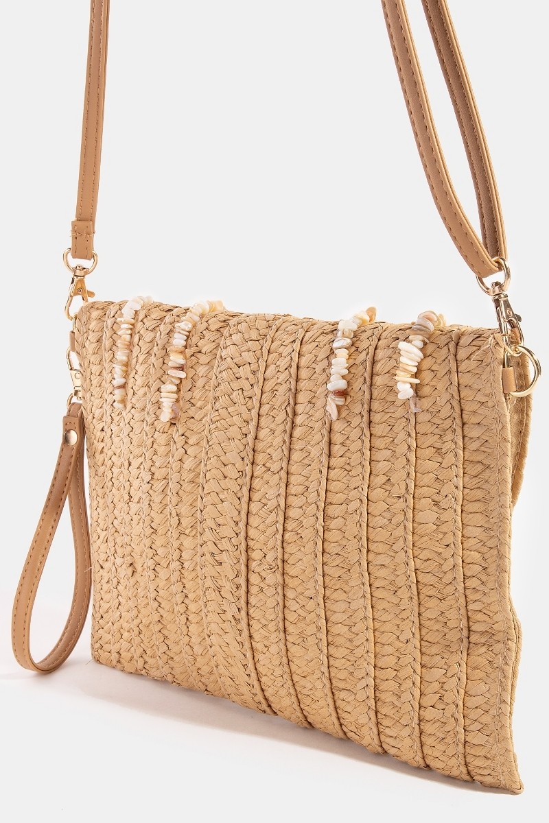 This clutch bag displays a fashionable shell beaded accent paper woven envelope style.