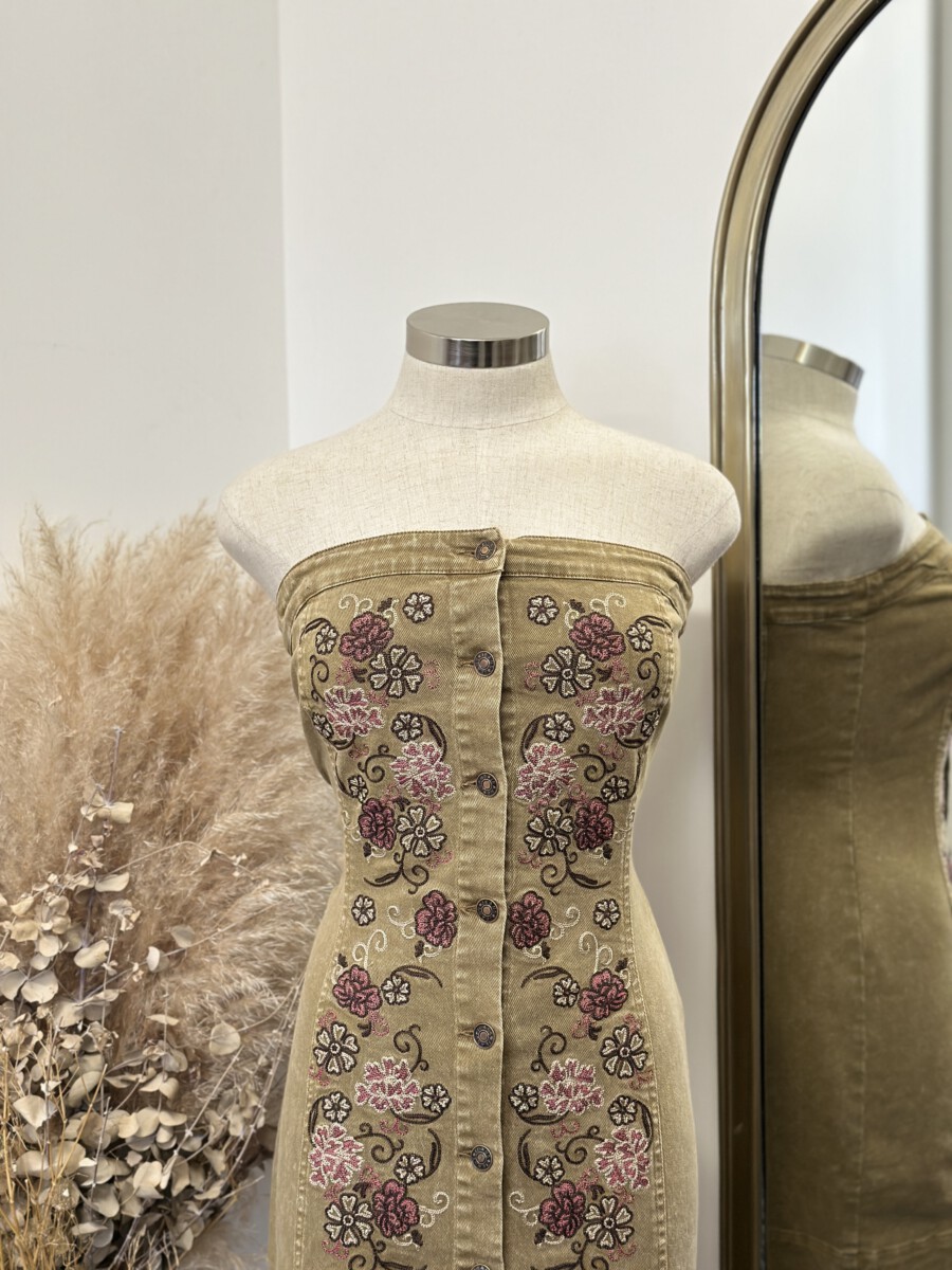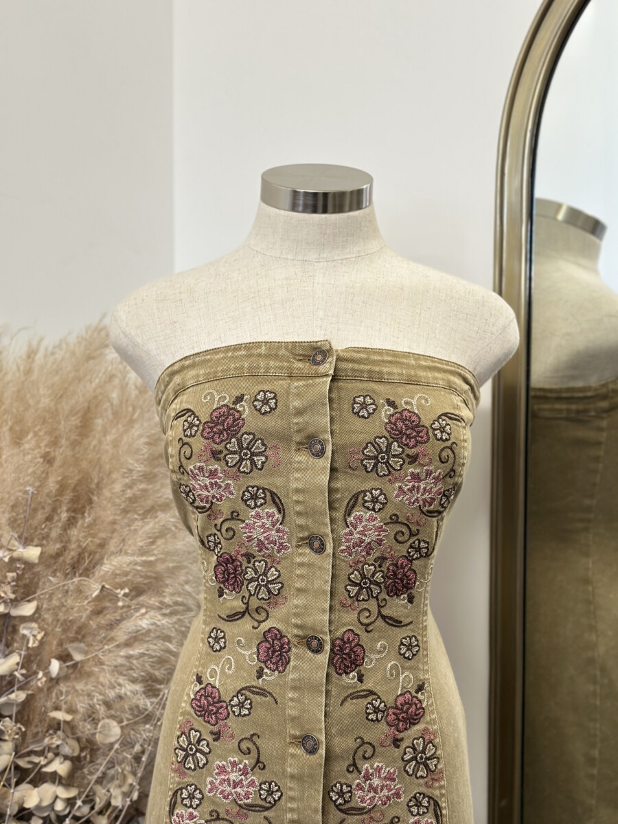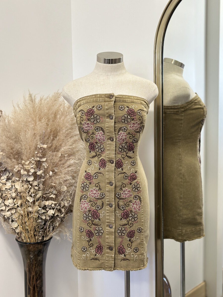 ” Arizona ” Embroidered Button Up Tube Denim Dress ( Washed Taupe )