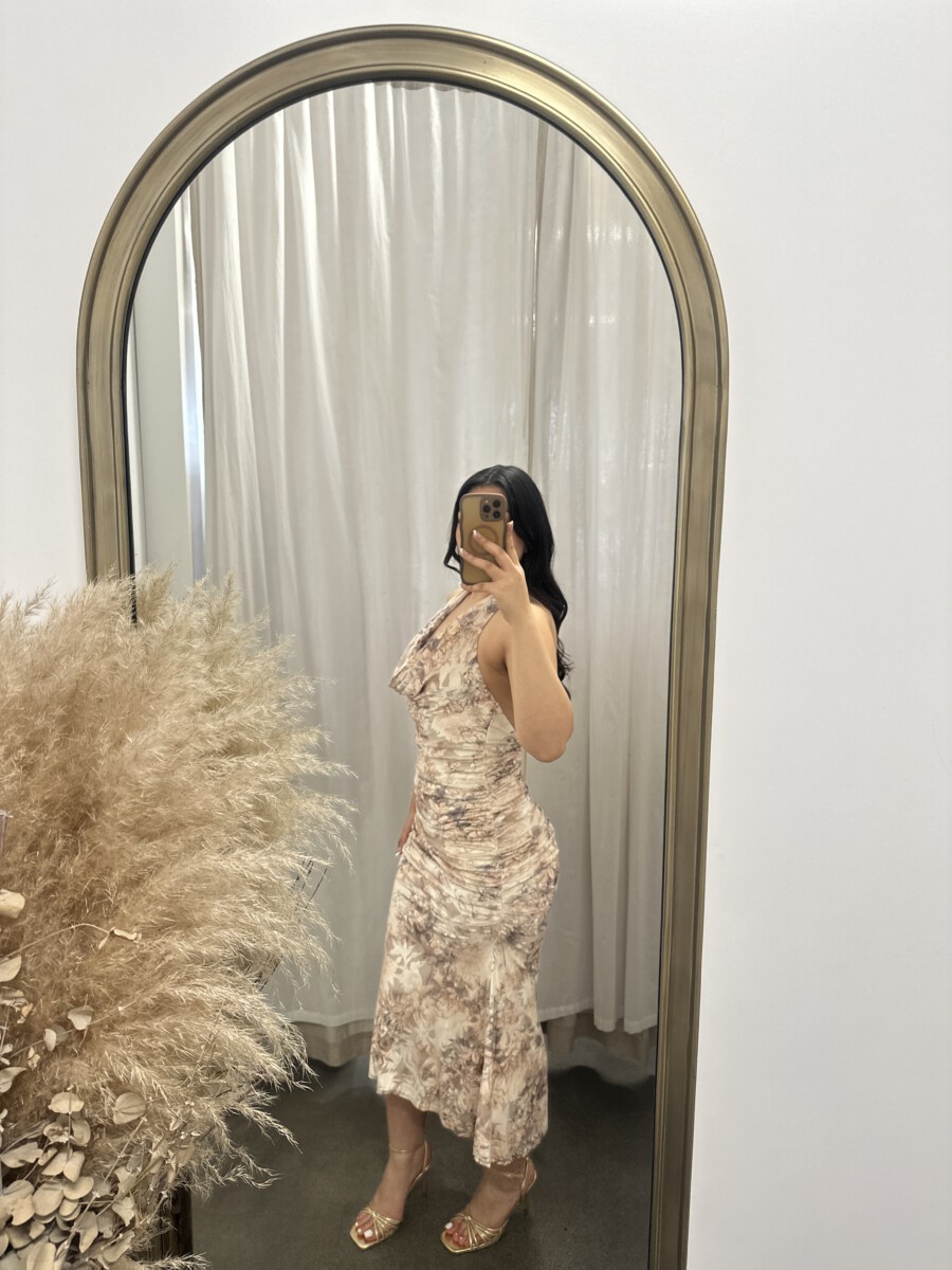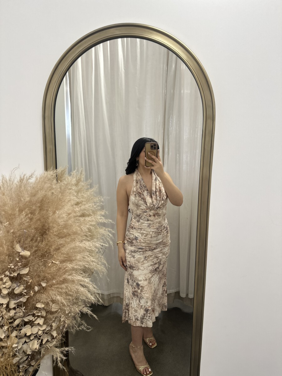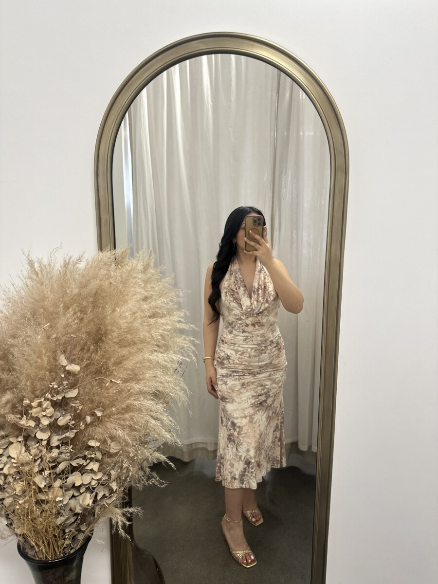 ” Azura ” Halter Cowl Neck Midi Dress ( Taupe / Multi )