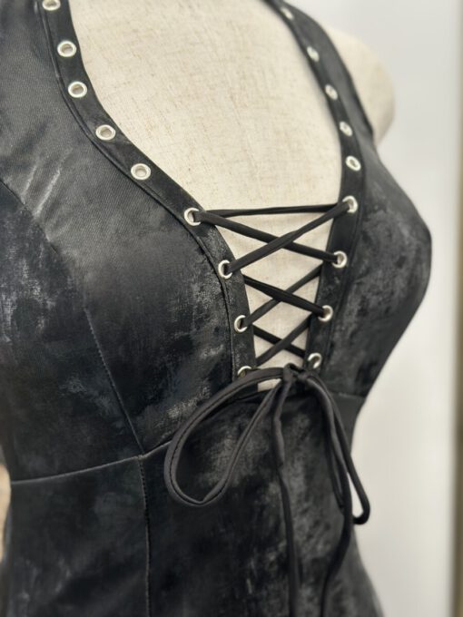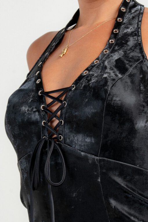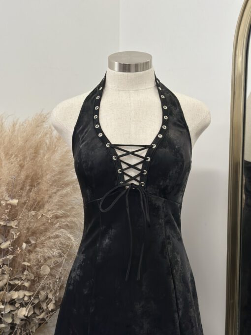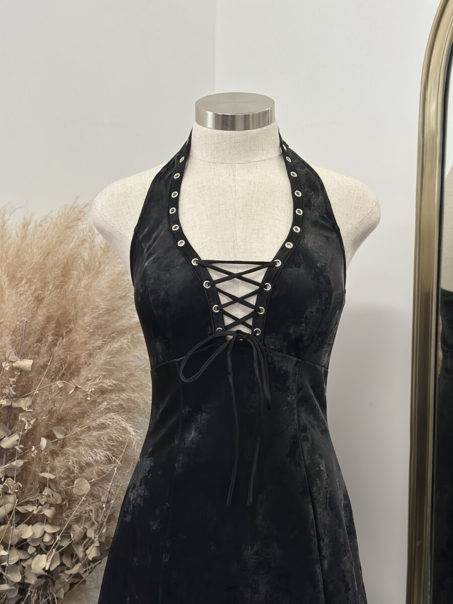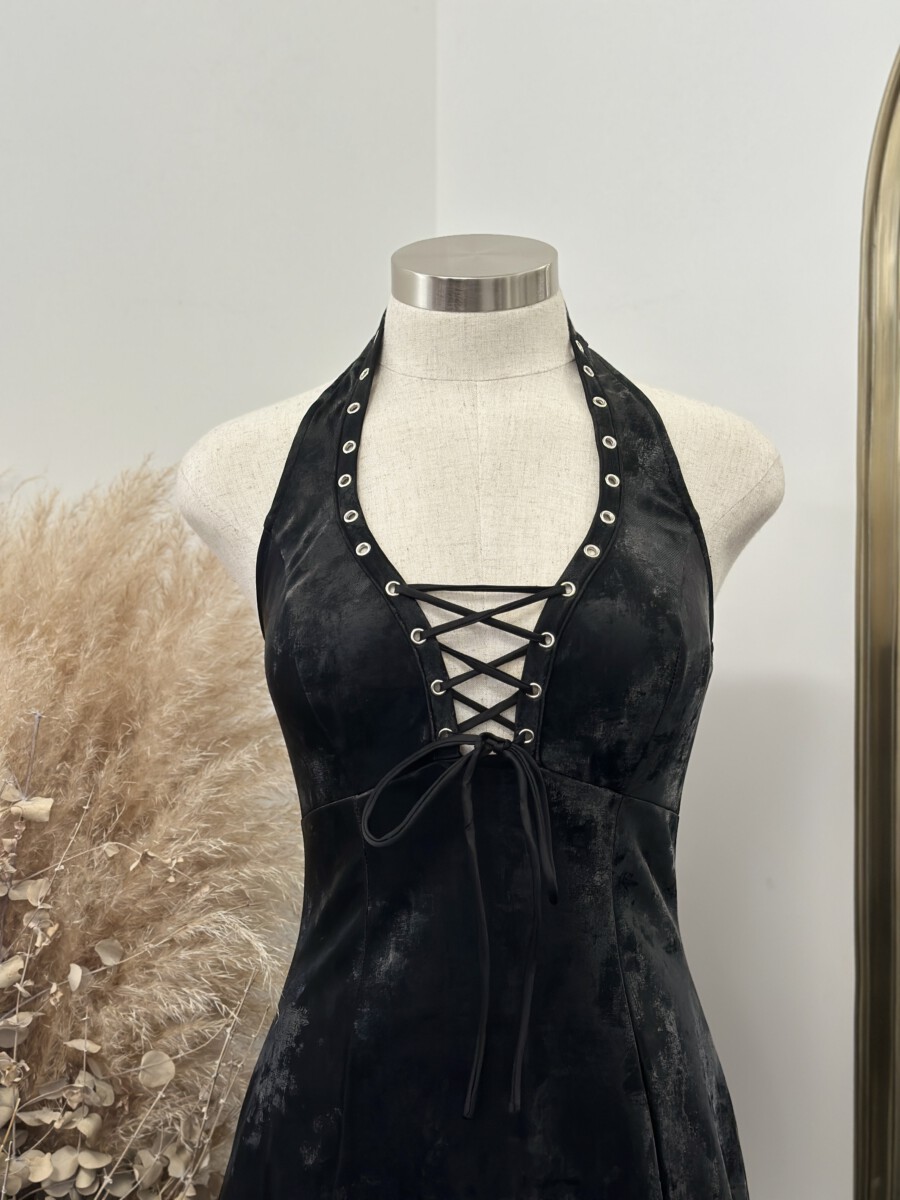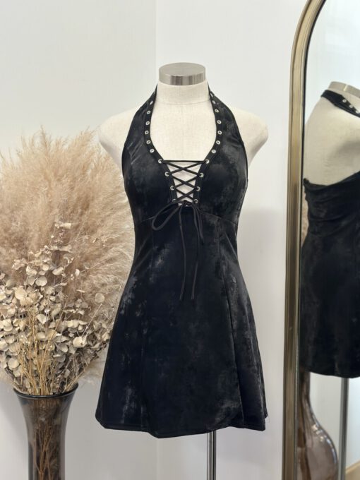 ” Blossom ” Front Lace Up Halter Flare Mini Dress ( Black )