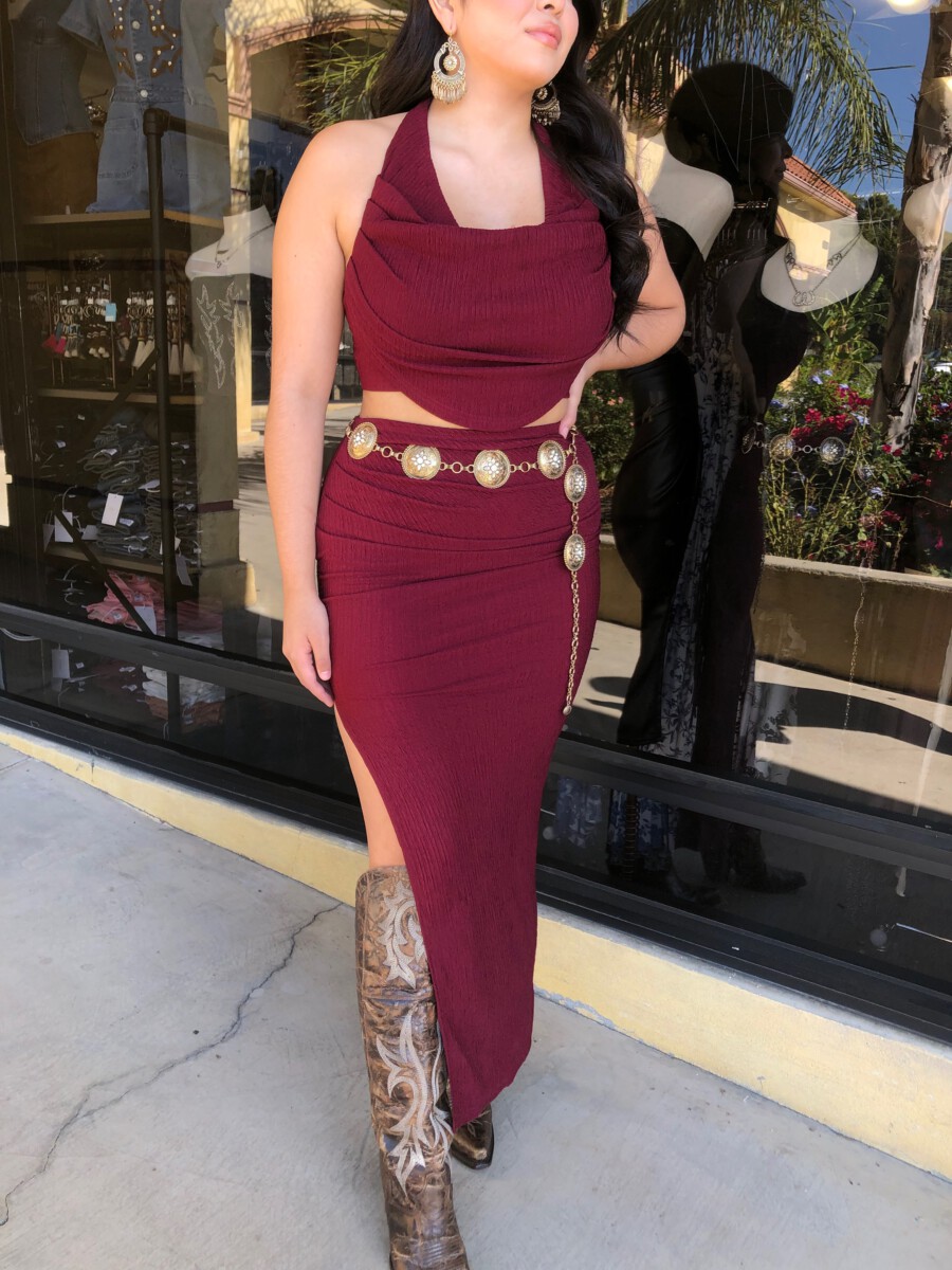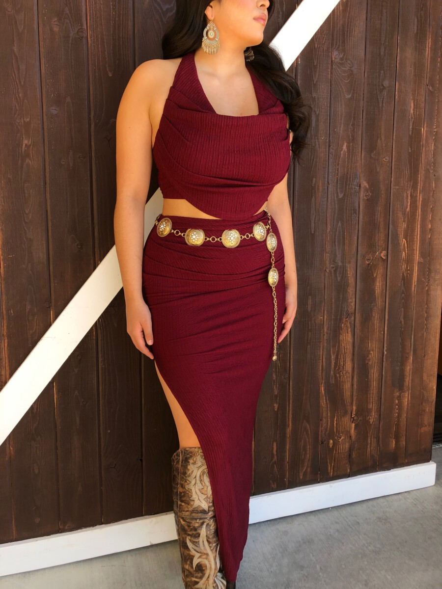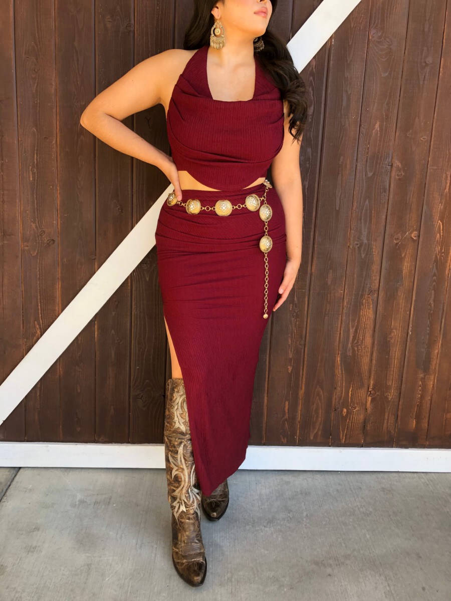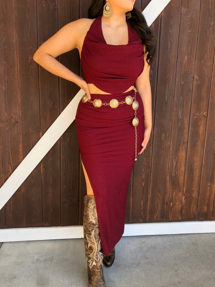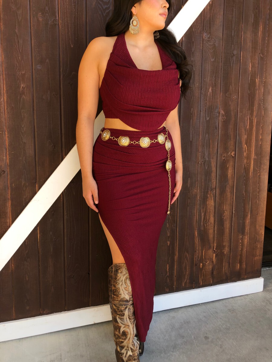 ” Elara ” Cowl Neck Top & Side Slit Maxi Skirt Set ( Wine )