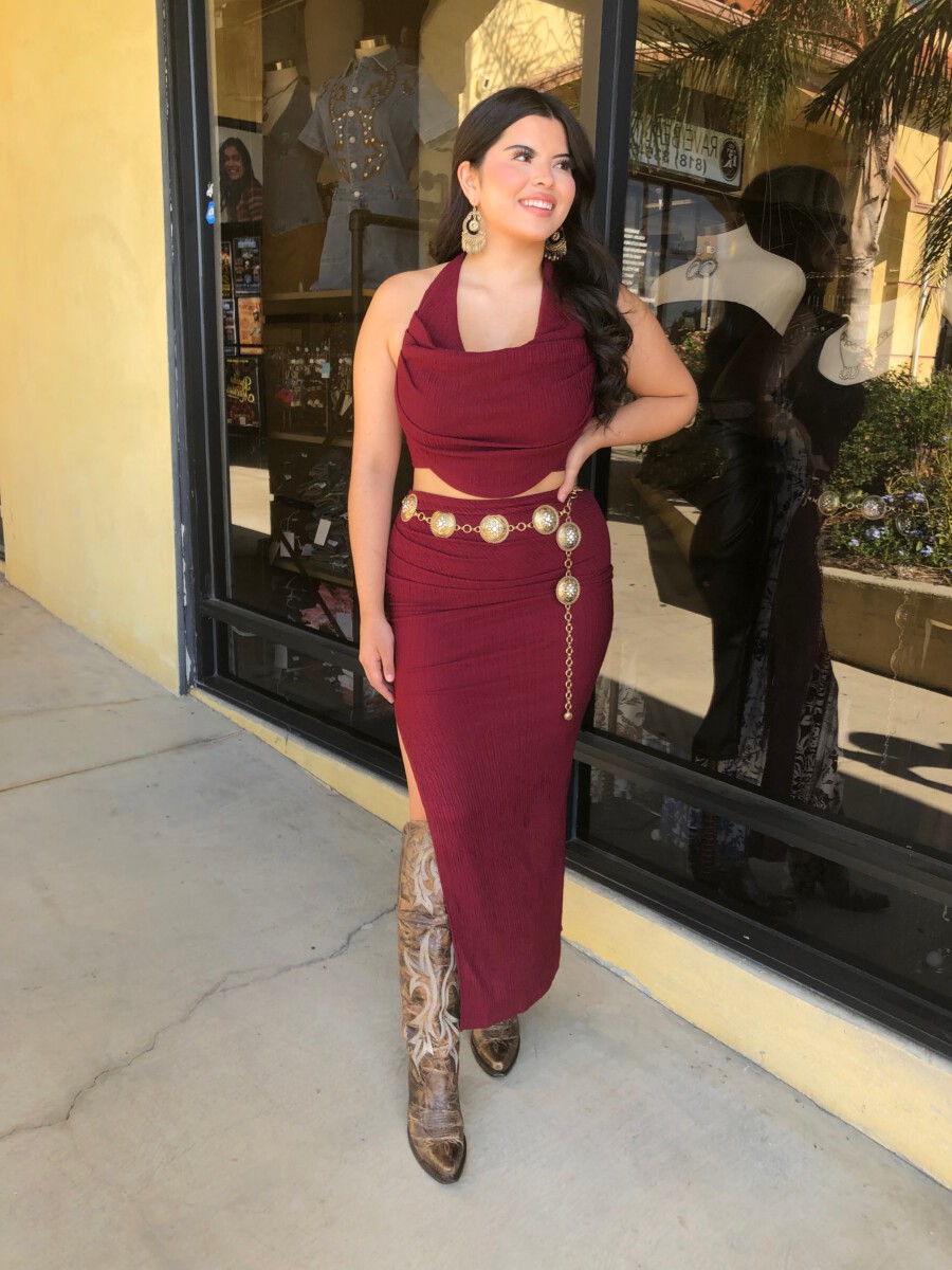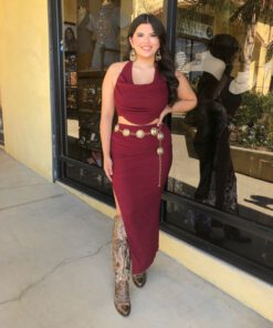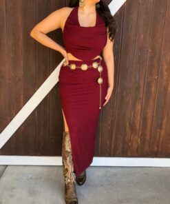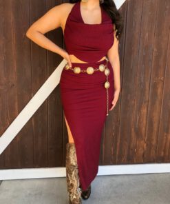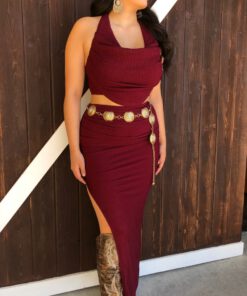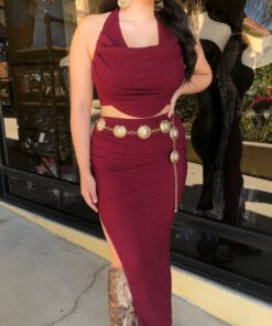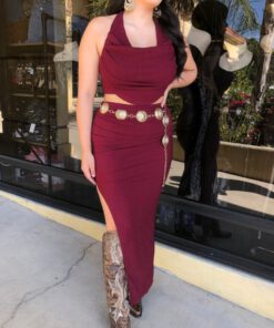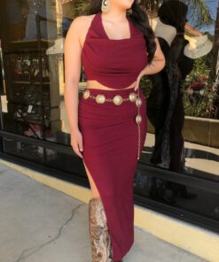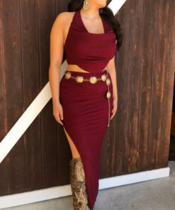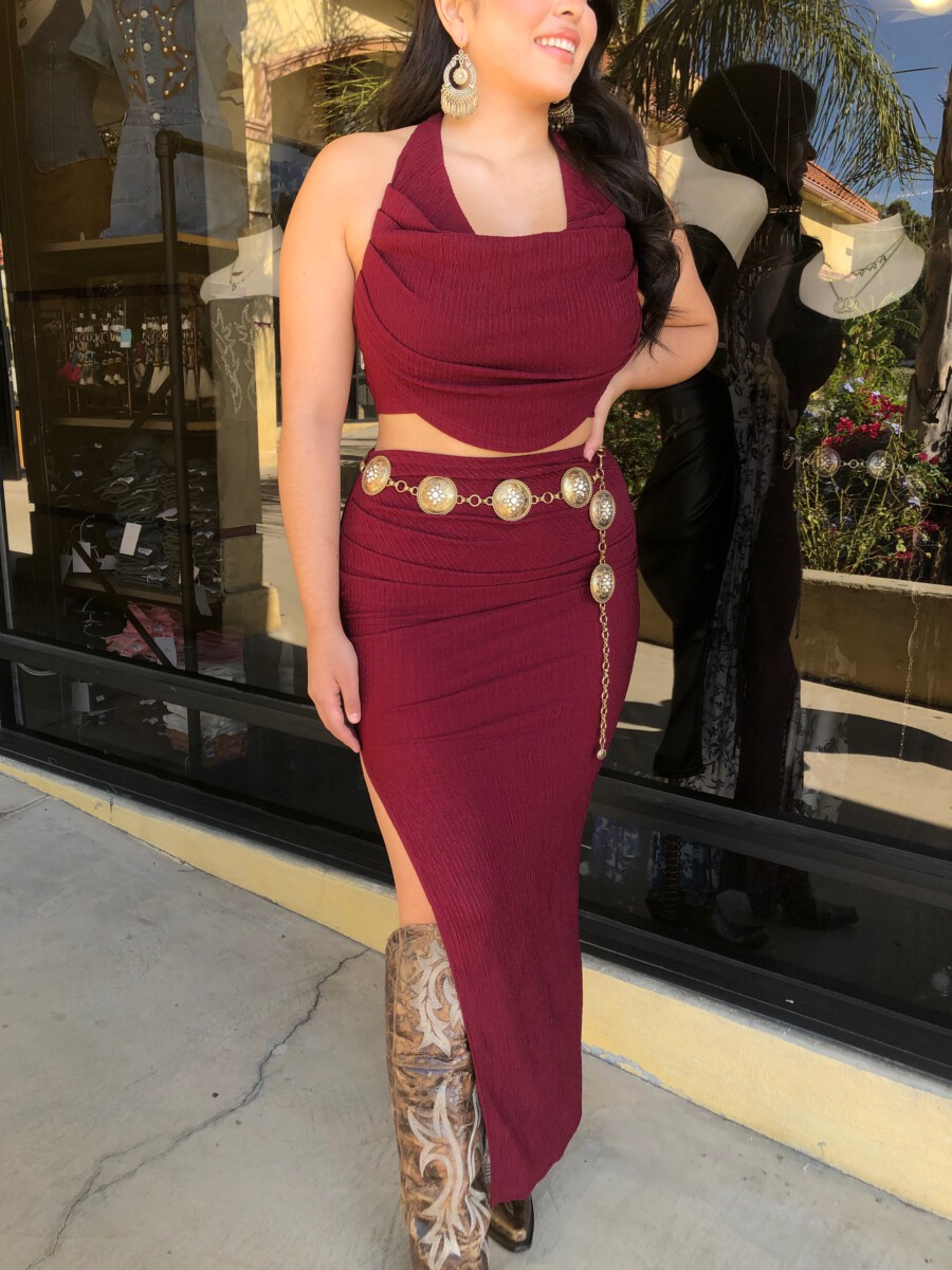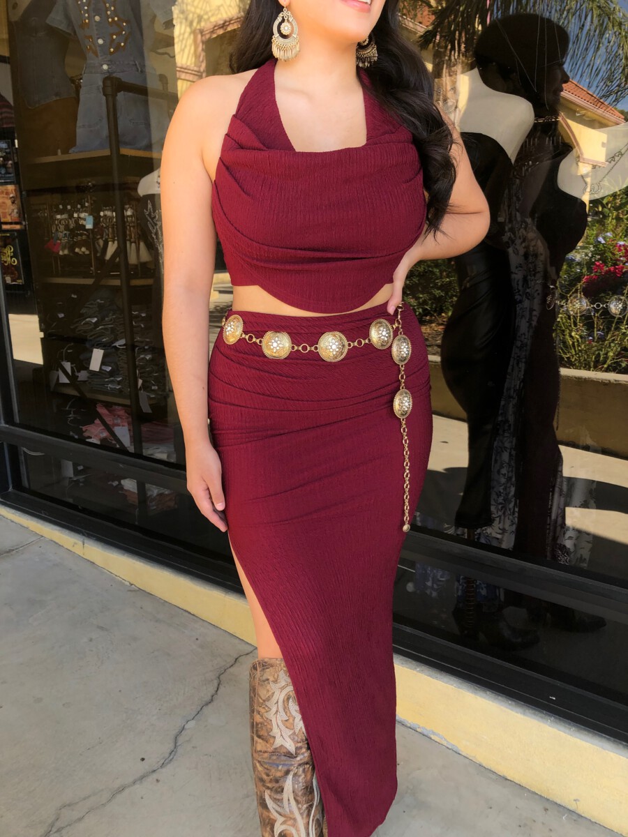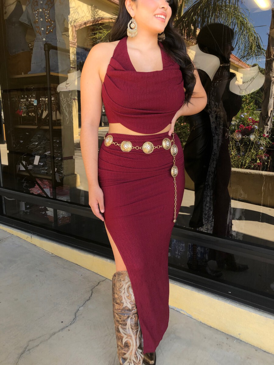 ” Elara ” Cowl Neck Top & Side Slit Maxi Skirt Set ( Wine )