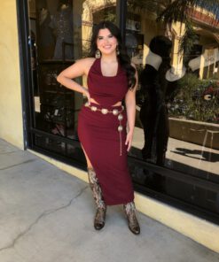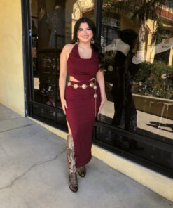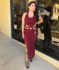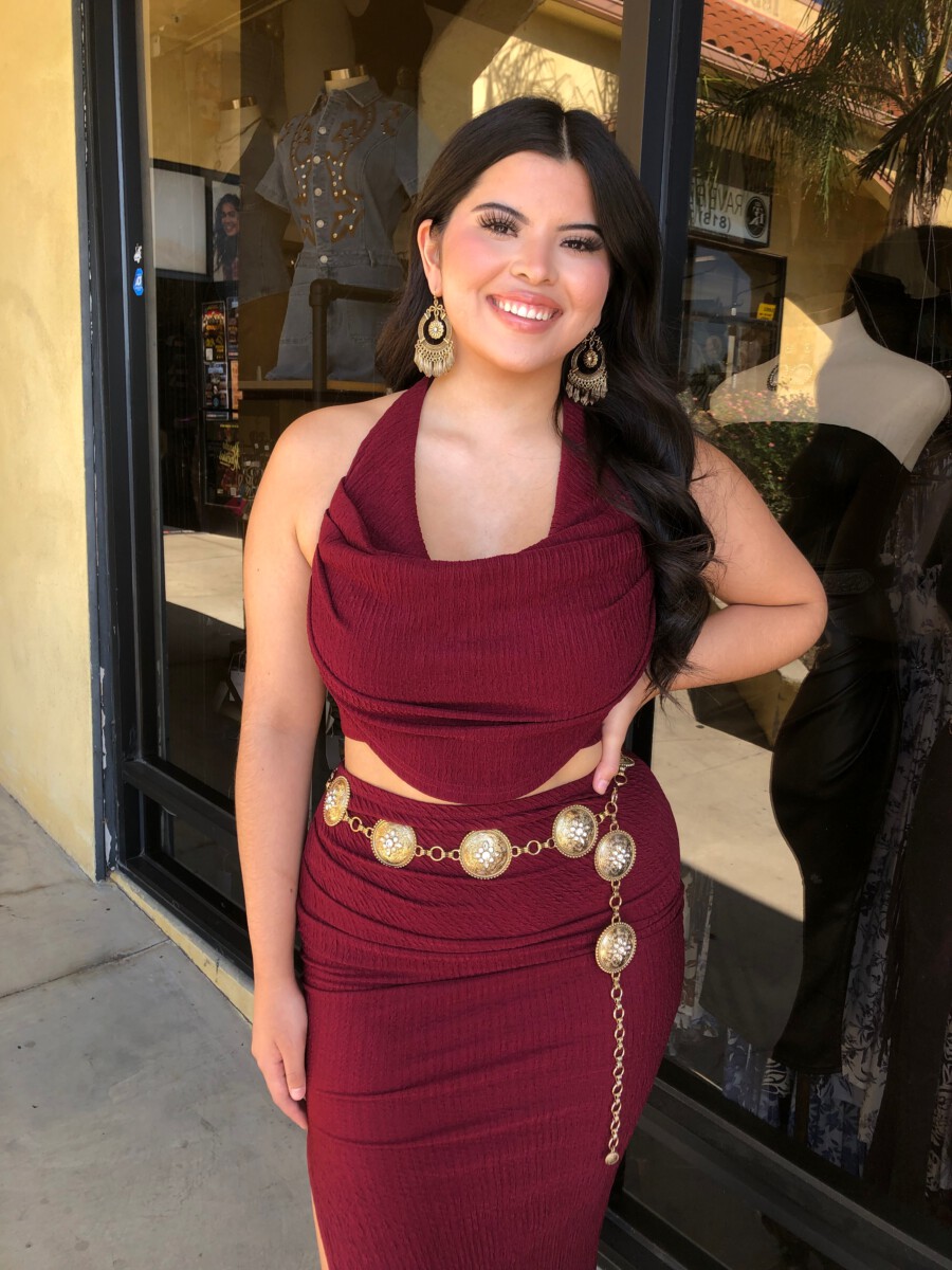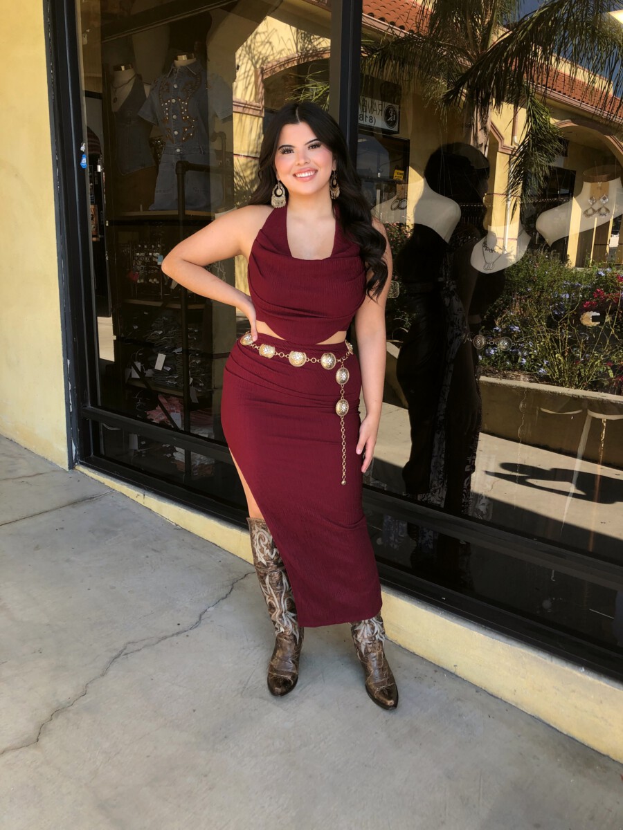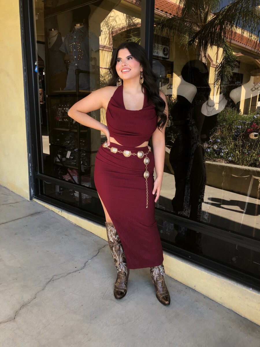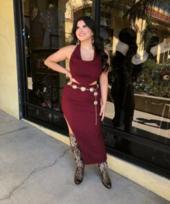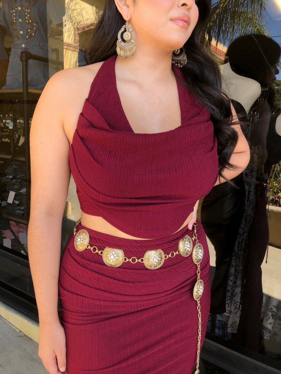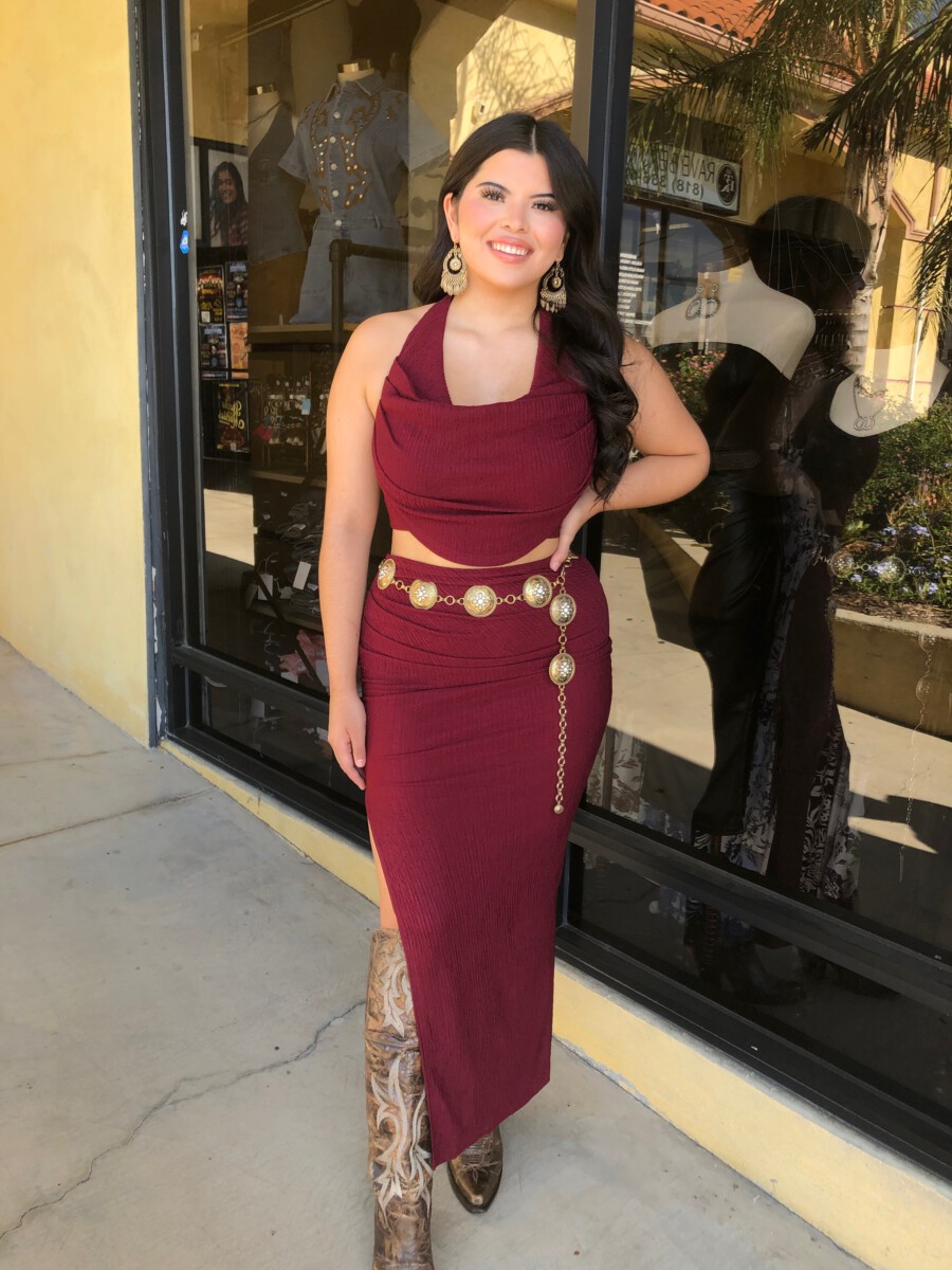 ” Elara ” Cowl Neck Top & Side Slit Maxi Skirt Set ( Wine )