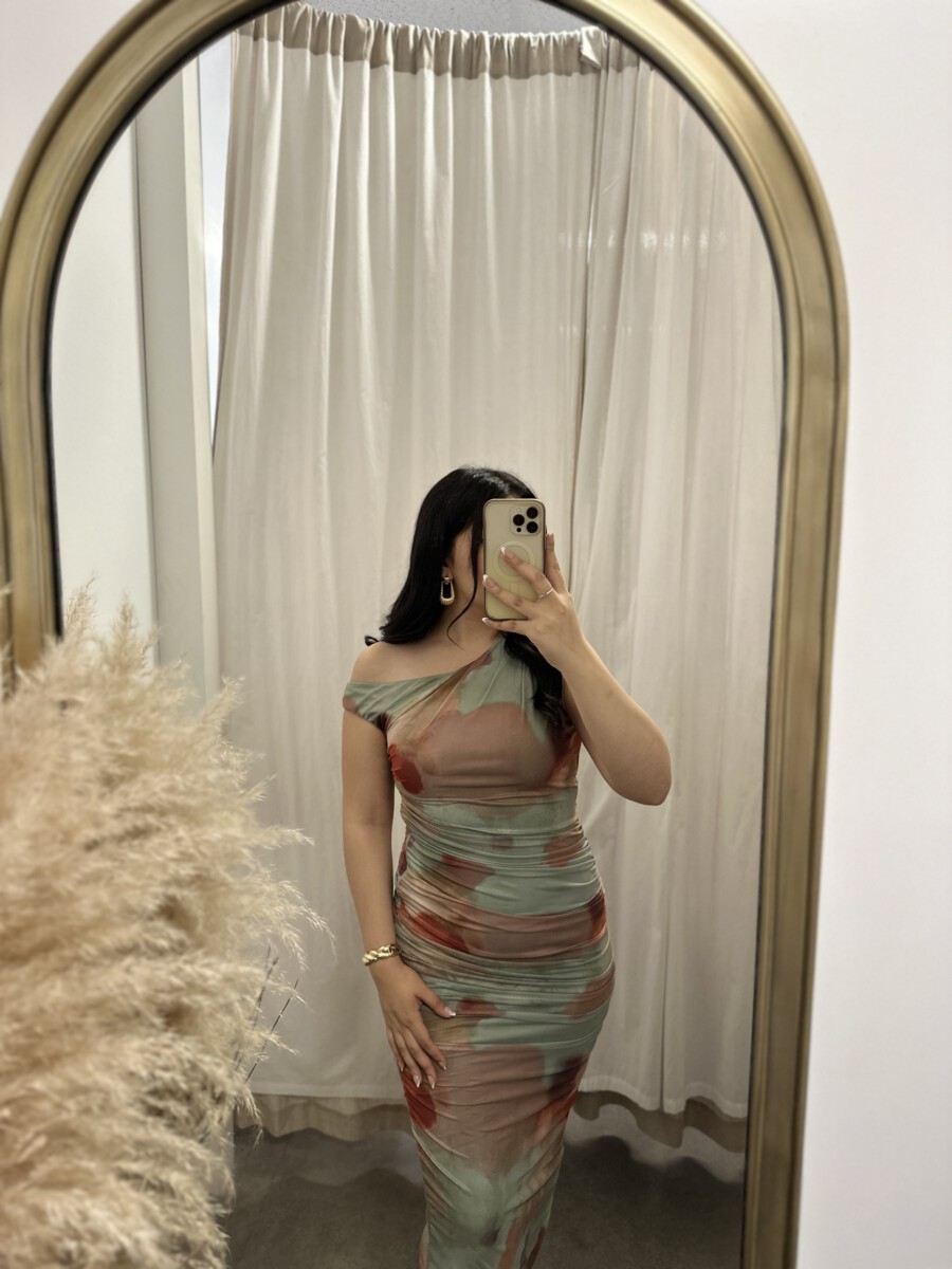 ” Harlyn ” Asymmetrical Neck Mesh Maxi Dress ( Mint / Mix )