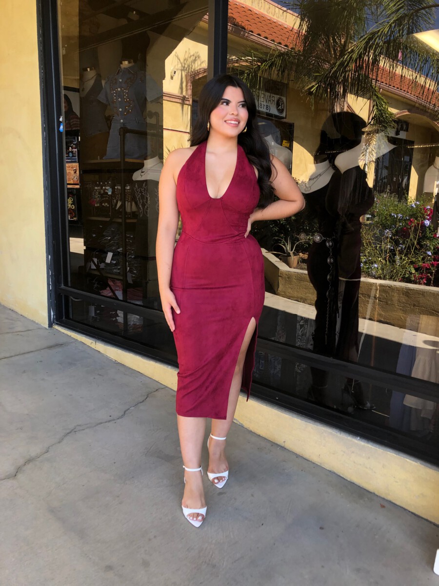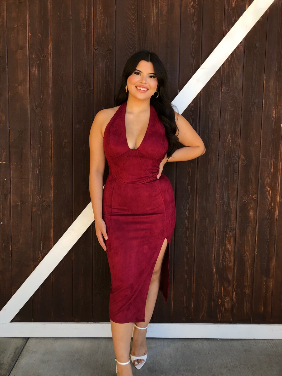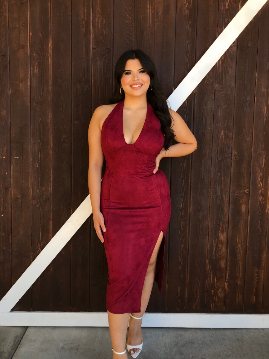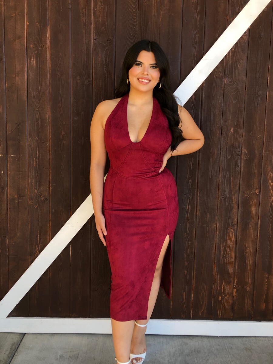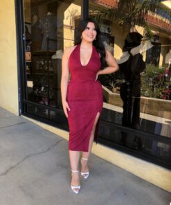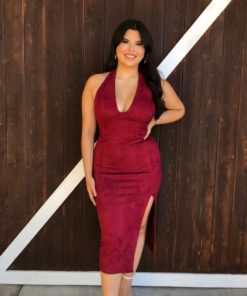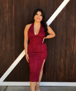” Jamila ” Faux Suede Halter Dress Midi Dress ( Wine )