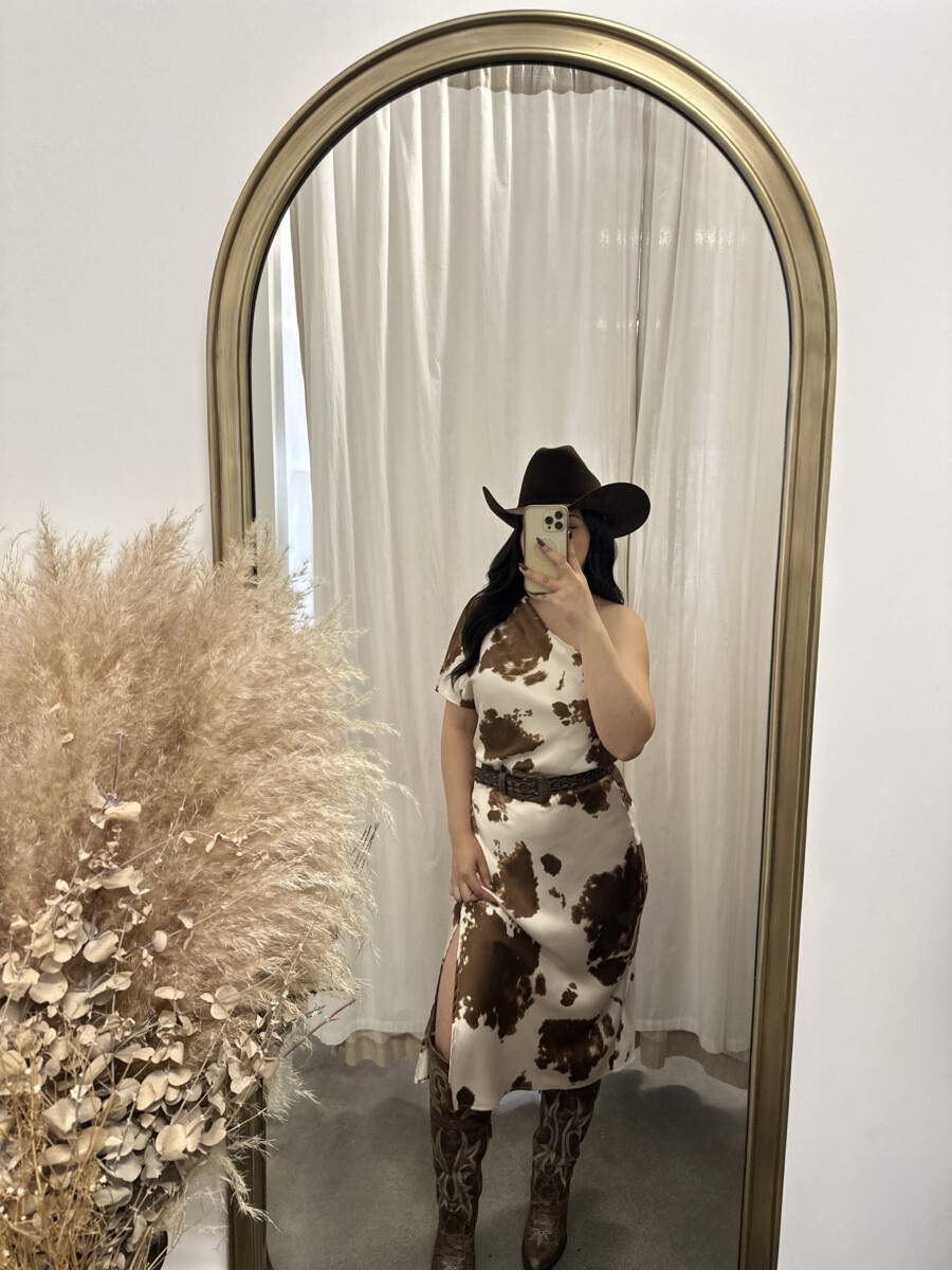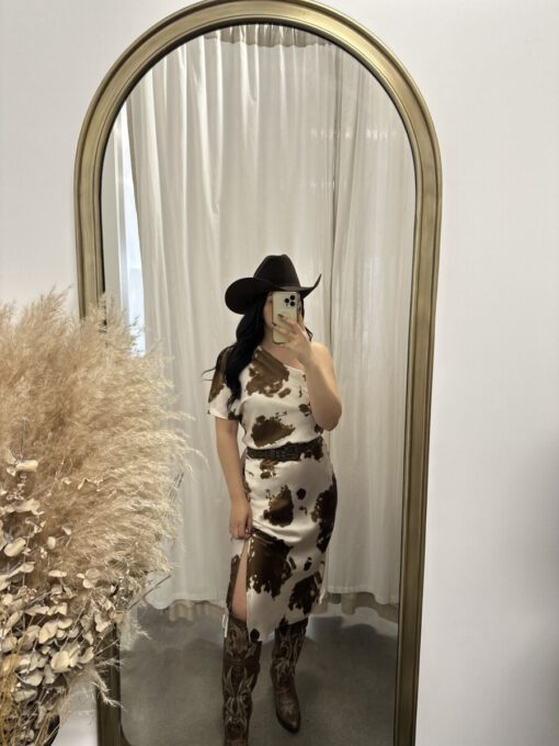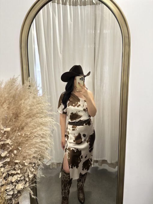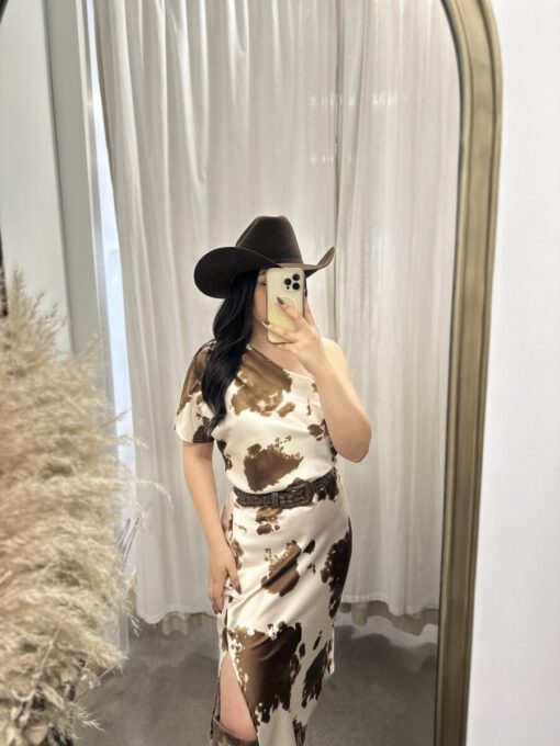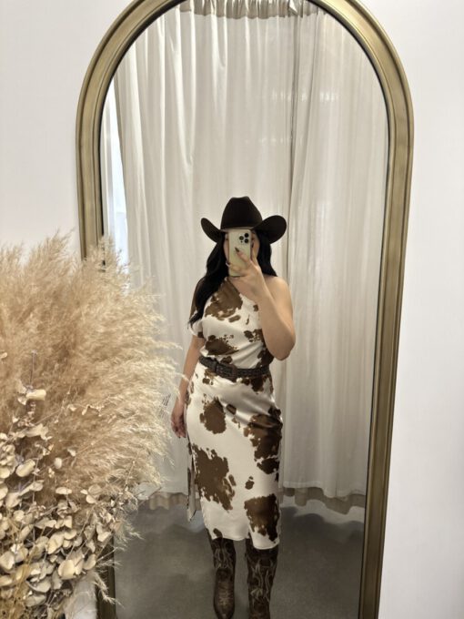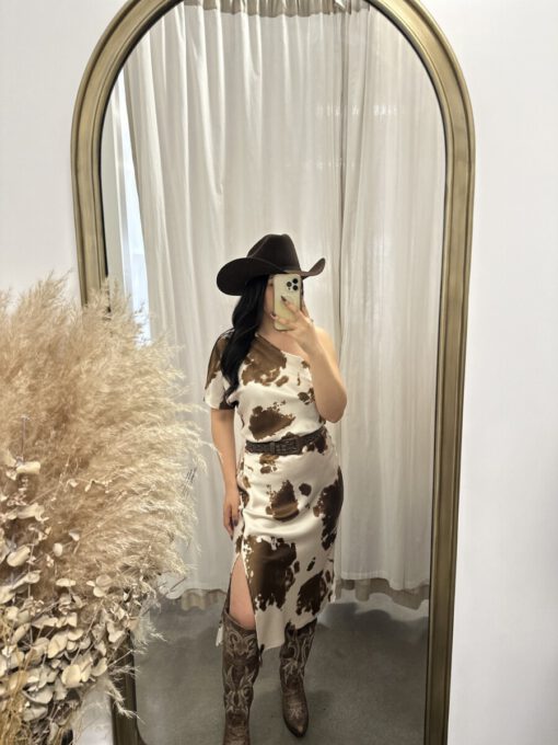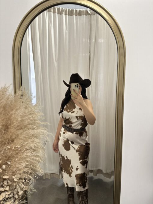 ” Lillian ” Cow Print One Shoulder Midi Satin Dress ( Brown )