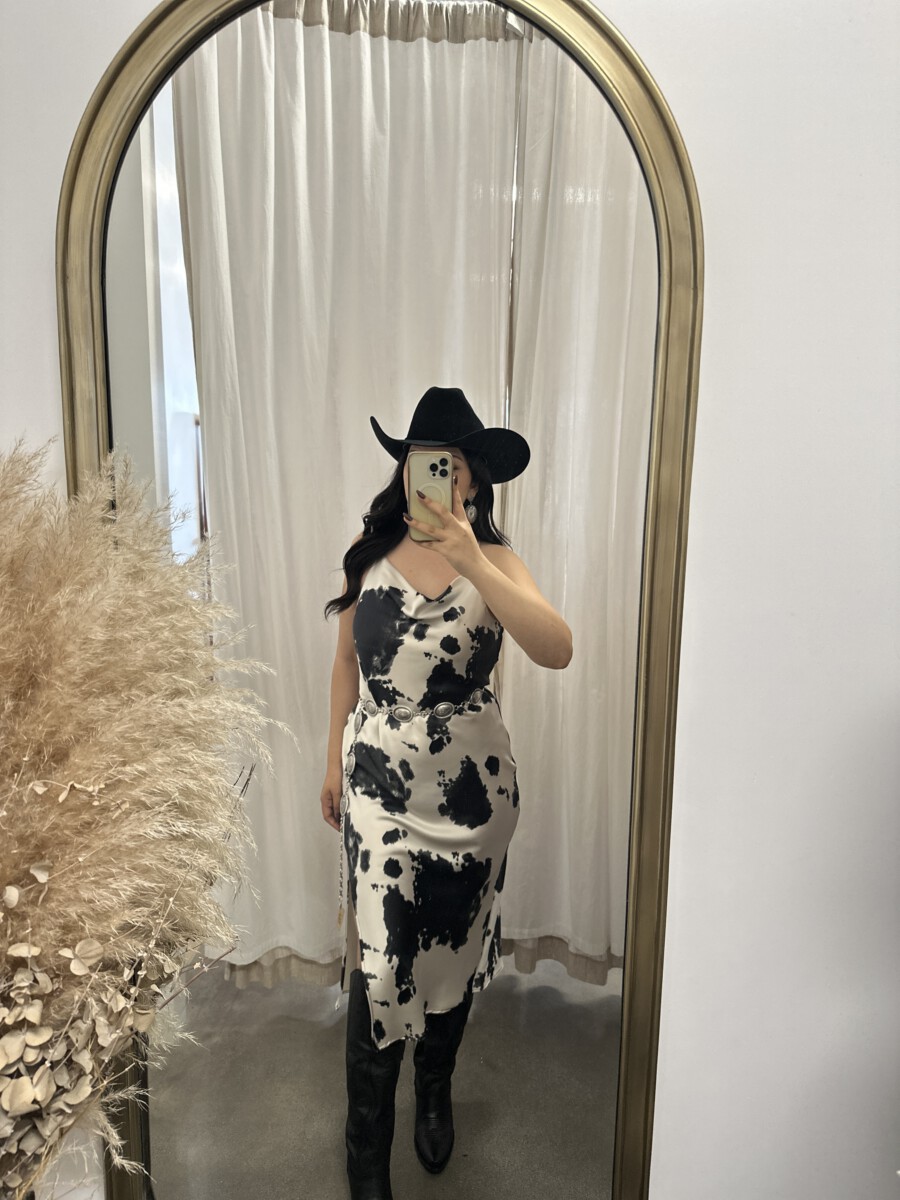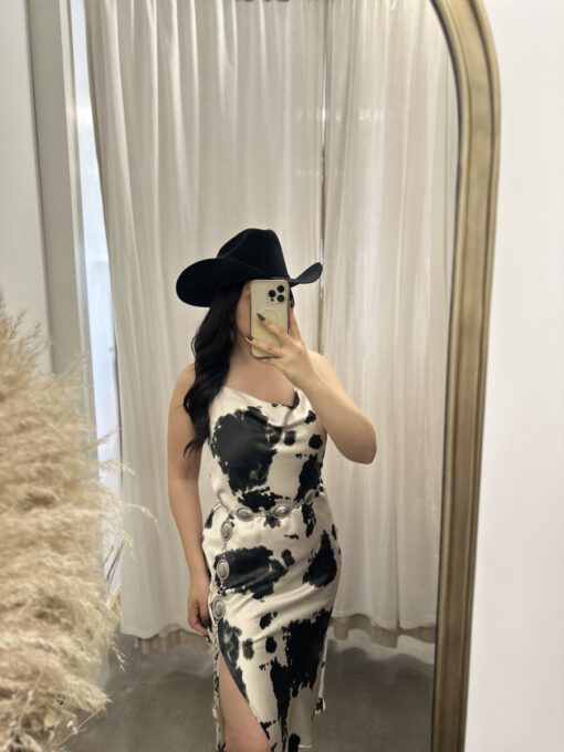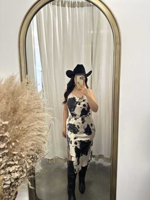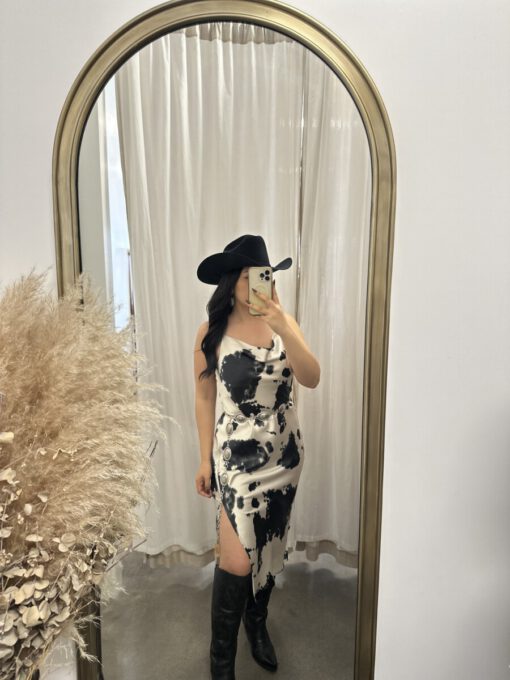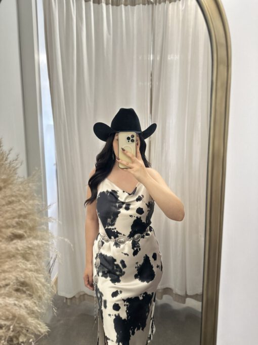 ” Lillian ” Cow Print Satin Spaghetti Strap Midi Dress ( Black )