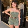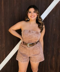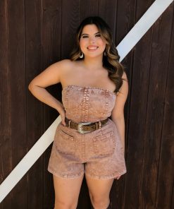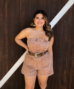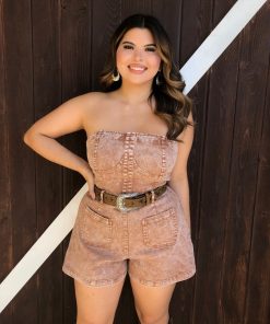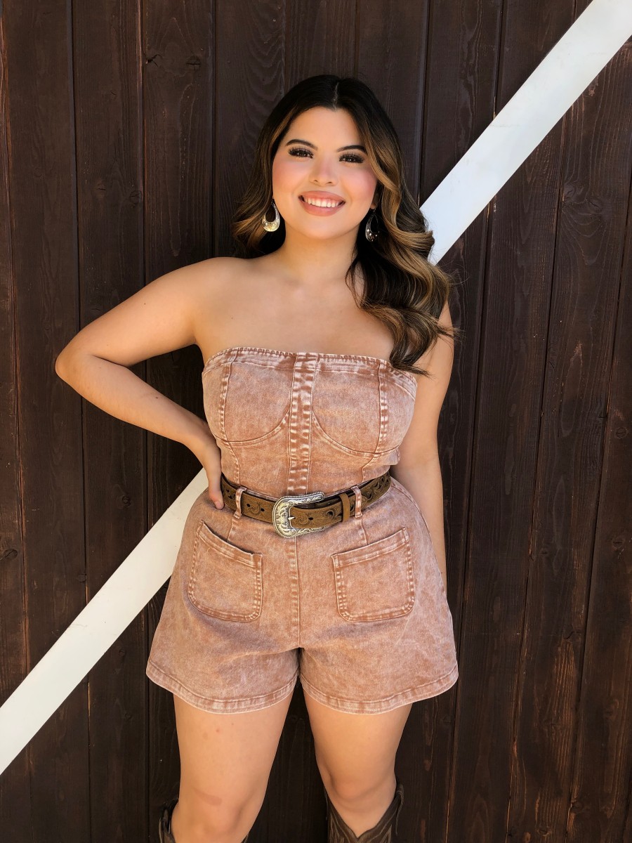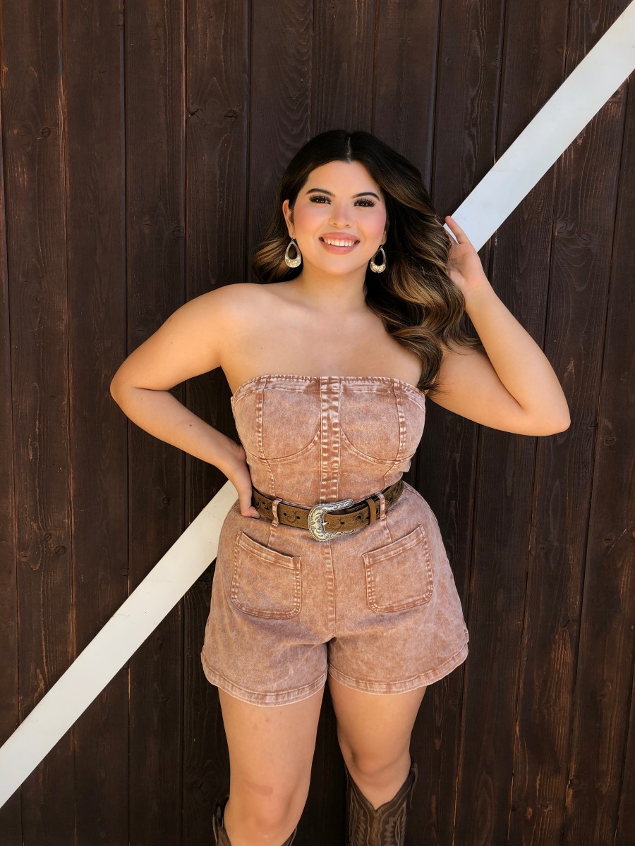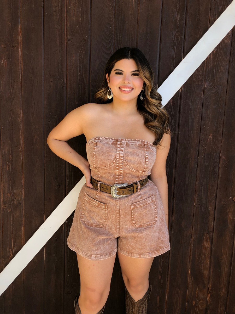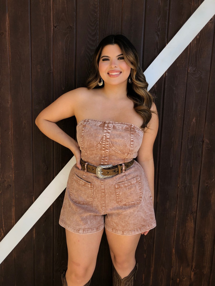 - ACID WASHED TUBE DENIM ROMPER WITH WIDE LEG FIT AND SMOCKED BACK AND ZIPPER DETAIL