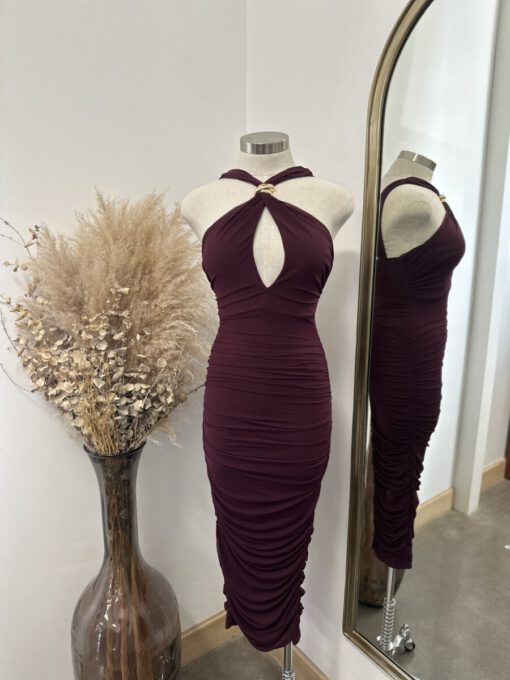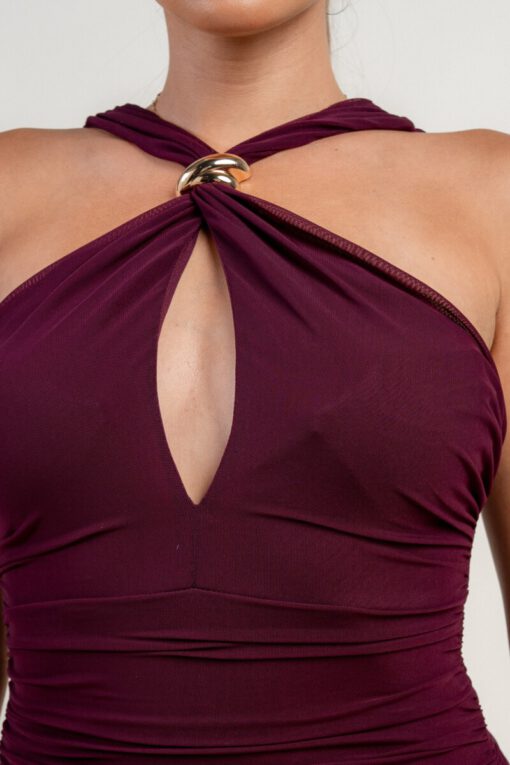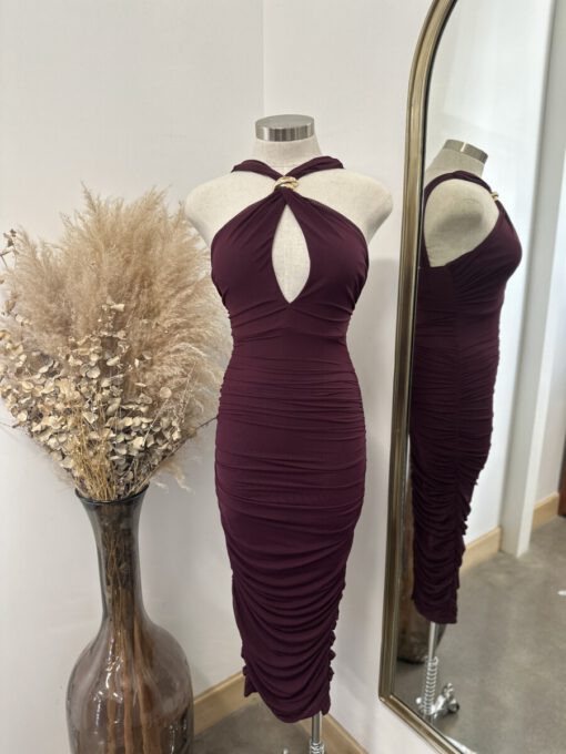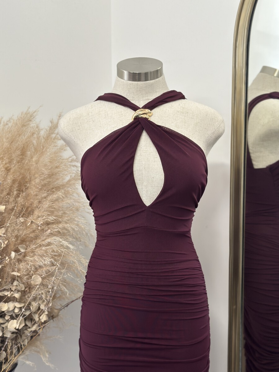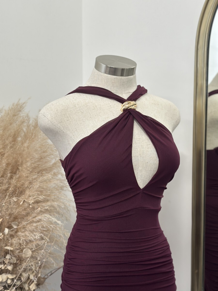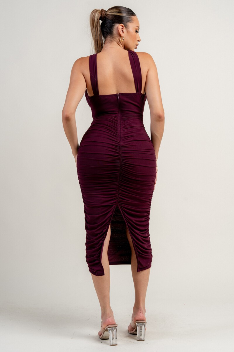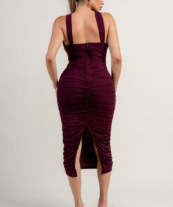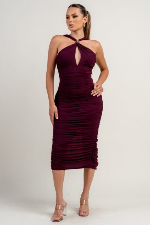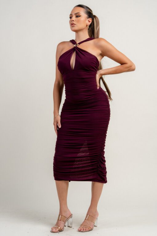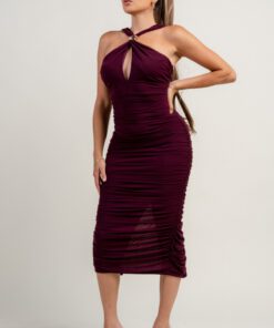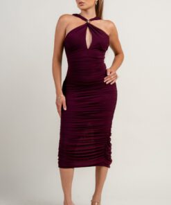 ” Lyra ” Halter Neck Trim Inset Ruched Bodycon Midi Dress ( Plum )