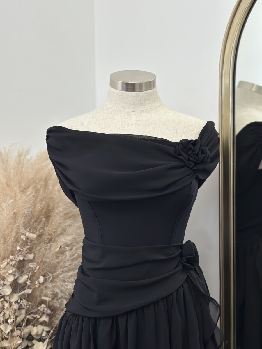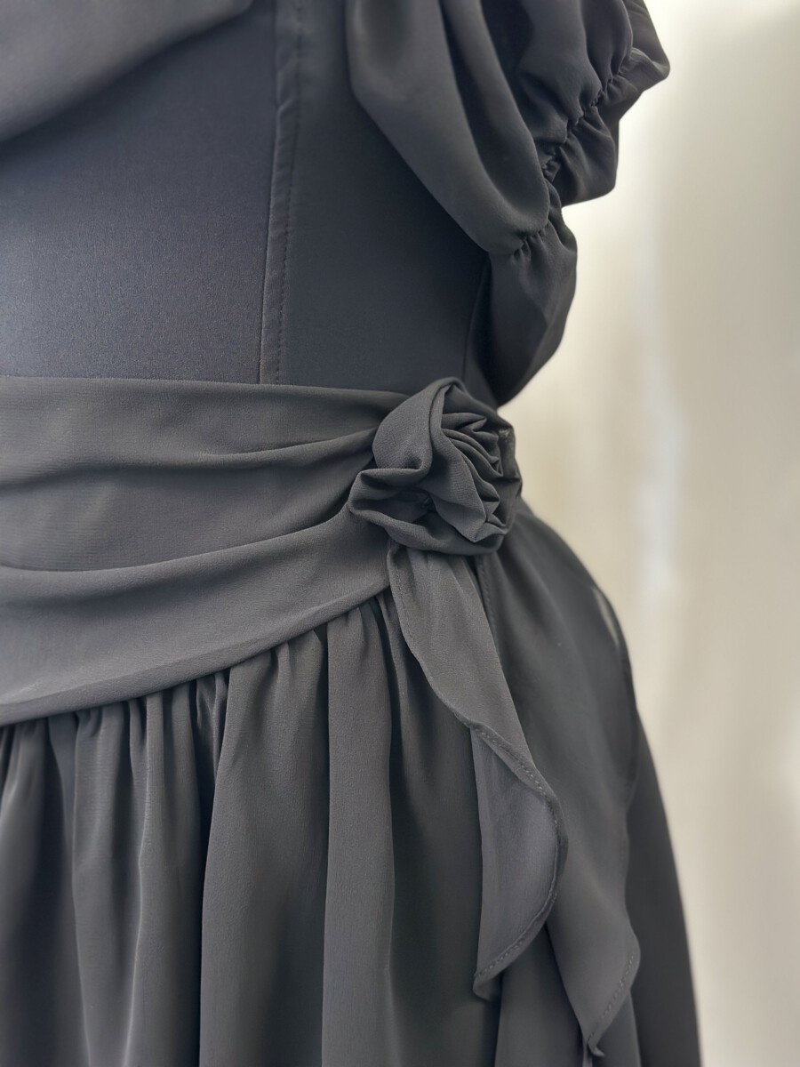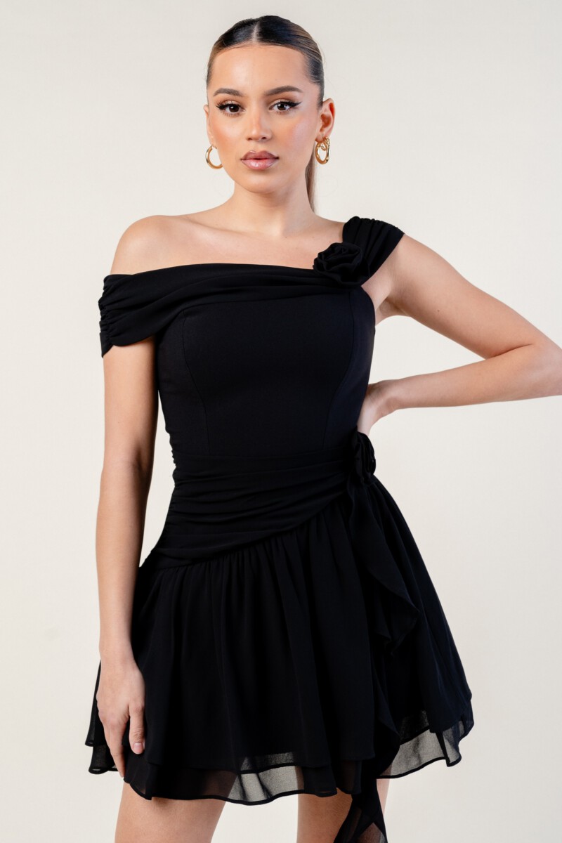 ” Marlinda ” Rosettes Chelsea Chiffon Off Shoulder Mini Dress ( Black )