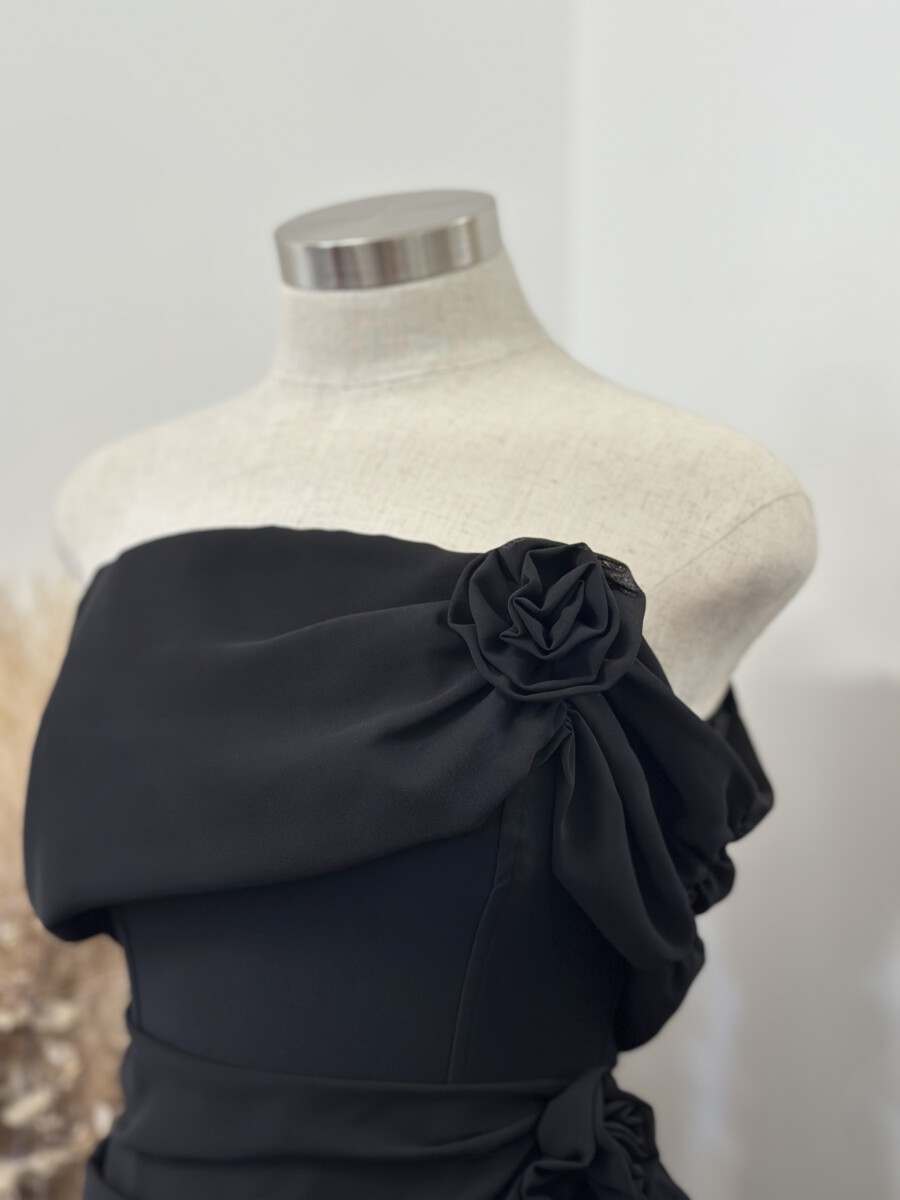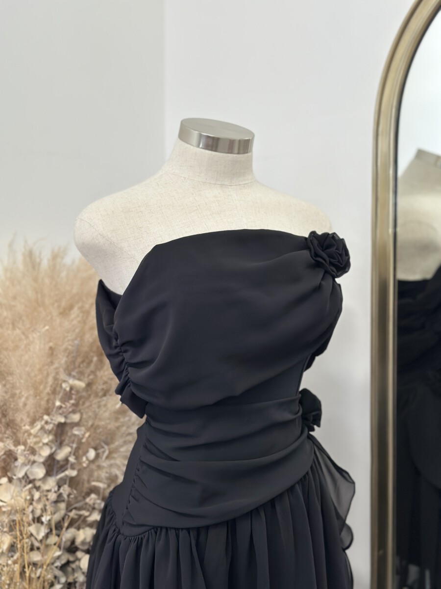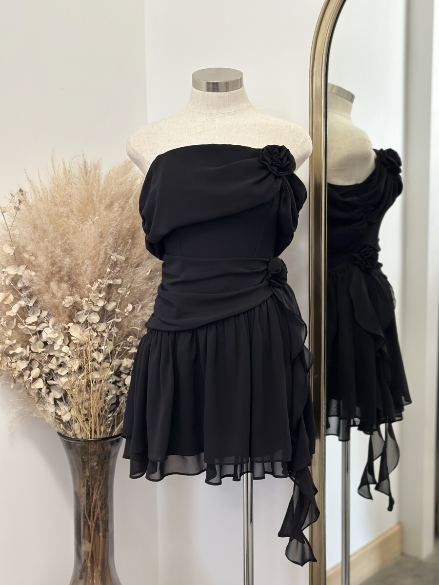 ” Marlinda ” Rosettes Chelsea Chiffon Off Shoulder Mini Dress ( Black )