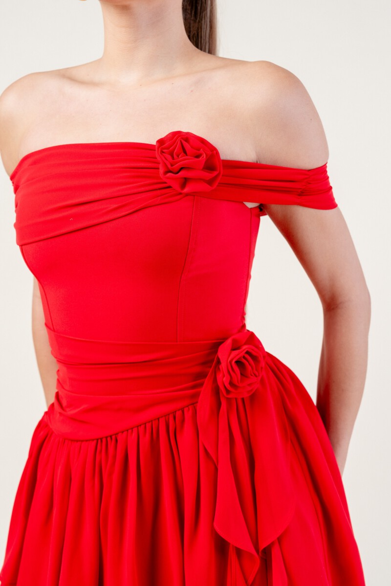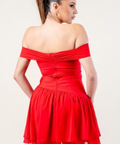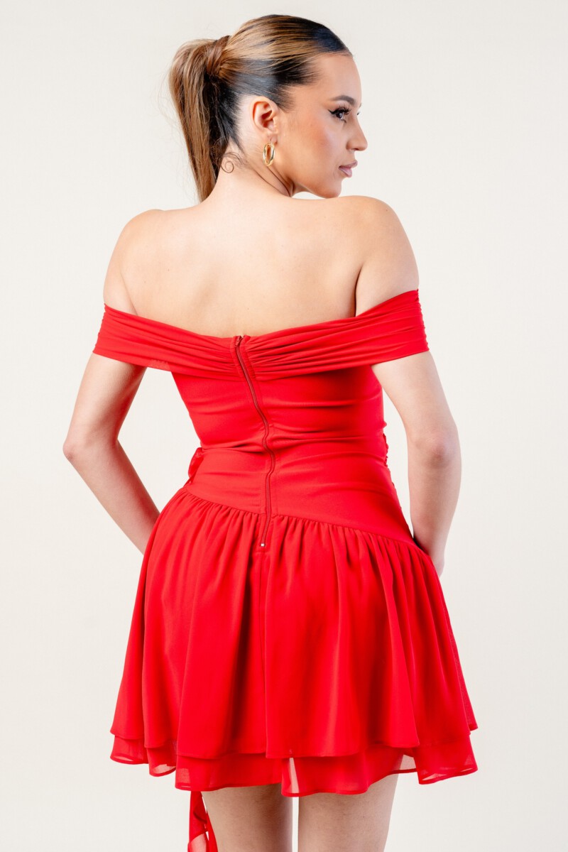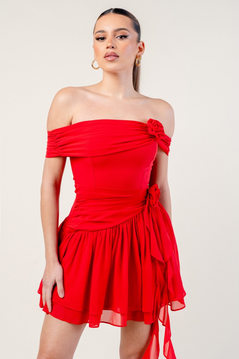 ” Marlinda ” Rosettes Chelsea Chiffon Off Shoulder Mini Dress ( Red )