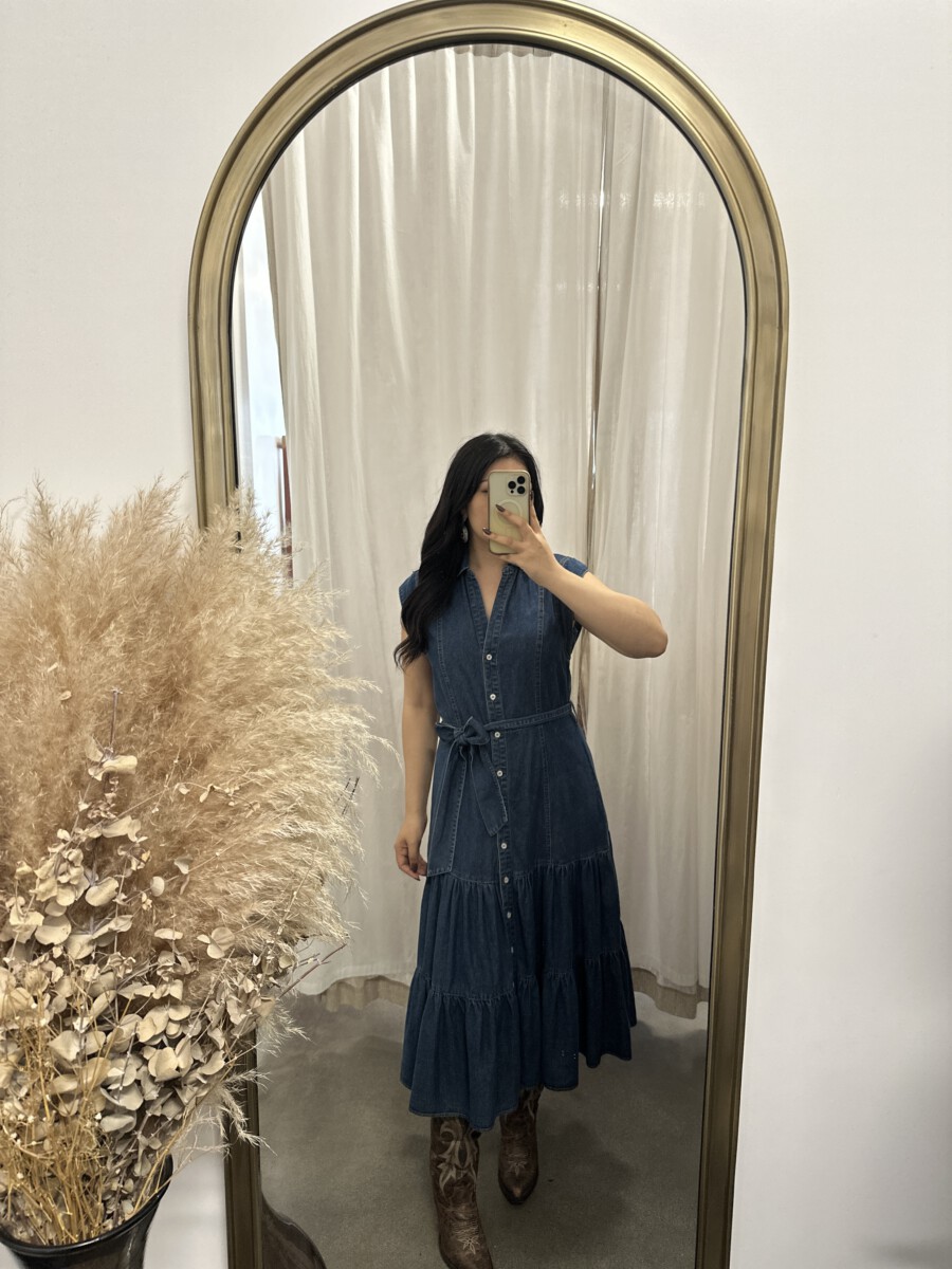 ” Rochelle ” Belted Button Up Tiered Denim Midi Dress