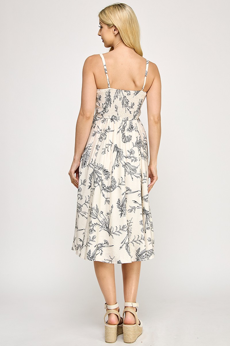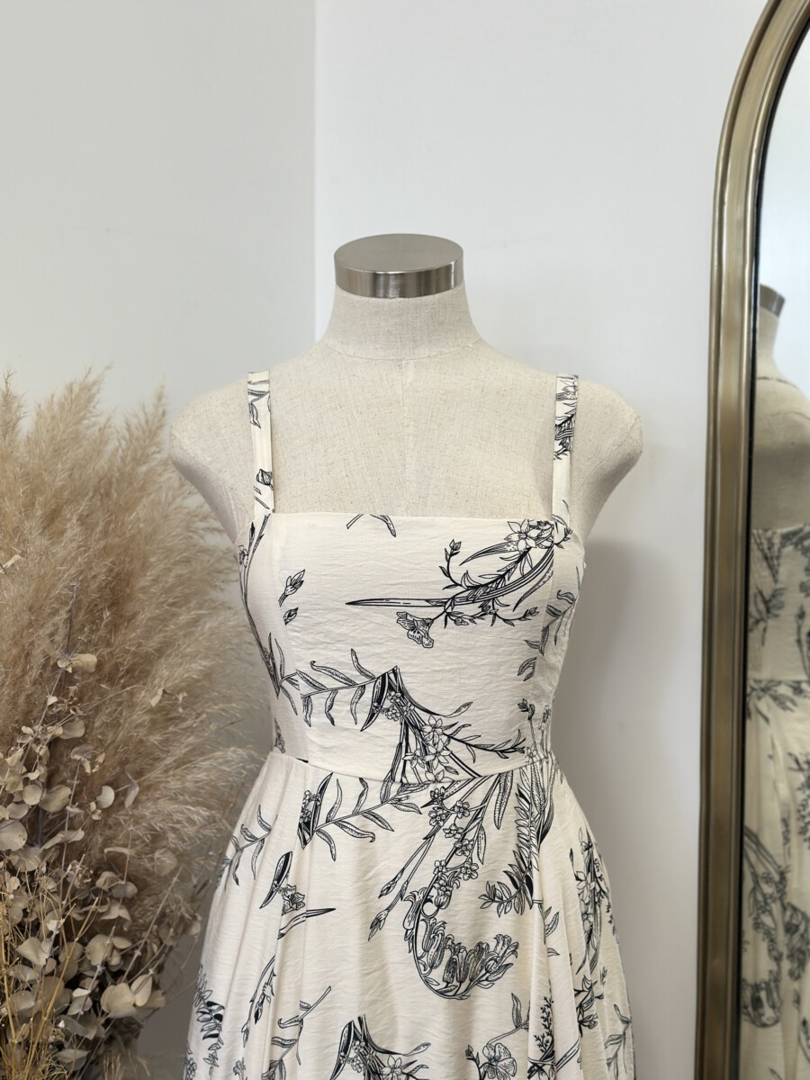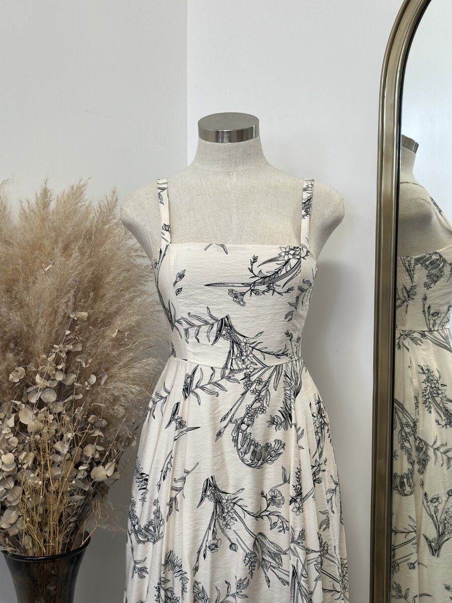 ” Salome ” Botanical Print Square Neck Midi Dress ( Beige / Black )