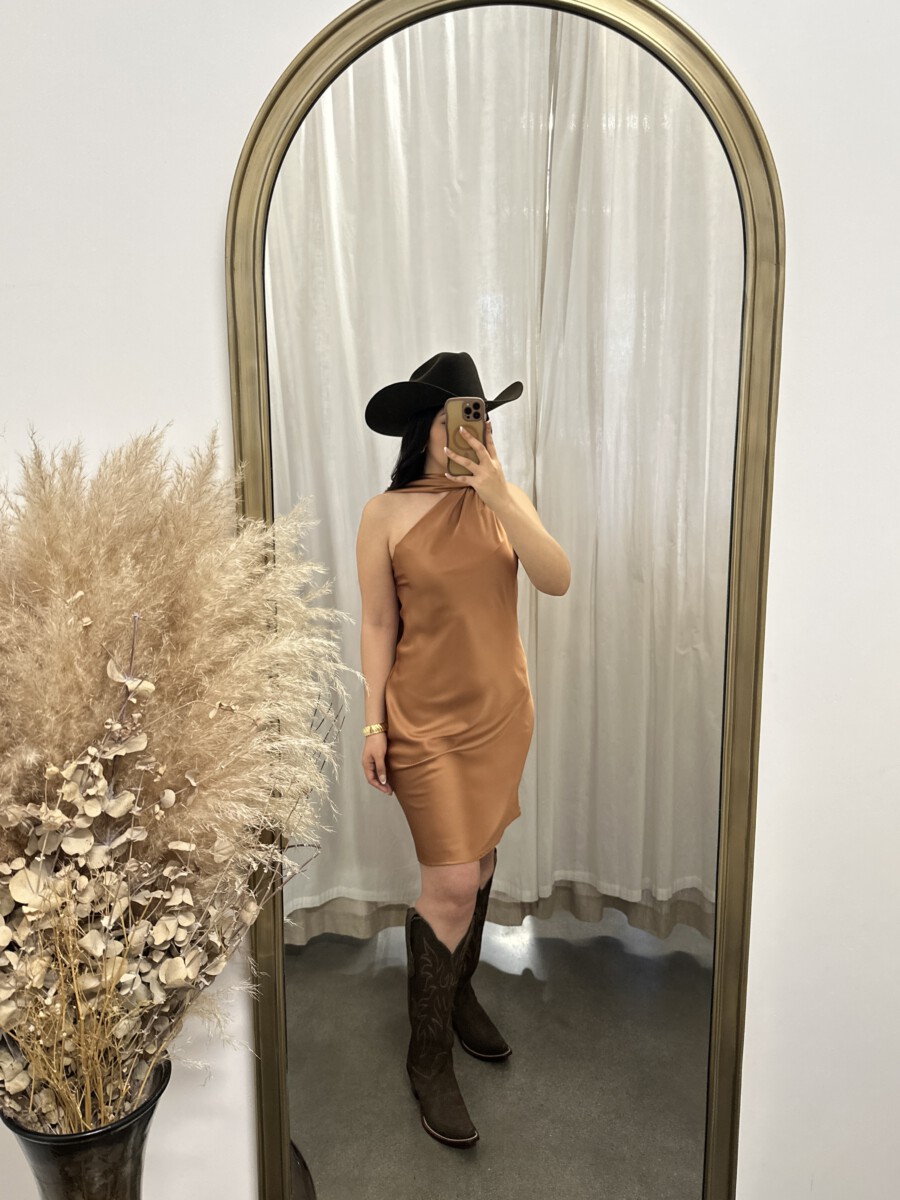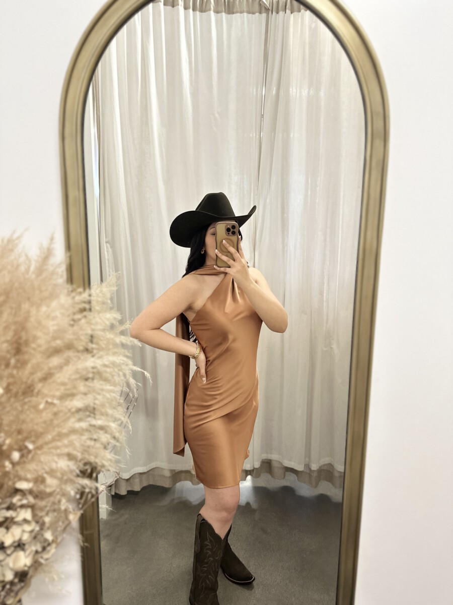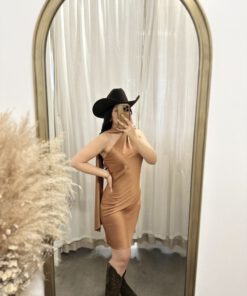 Be the first to review “” Solene ” Satin Scarf Detail One Shoulder Mini Dress ( Camel )” Cancel reply