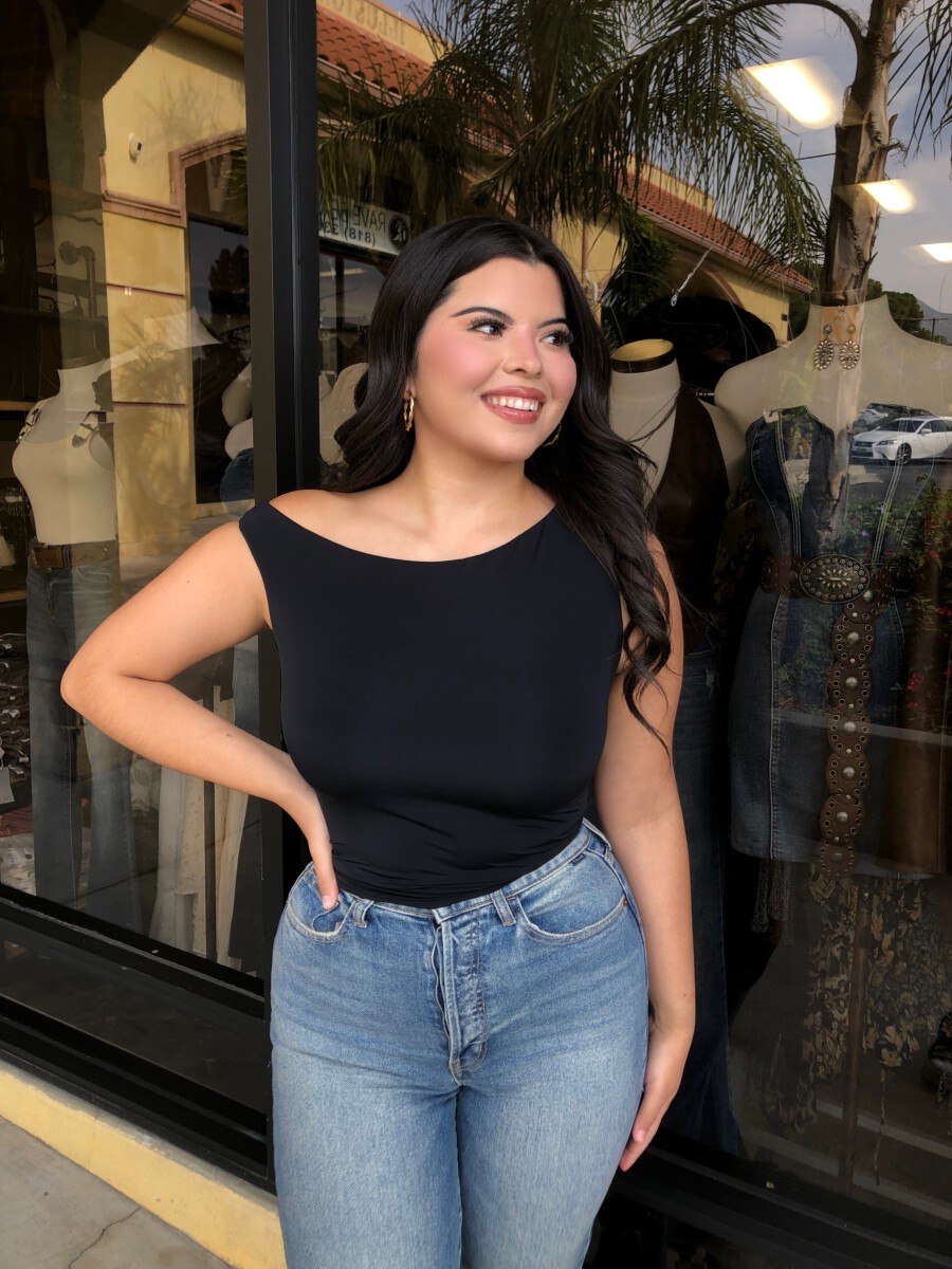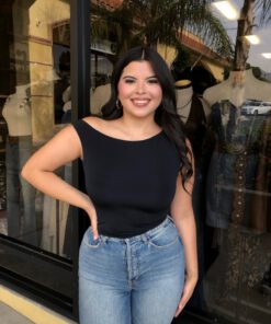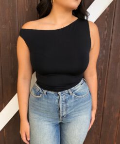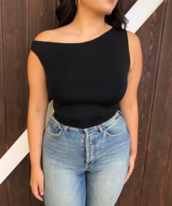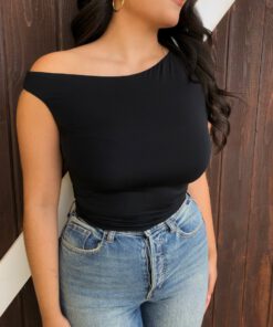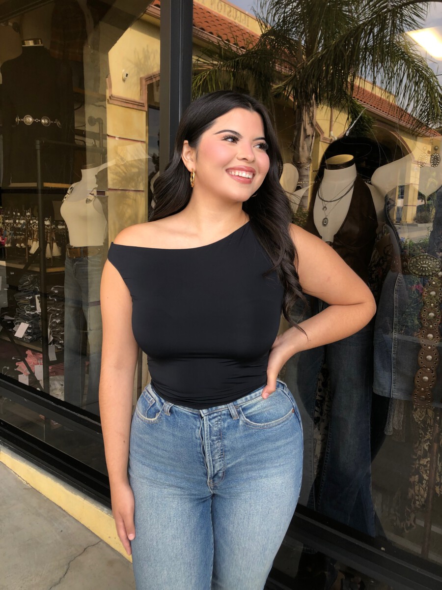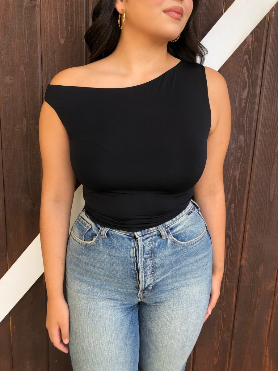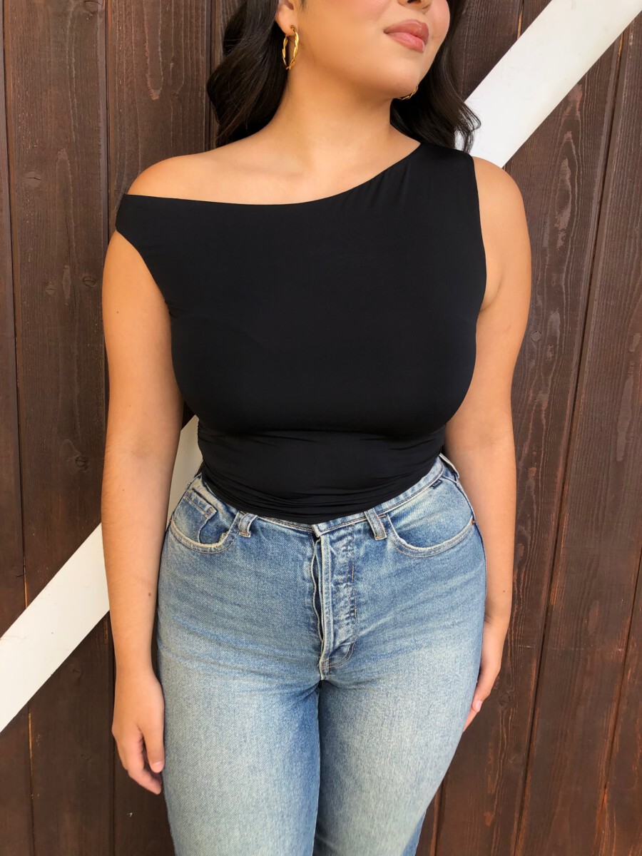 AURA Assymetrical Neckline One Shoulder Top Single Off The Shoulder Strap Double-Lined Soft Stretch Slip Fabric MODEL IS WEARING SIZE SMALL