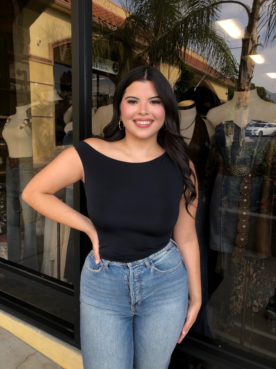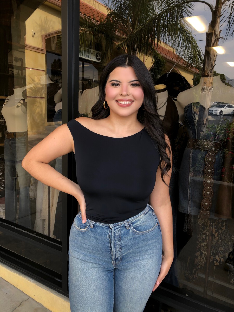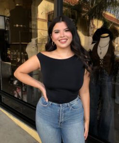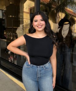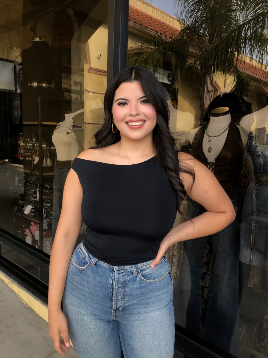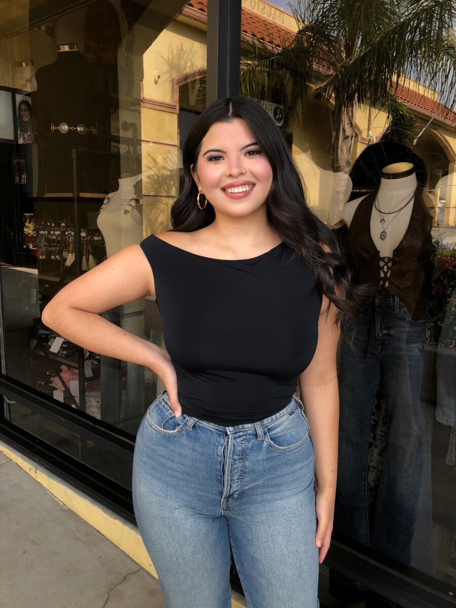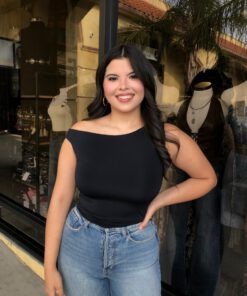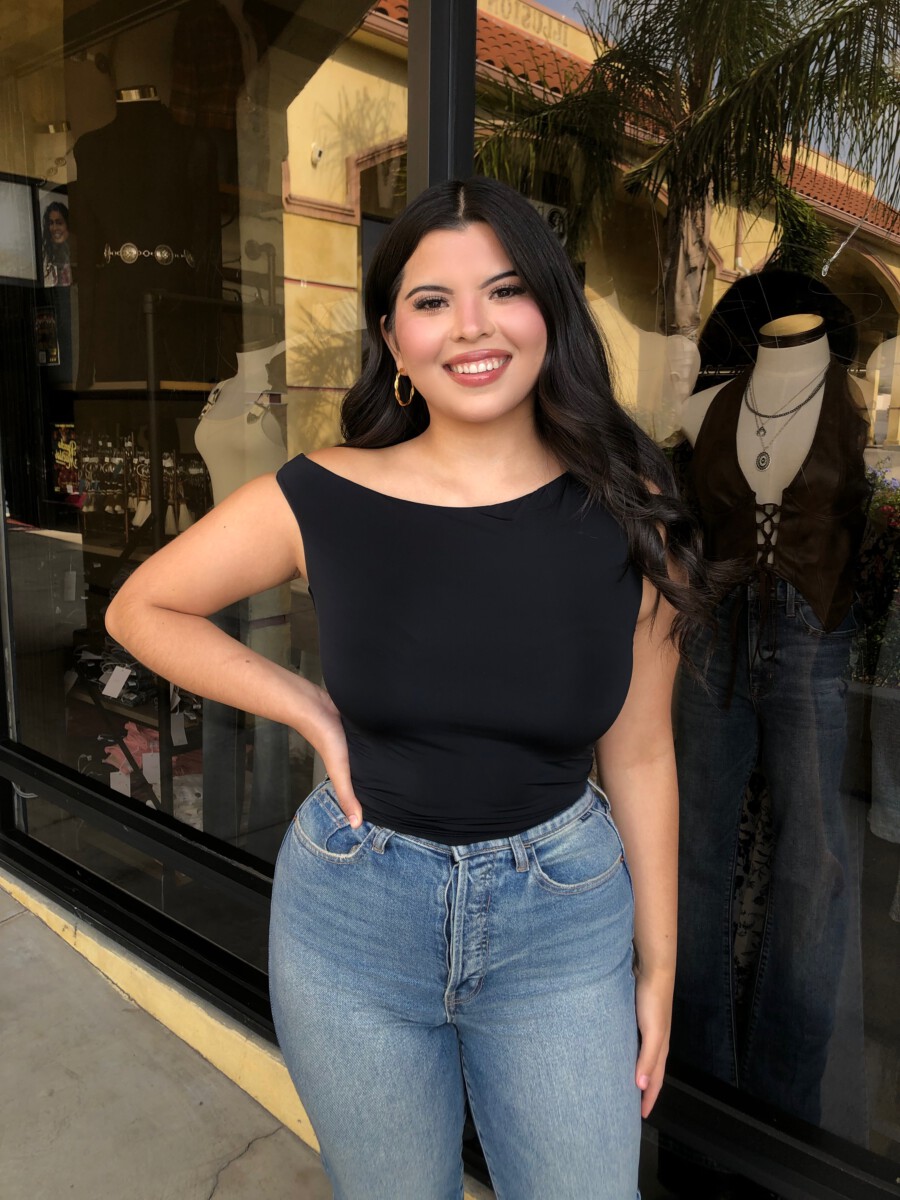 AURA Assymetrical Neckline One Shoulder Top Single Off The Shoulder Strap Double-Lined Soft Stretch Slip Fabric MODEL IS WEARING SIZE SMALL