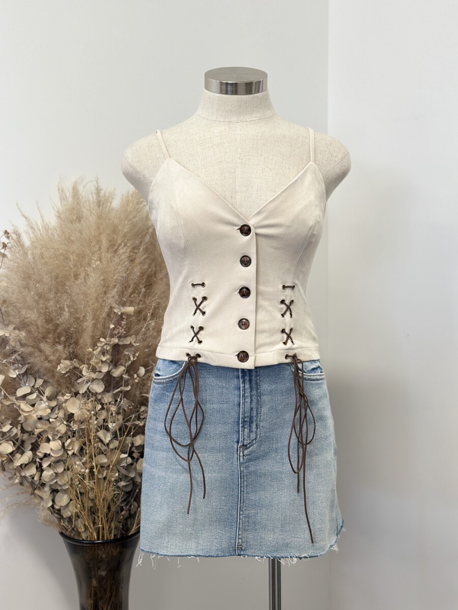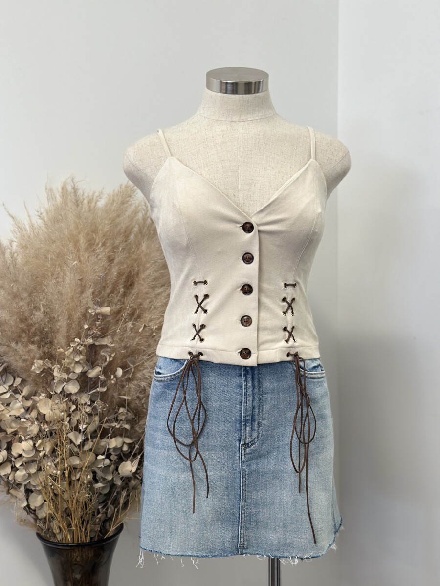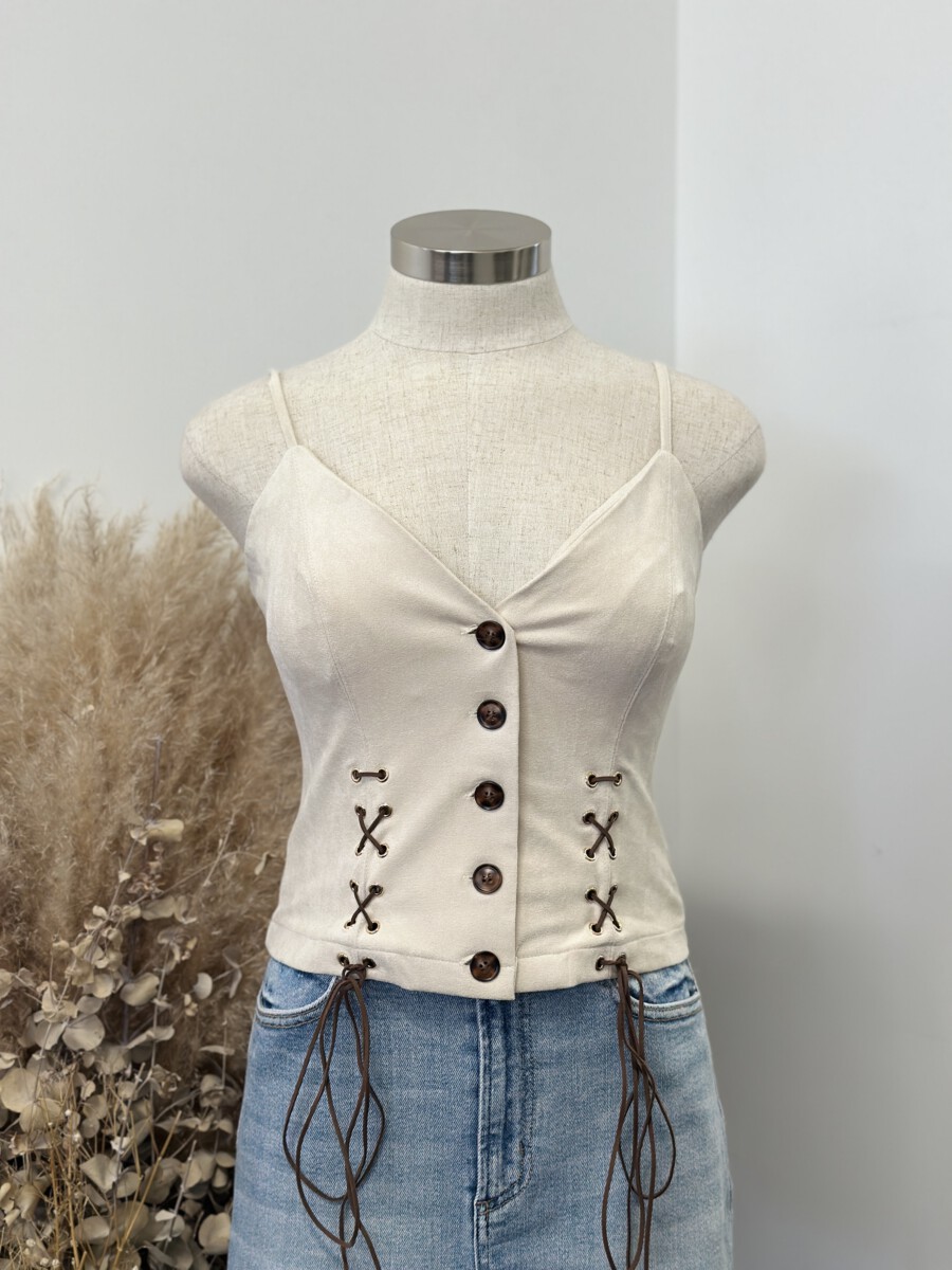 ” Breana ” Suede Button Down X Tie Detail Front Top ( Cream )
