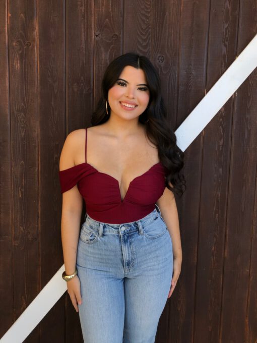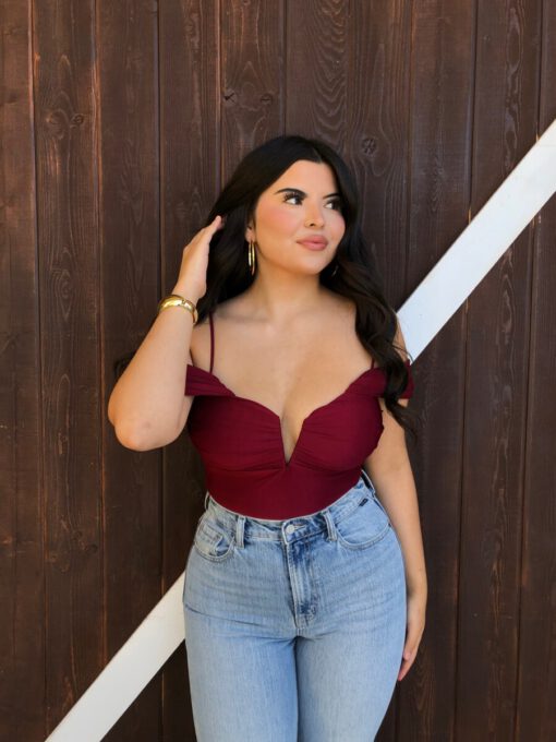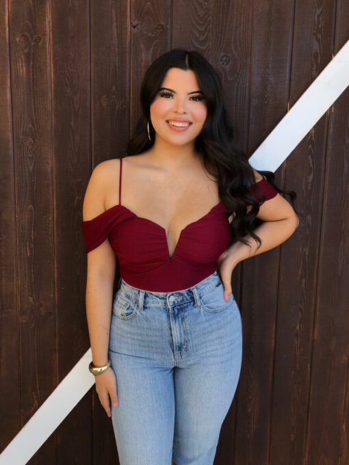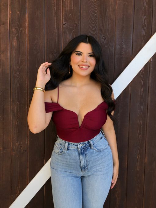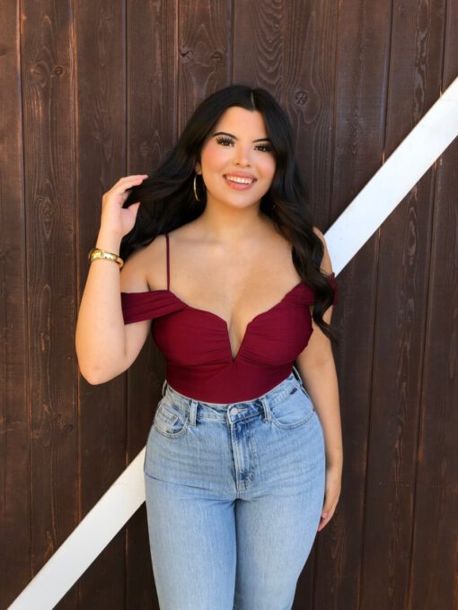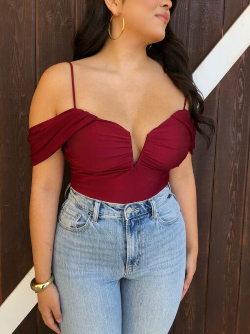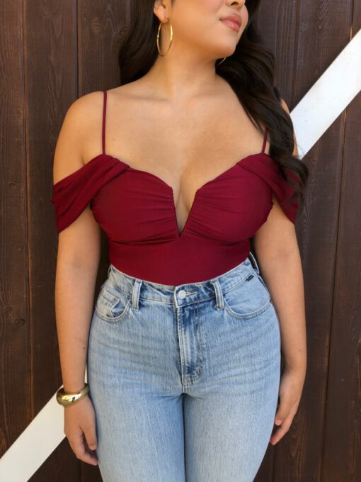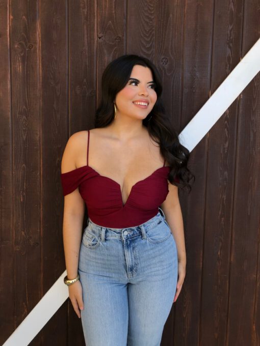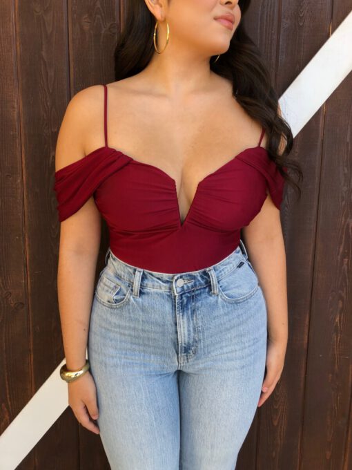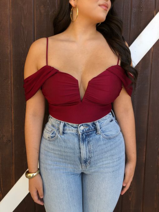 ” Celestia ” V Wire Inset Off Shoulder Bodysuit ( Dark Cherry )