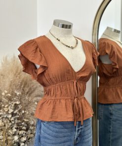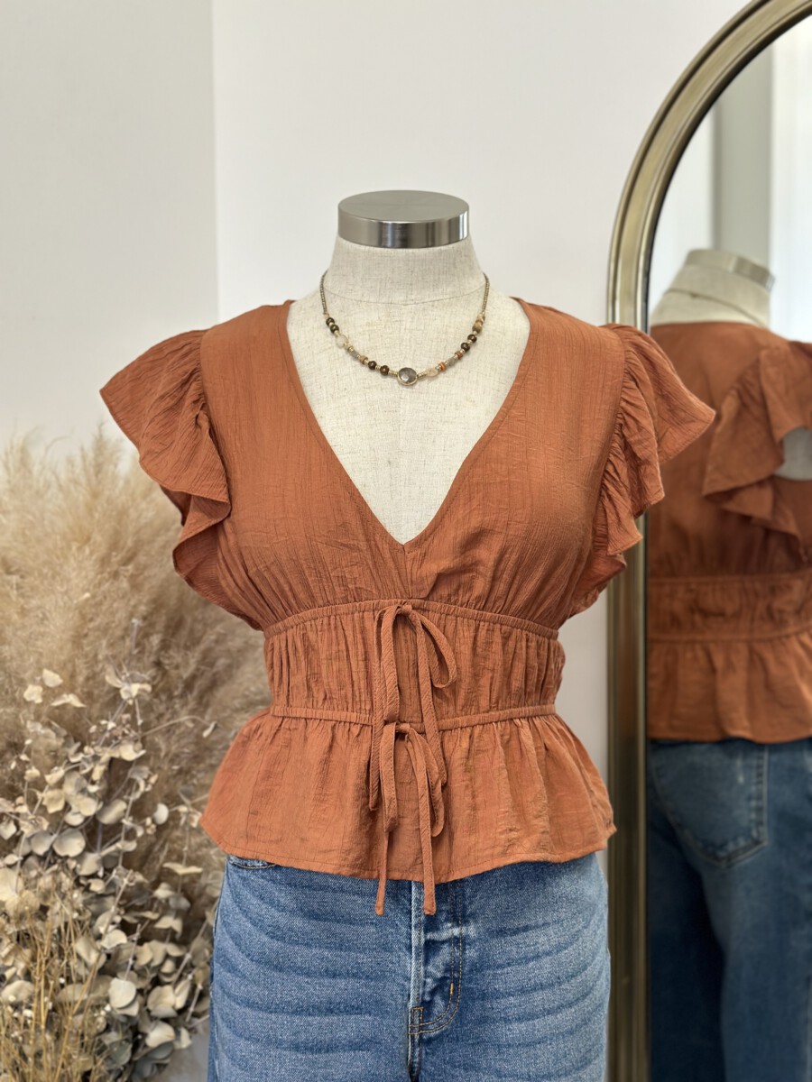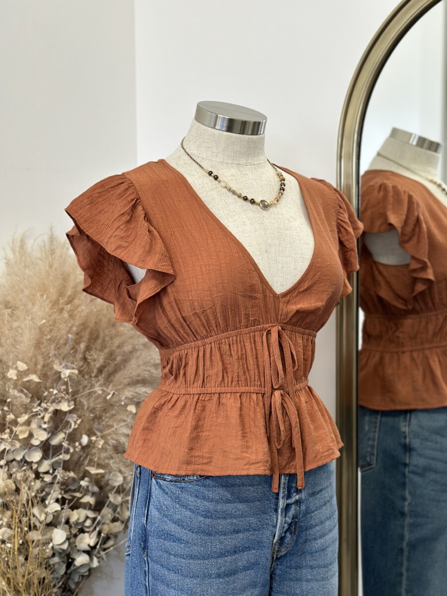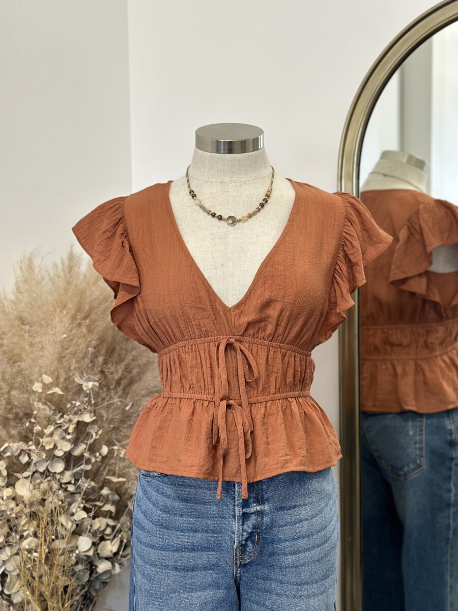 ” Cora ” V-neck Front Tie Ruffle Shoulder Top ( Rust )