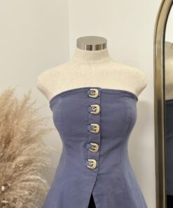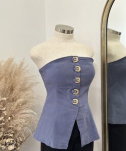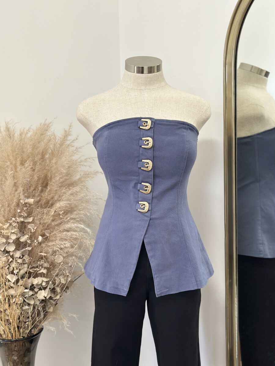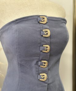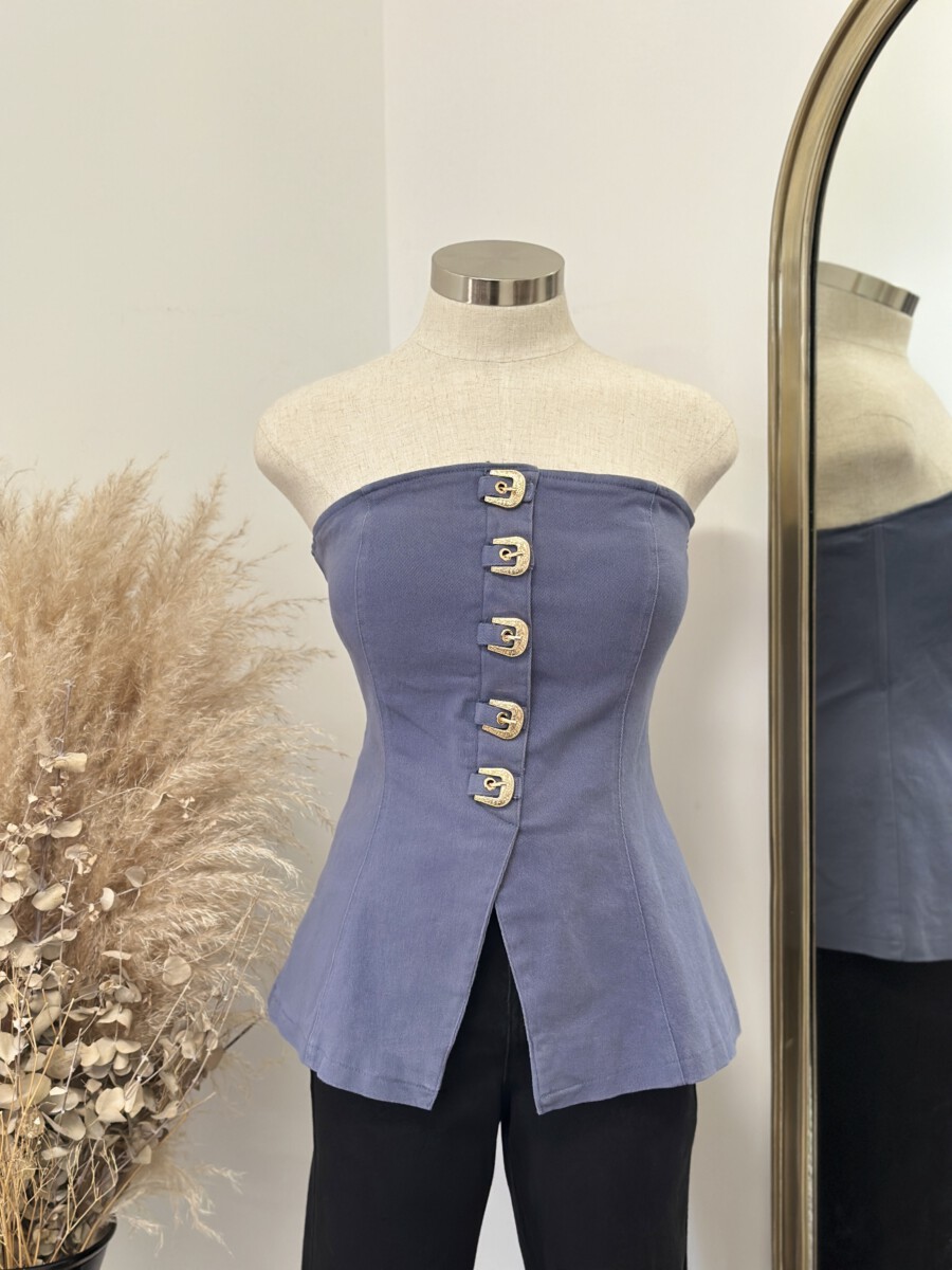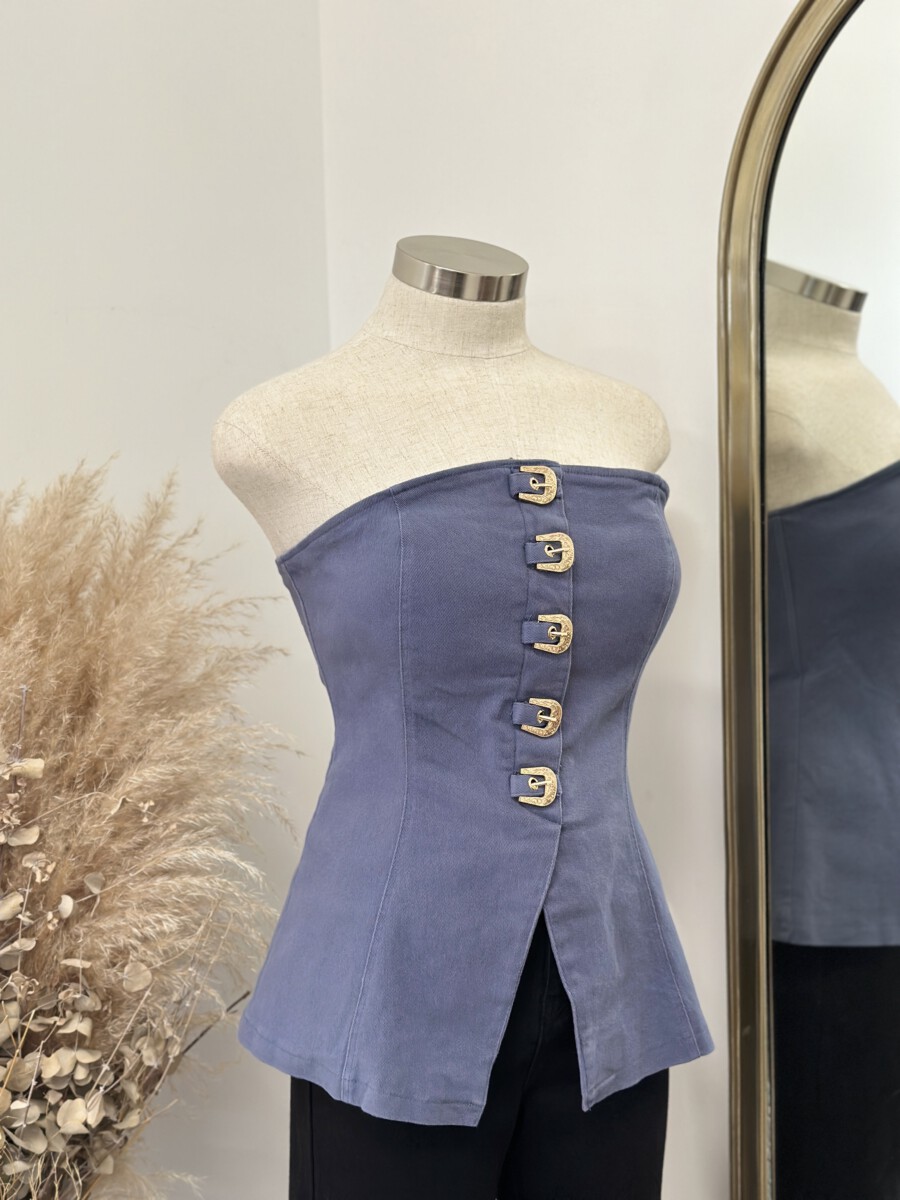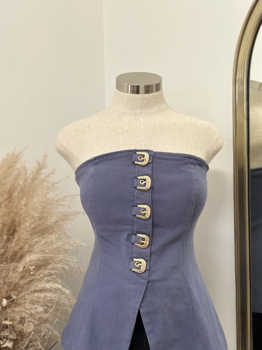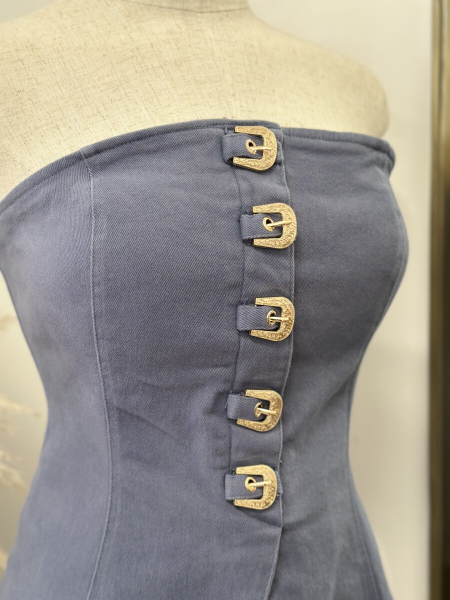 - Strapless fitted top featuring a front closure with bold western-inspired buckle details and a structured