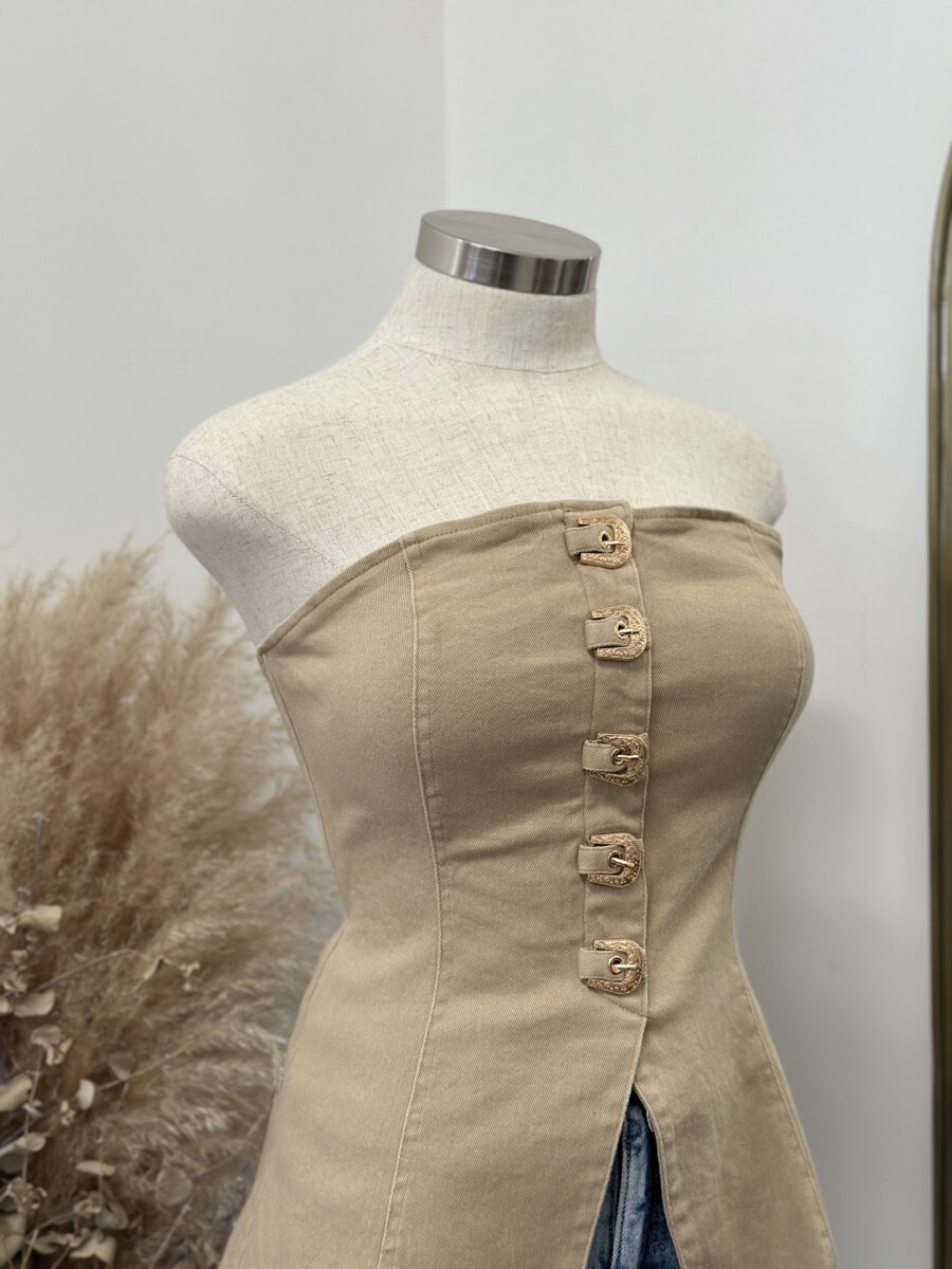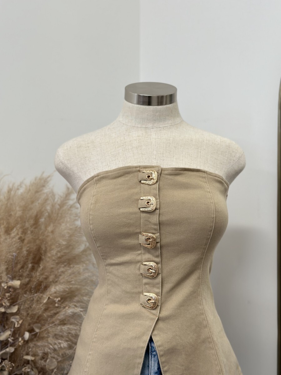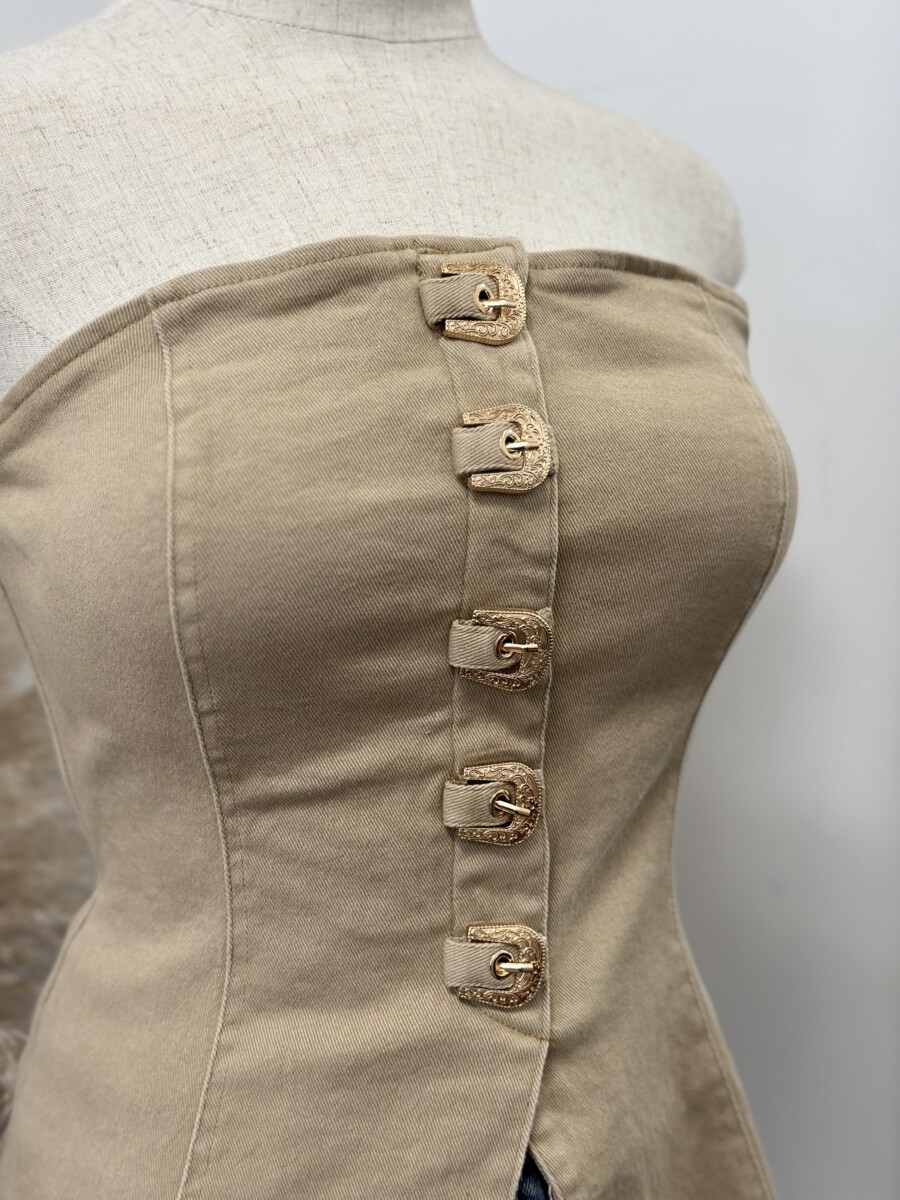 - Strapless fitted top featuring a front closure with bold western-inspired buckle details and a structured
