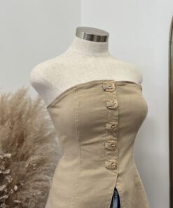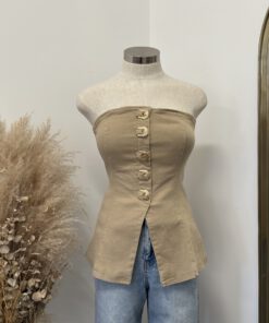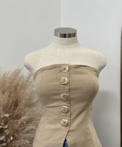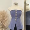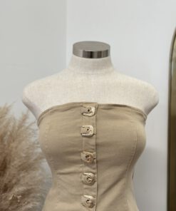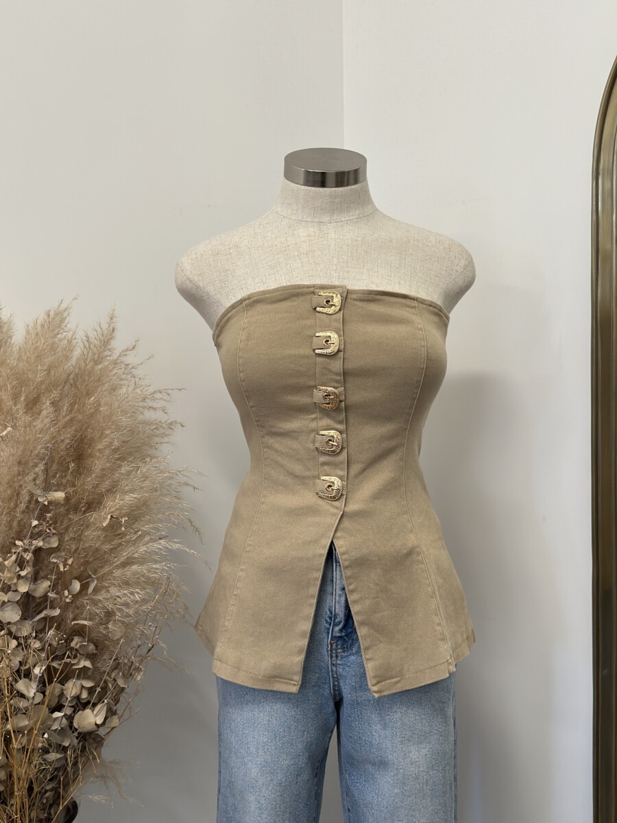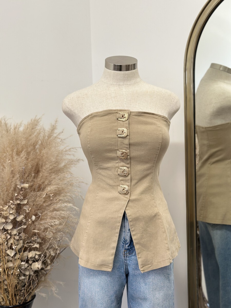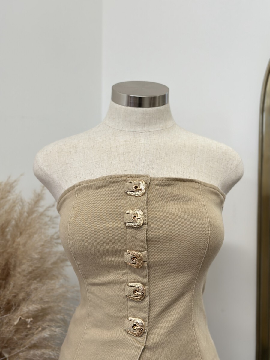 - Strapless fitted top featuring a front closure with bold western-inspired buckle details and a structured
