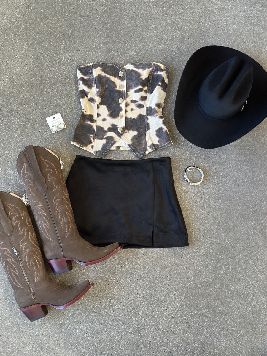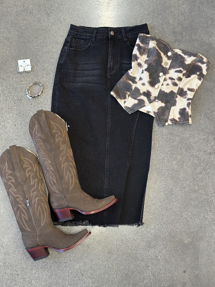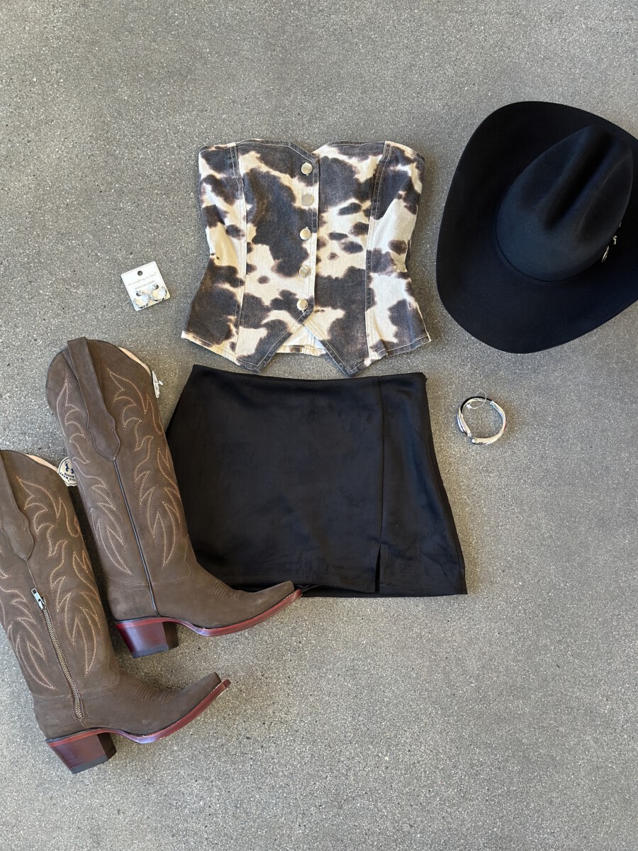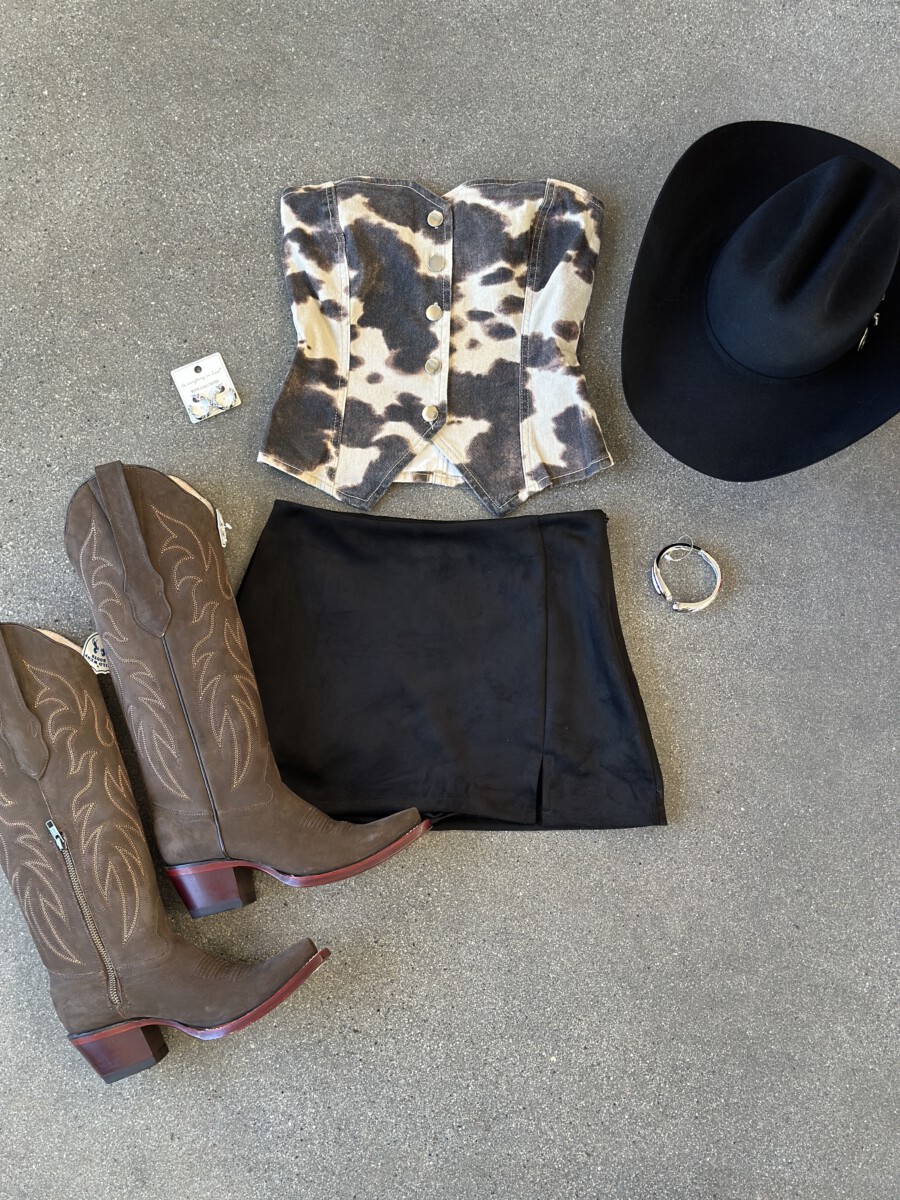 ” Erika ” Denim Cow Print Corset Top ( Cream / Multi )