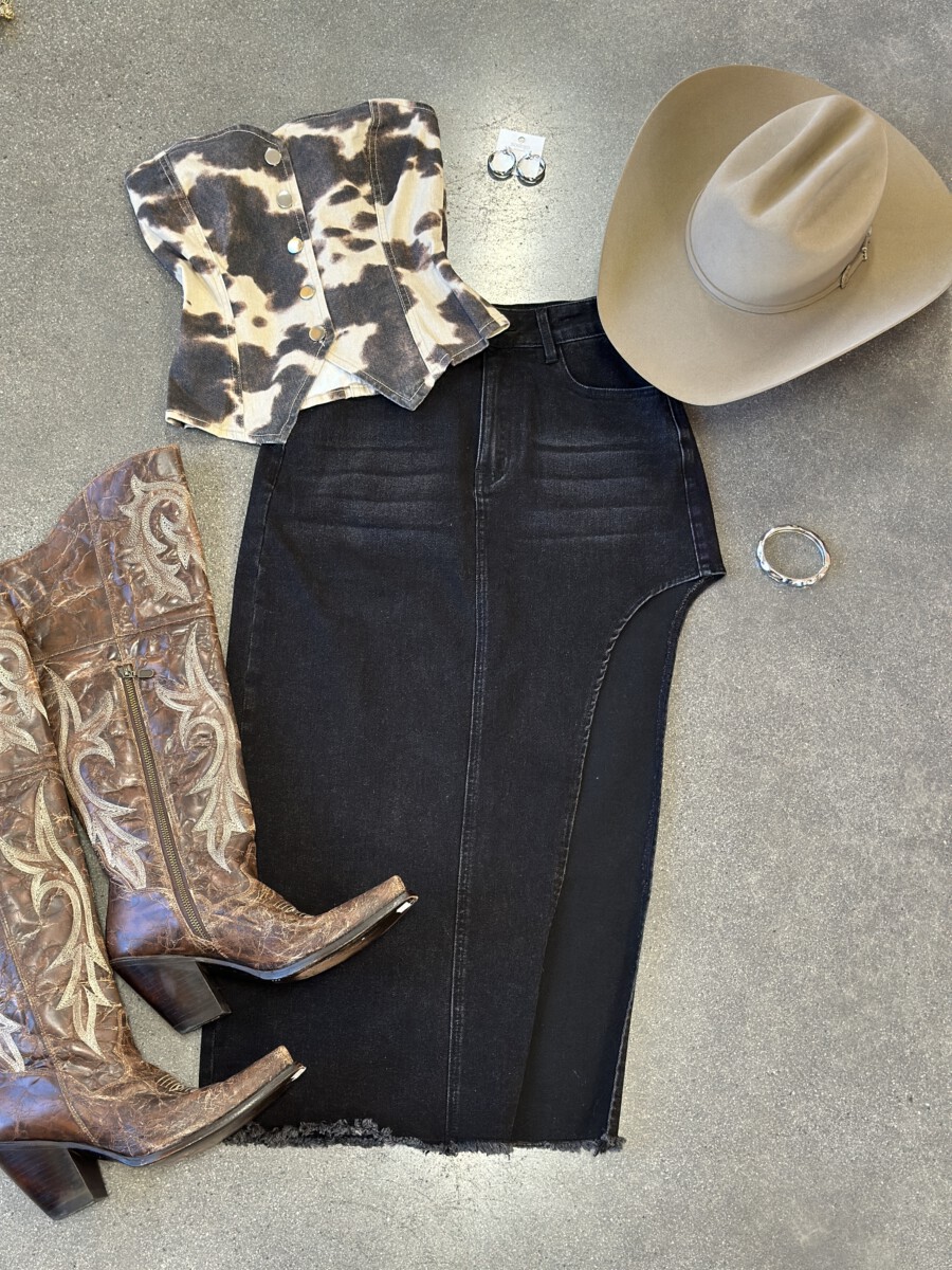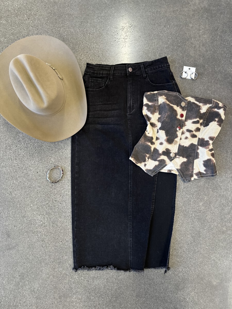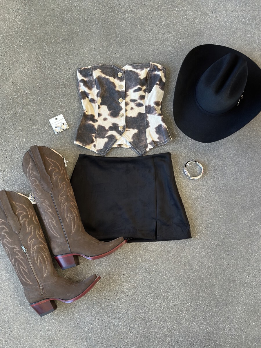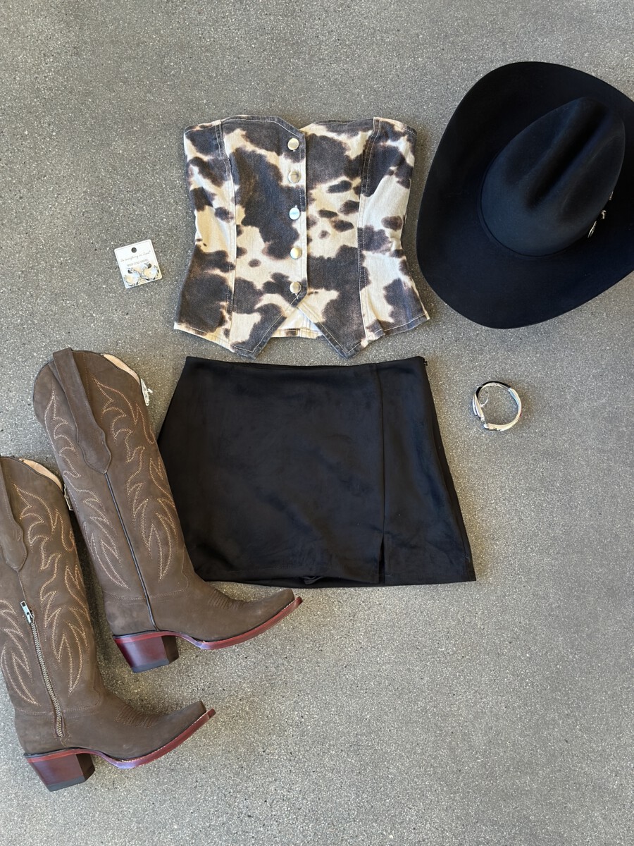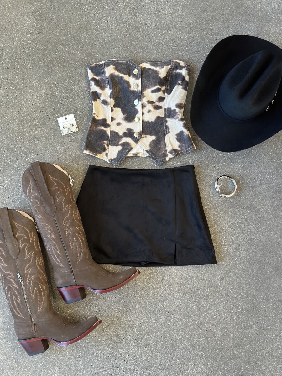” Erika ” Denim Cow Print Corset Top ( Cream / Multi )