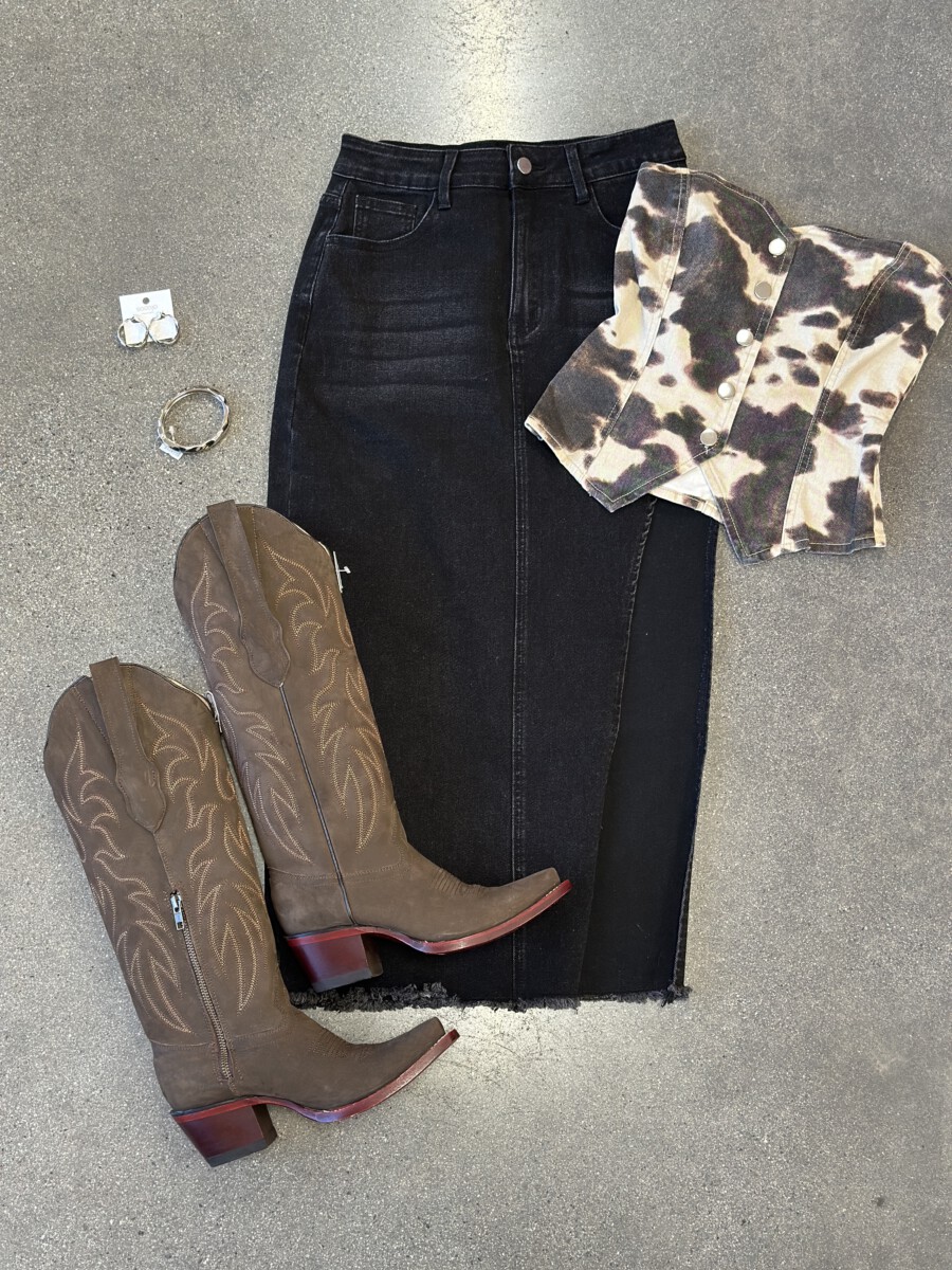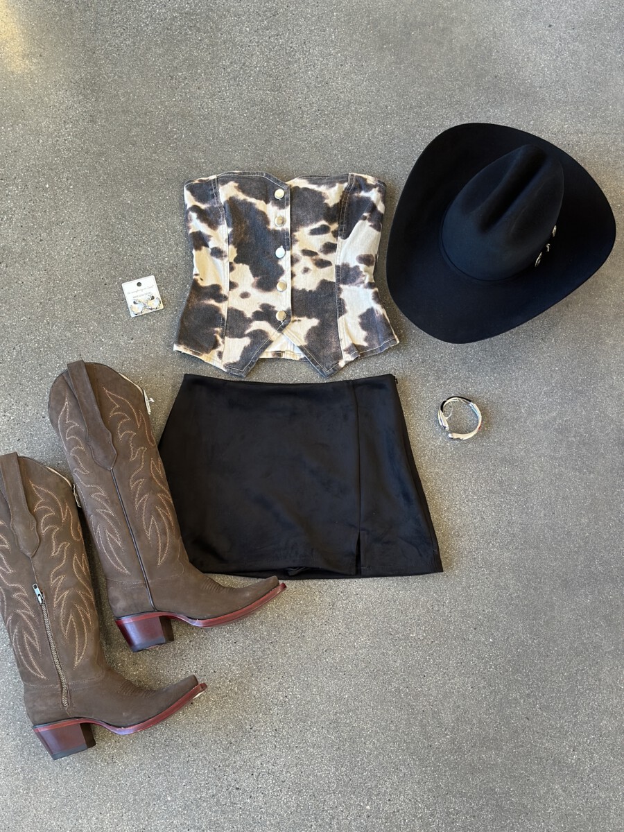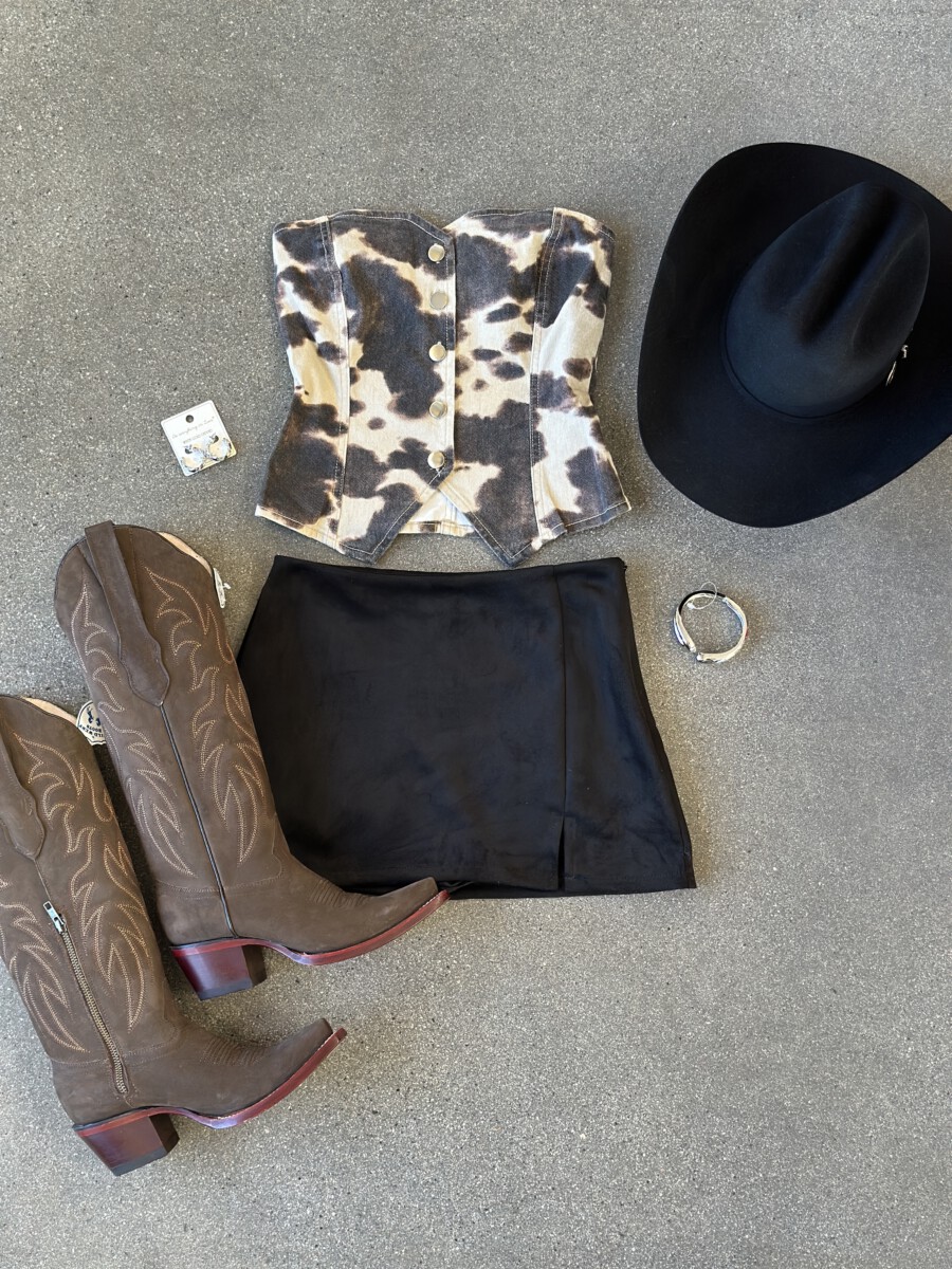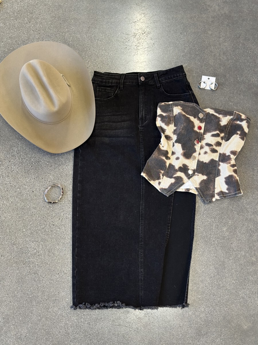 ” Erika ” Denim Cow Print Corset Top ( Cream / Multi )