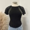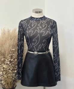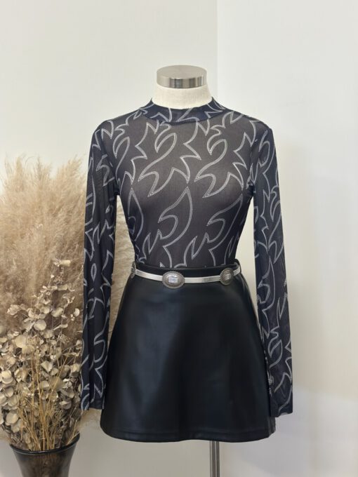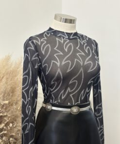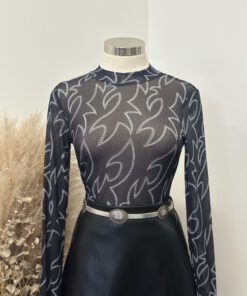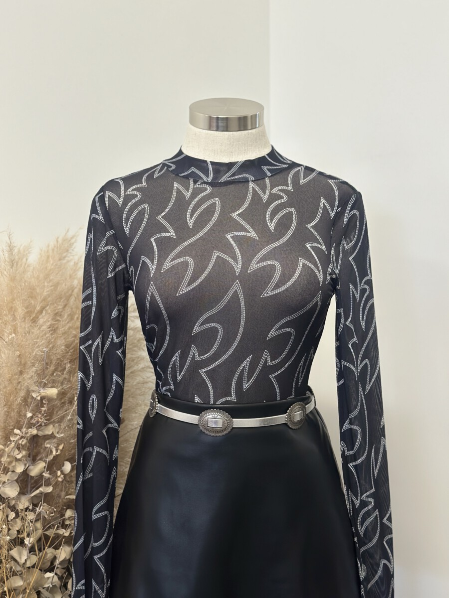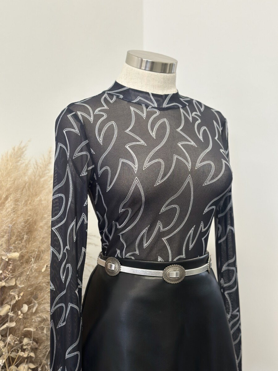 - This fitted top features boots stitch detailing throughout and a mesh mock neck