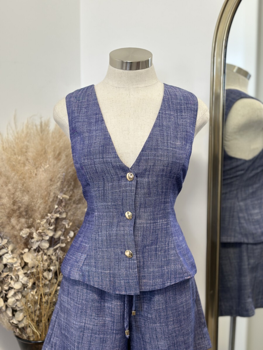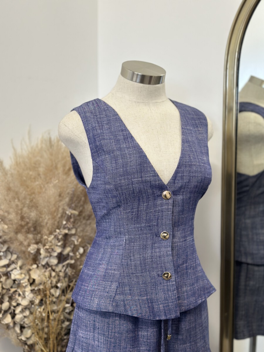 ” Isla ” Linen Gold Button Detail Vest ( Indigo )