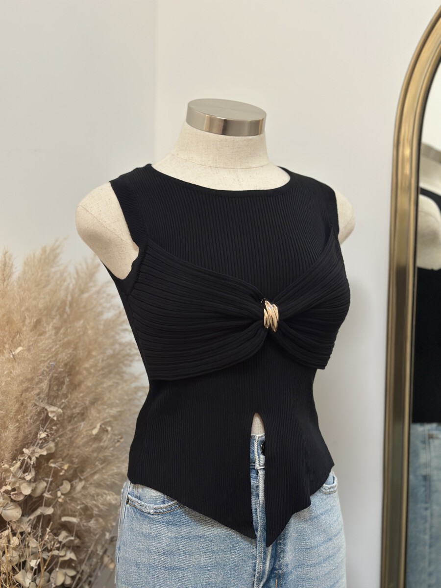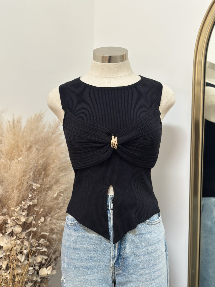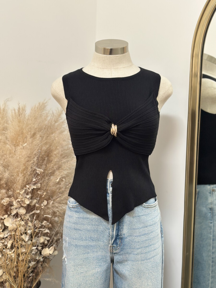 ” Marigold ” Round Neck Ruched Bust Sleeveless Knit Top ( Black )