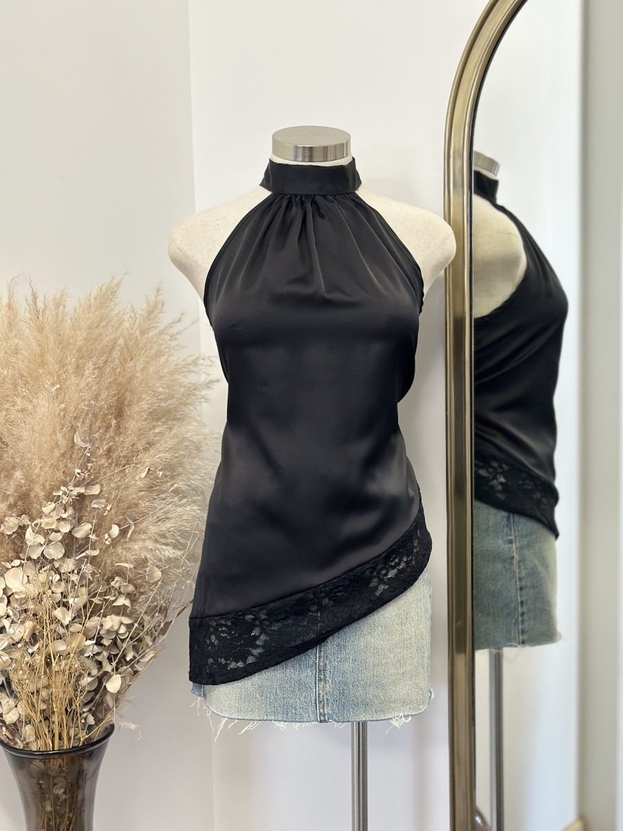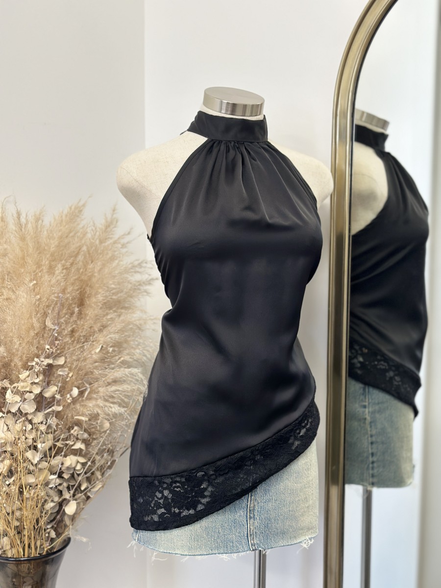 ” Micah ” Satin Lace Asymmetrical Top ( Black )