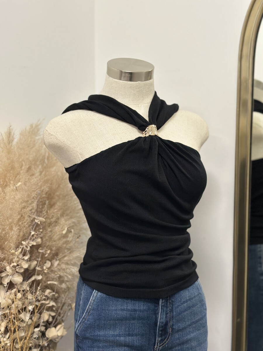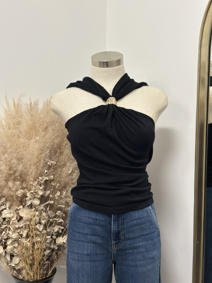 ” Nyra ” Trim Ruched Cf Slvless Knit Top ( Black )