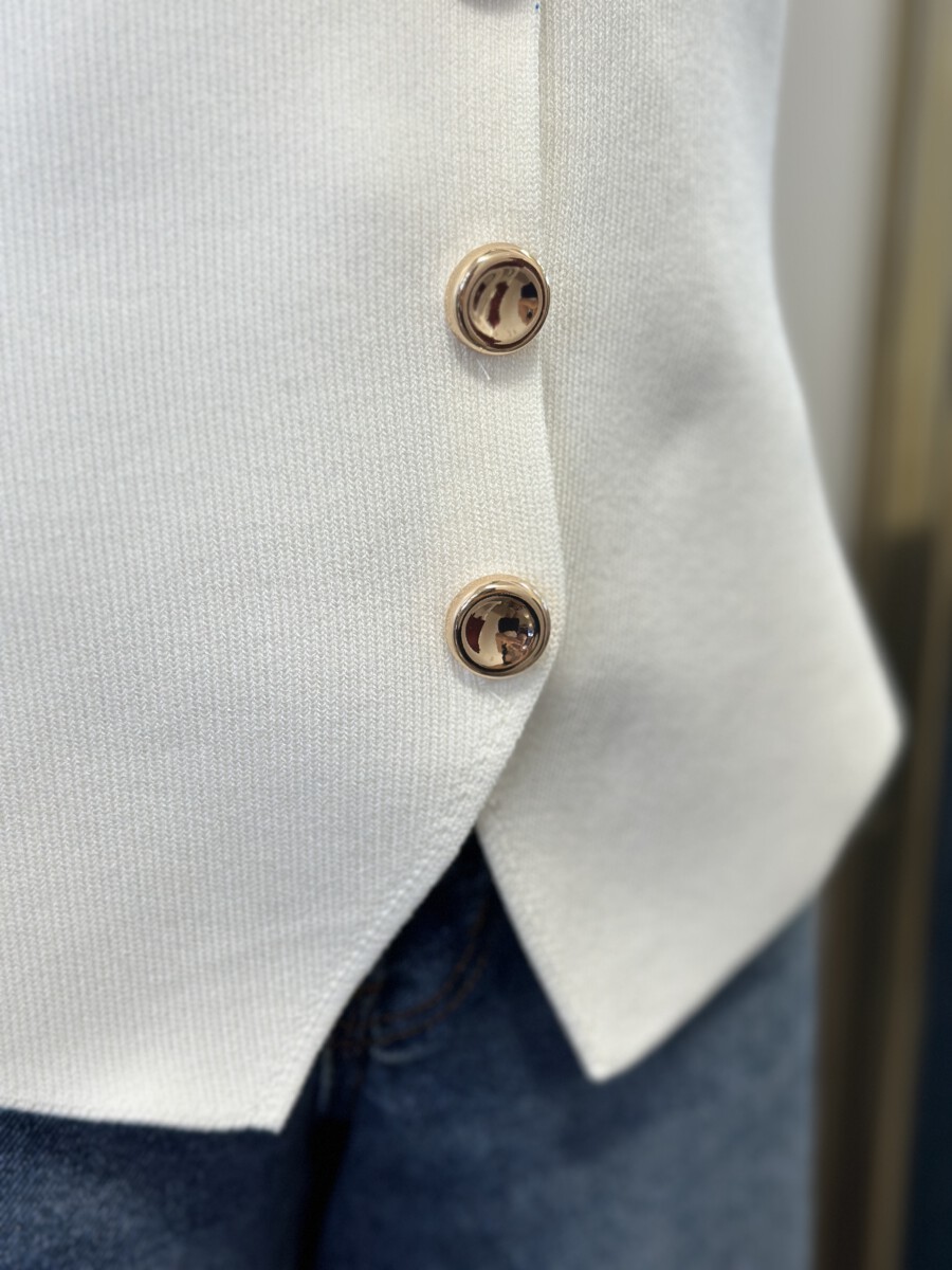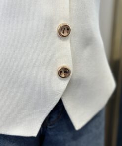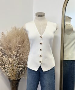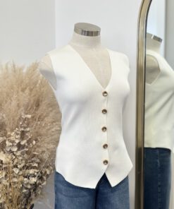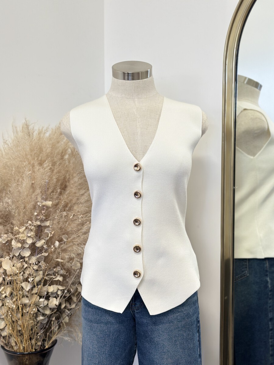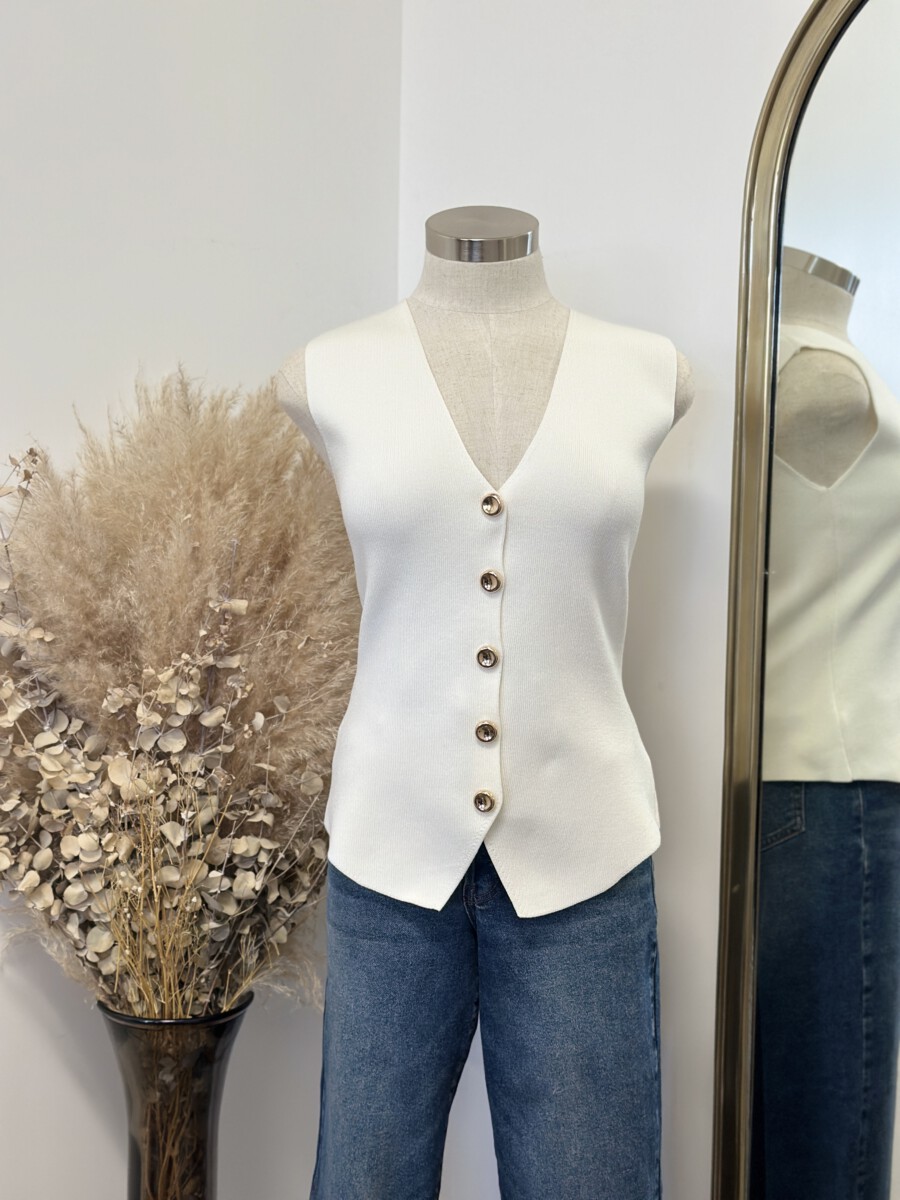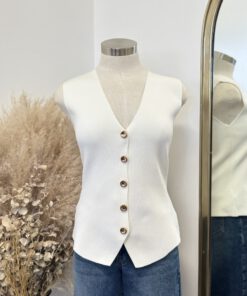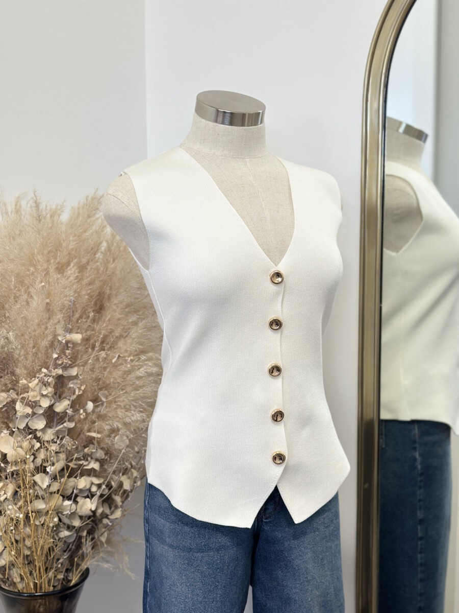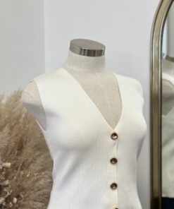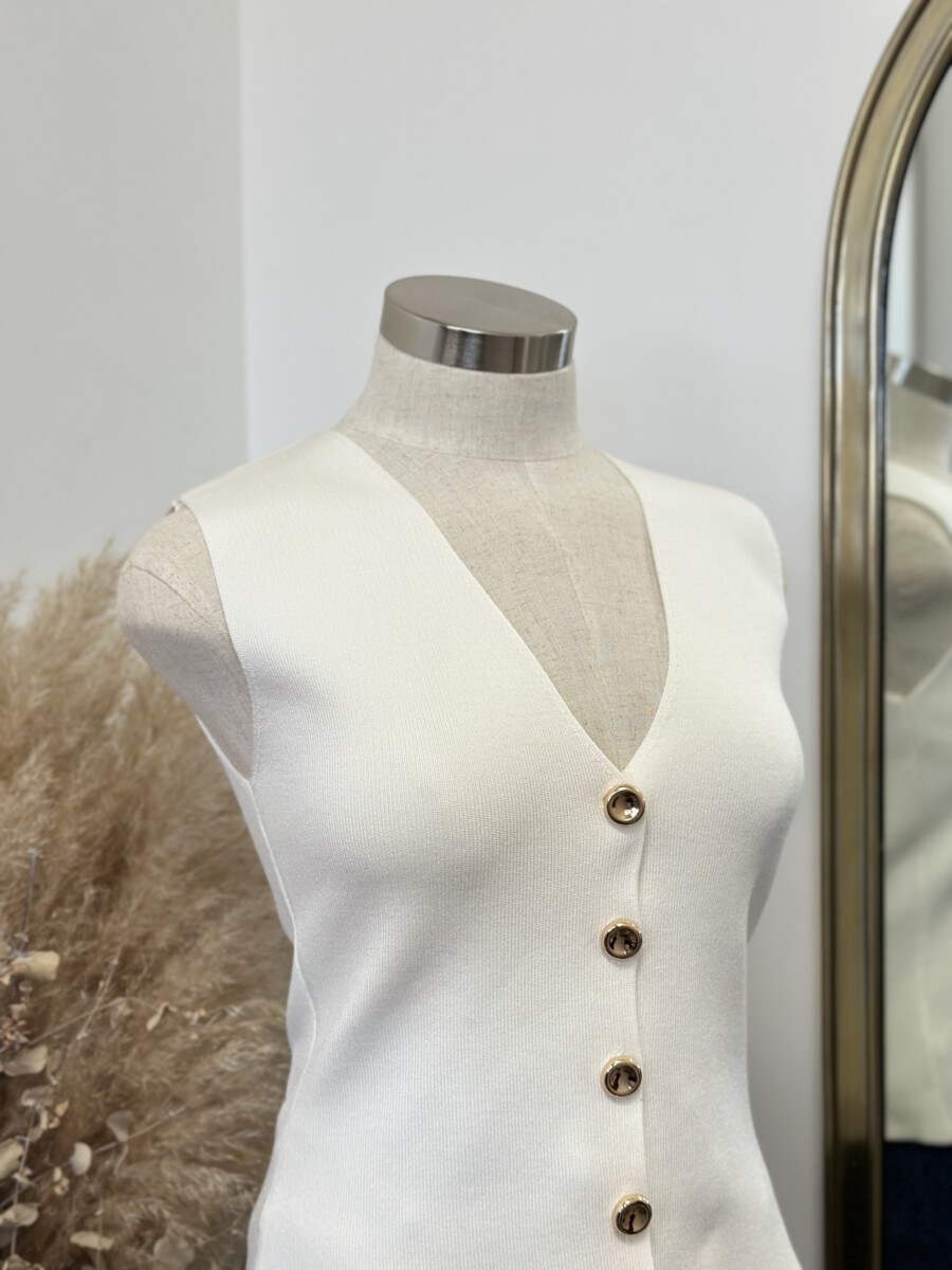 FEATURES - V Neckline, Sleeveless & Round Button Closure SIZE + FIT - Model is 5'9" 32C bust, 26" waist, and 36" hips. - Model is Wearing Size Small