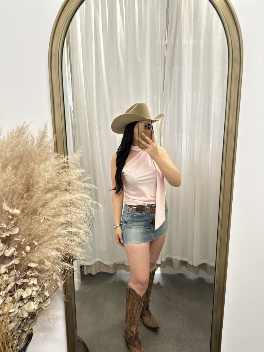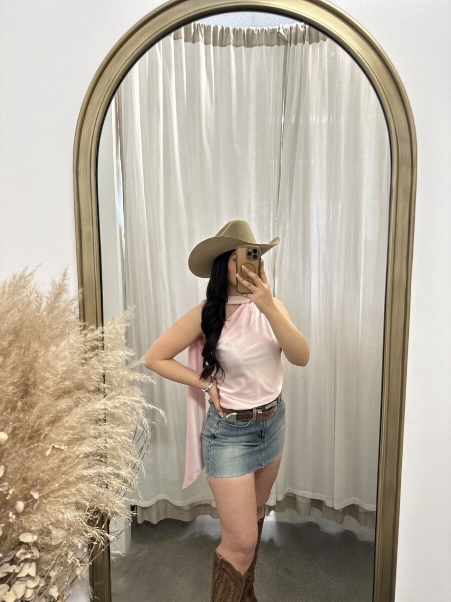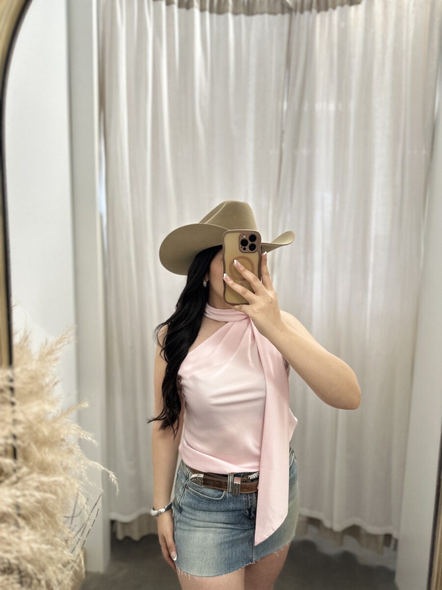 ” Solene ” Satin Scarf-Detail One-Shoulder Top ( Light Pink )