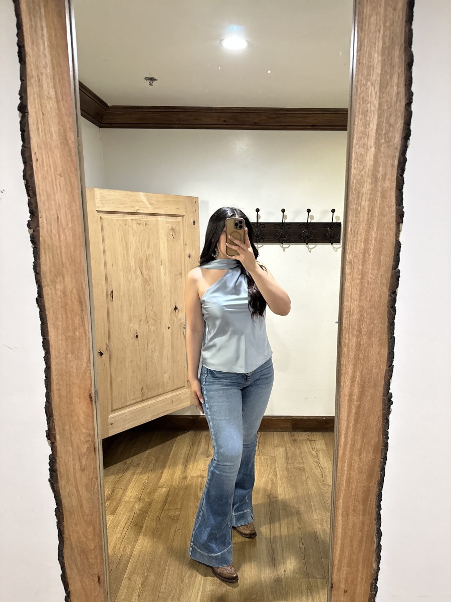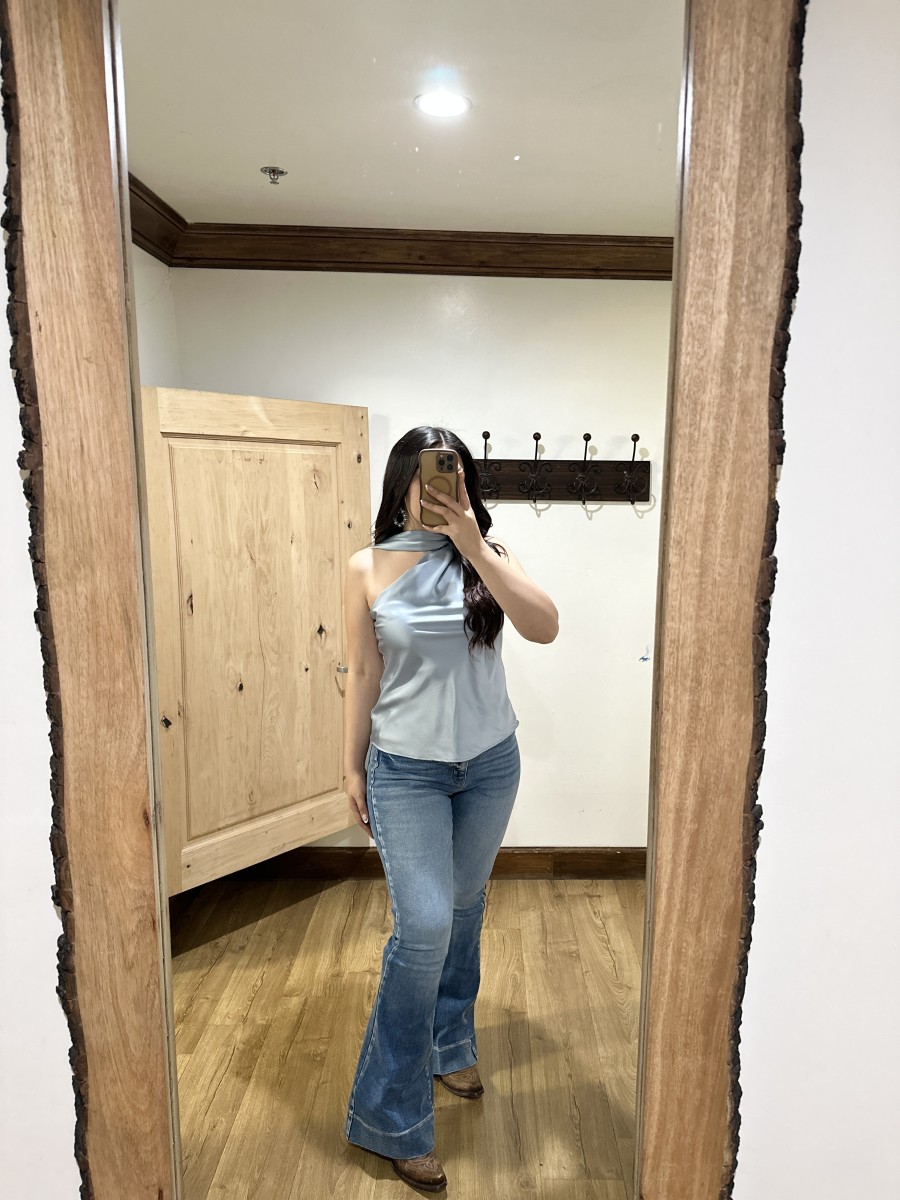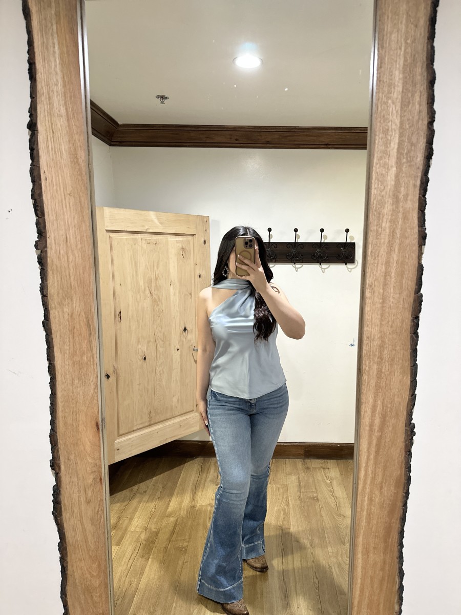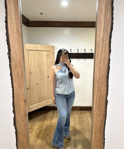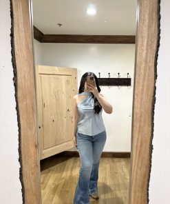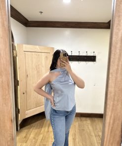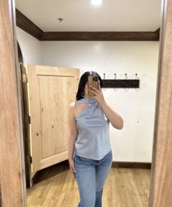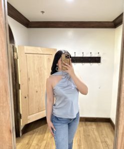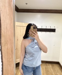 Be the first to review “” Solene ” Satin Scarf-Detail One-Shoulder Top ( Steel Blue )” Cancel reply