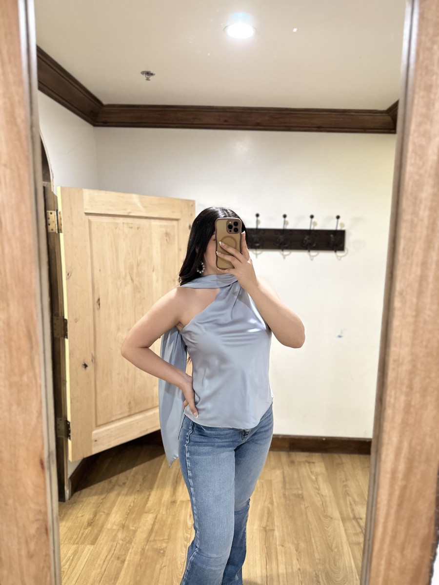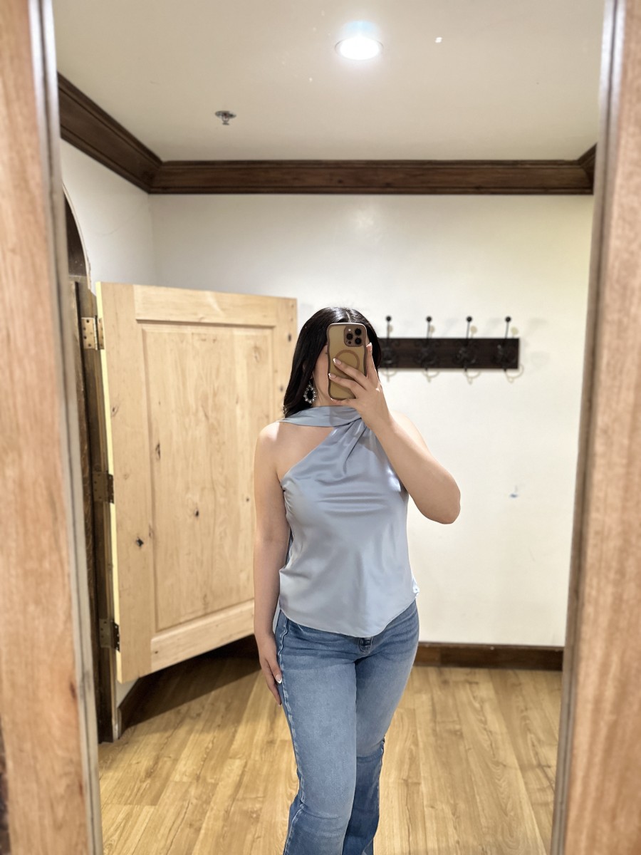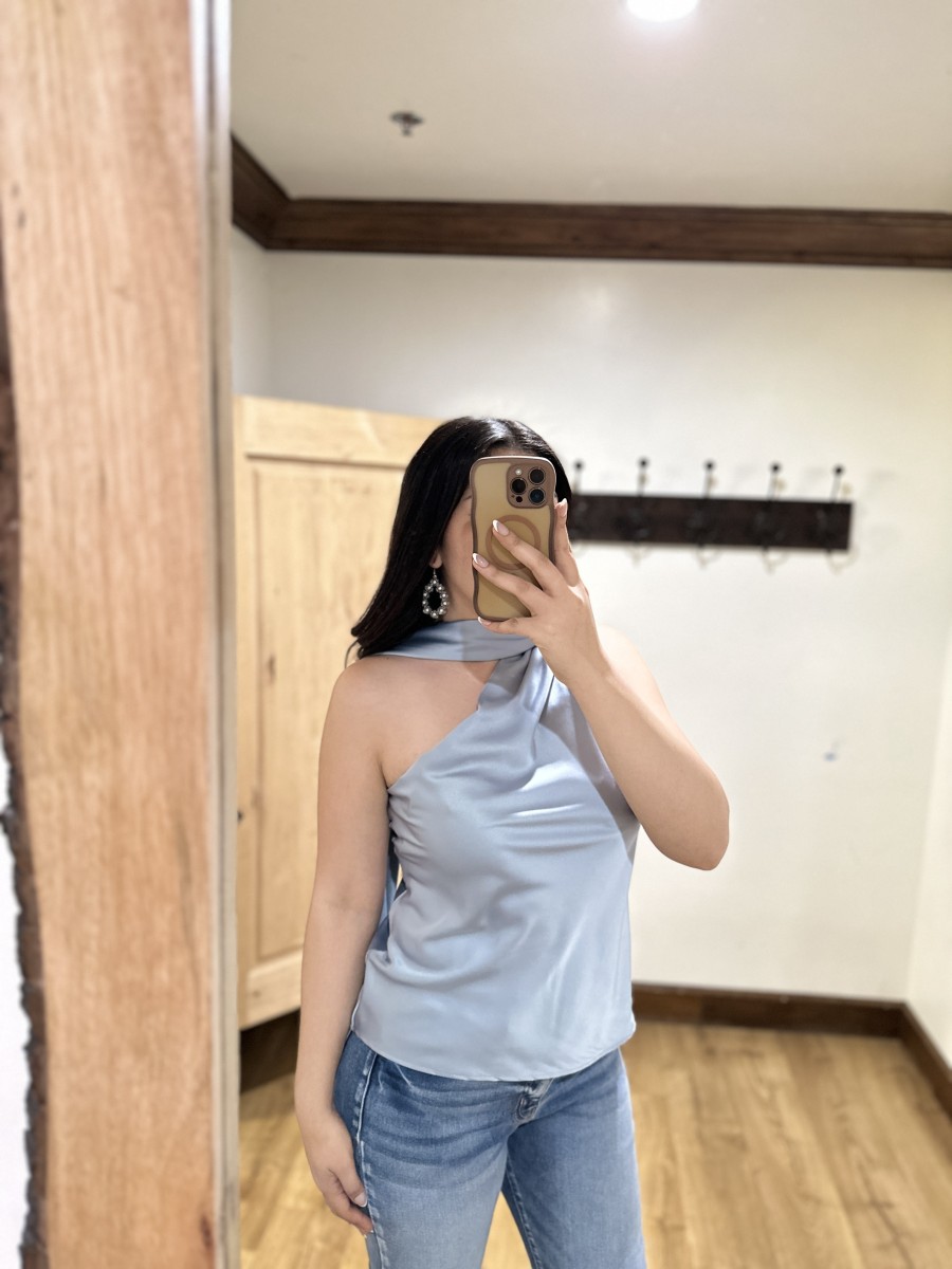” Solene ” Satin Scarf-Detail One-Shoulder Top ( Steel Blue )