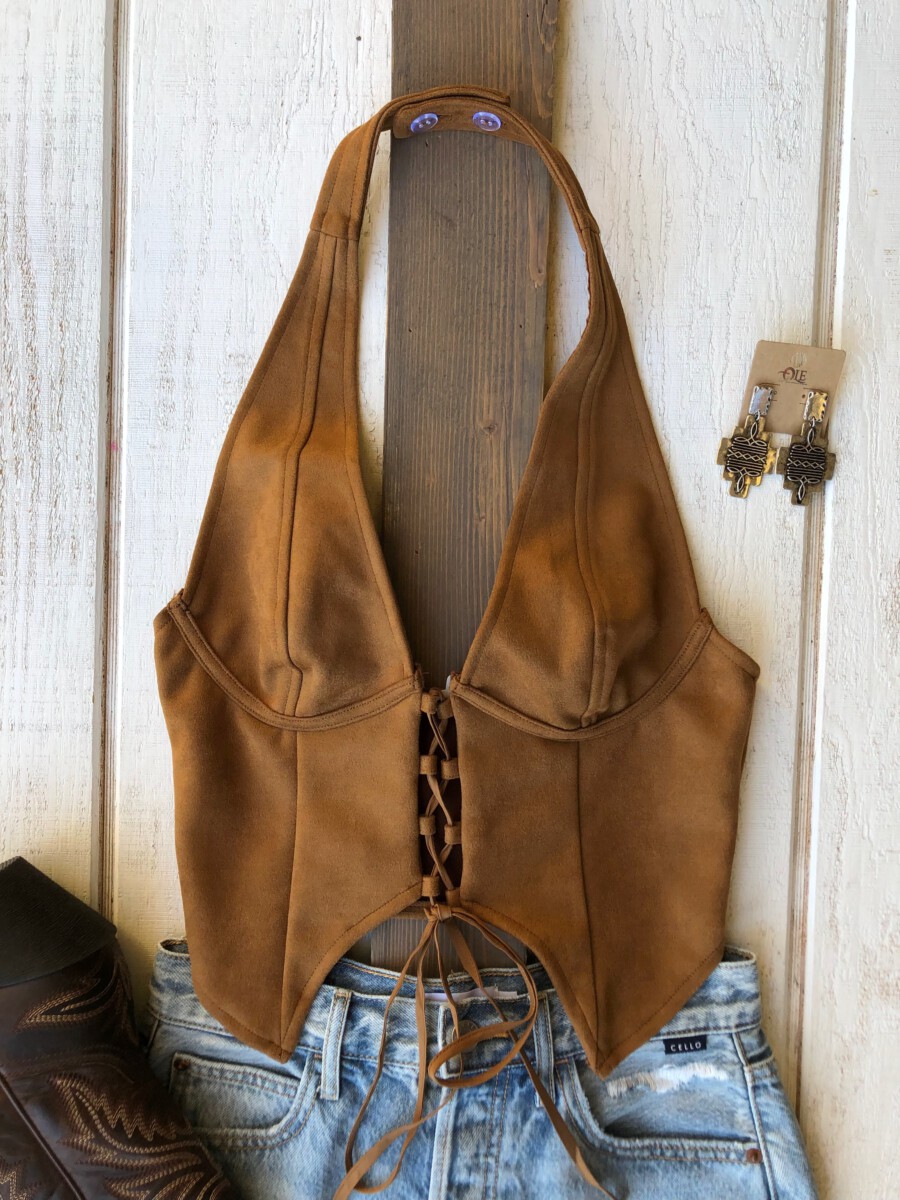 ” Traci ” Halter / Corset Suede Top ( Camel )