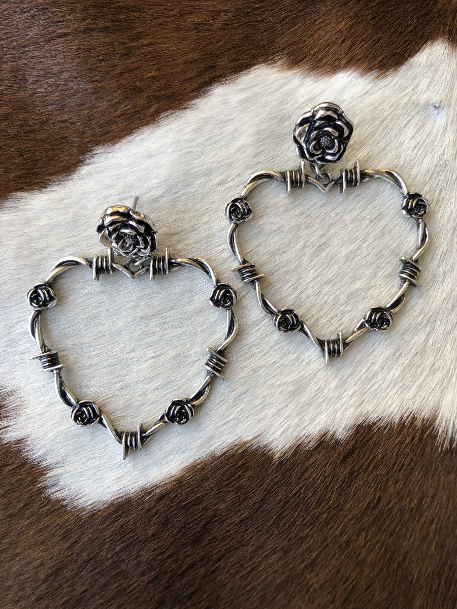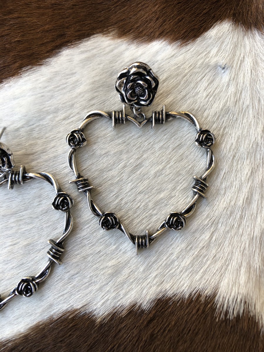 ” Aspen ” Barbed Heart & Rose Earrings ( Silver )