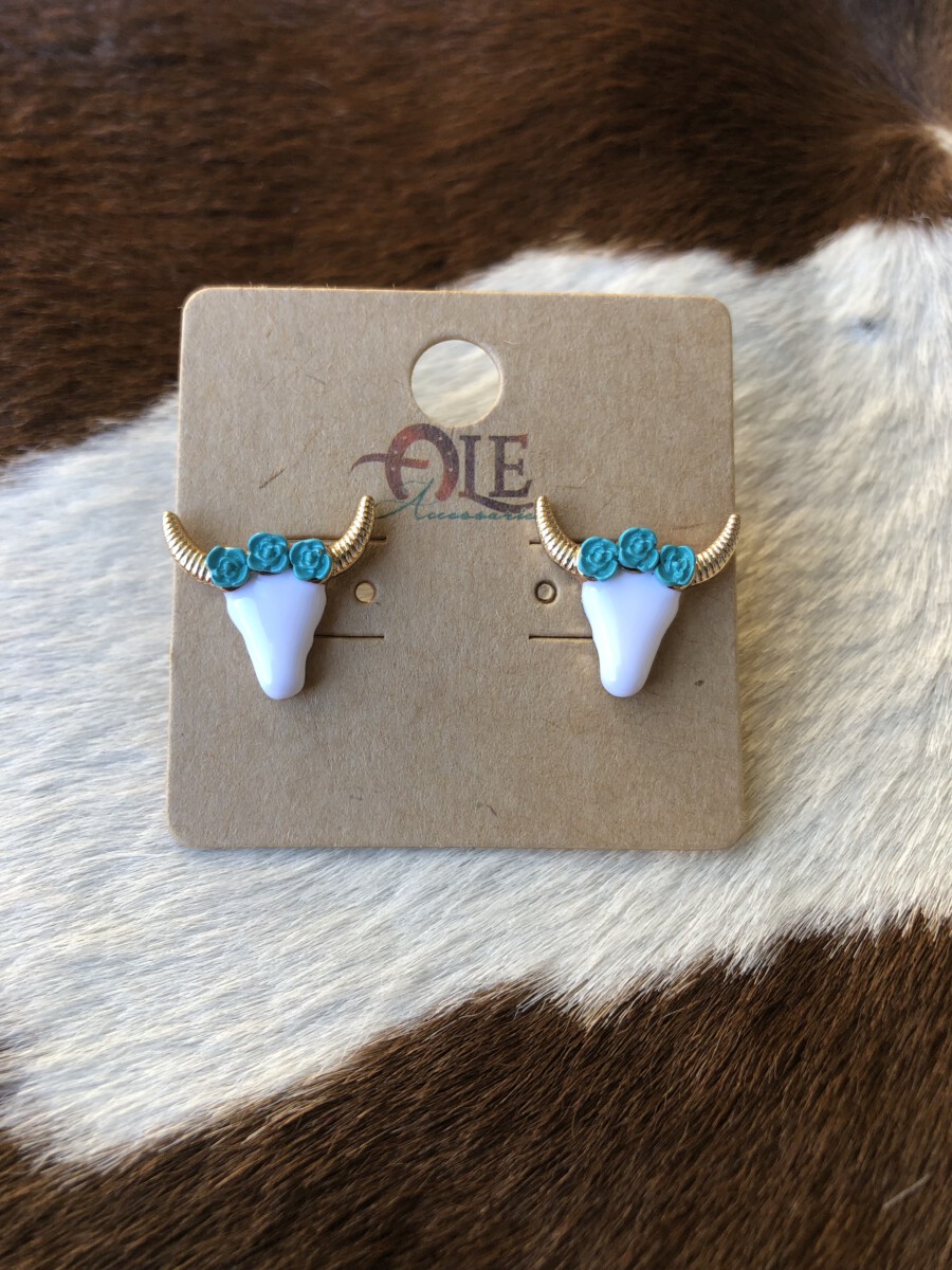 Floral Steer Head Stud Earrings ( Turquoise )